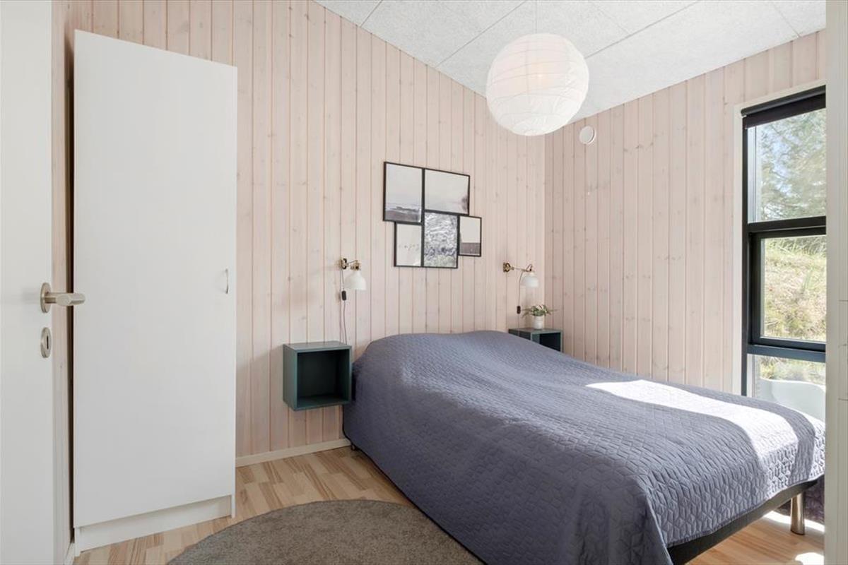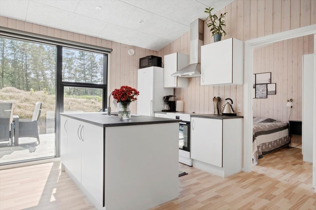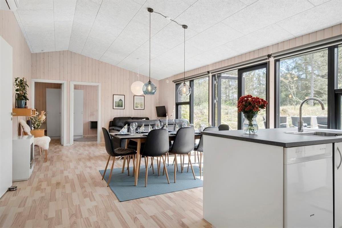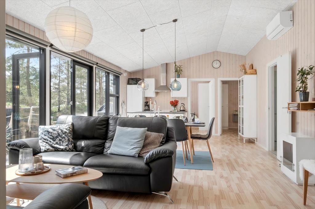 Das Ferienhaus wurde 2020 erbaut, und wie Sie von einem Qualitätsbau erwarten können, ist sowohl auf Ästhetik wie auch Funktionalität Innen besonderen Wert gelegt worden. Mit Akustikdecken, schönen Fußböden und Holzverkleidung an den Wänden ist das Raumgefühl richtig gut, und die großen Fenster geben einen herrlichen Lichteinfall, und gleichzeitig freie Aussicht auf die Bäume des Naturgrundstücks. Im Herzen des Hauses liegt der Aufenthaltsraum, wo die Küche und das Wohnzimmer in schöner Vereinigung sind, und hier haben Sie viel Platz um die ganze Familie zu versammeln. Der moderne Bauplan bietet auch eine Gästetoilette mit Waschmaschine und Trockner, ein Badezimmer mit Eckbadewanne und zuletzt vier gute Schlafzimmer, die alle mit Doppelbetten ausgestattet sind.