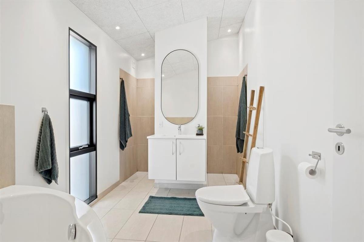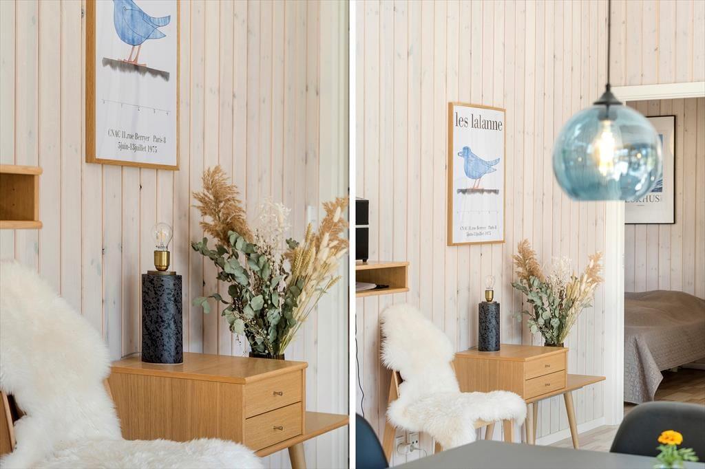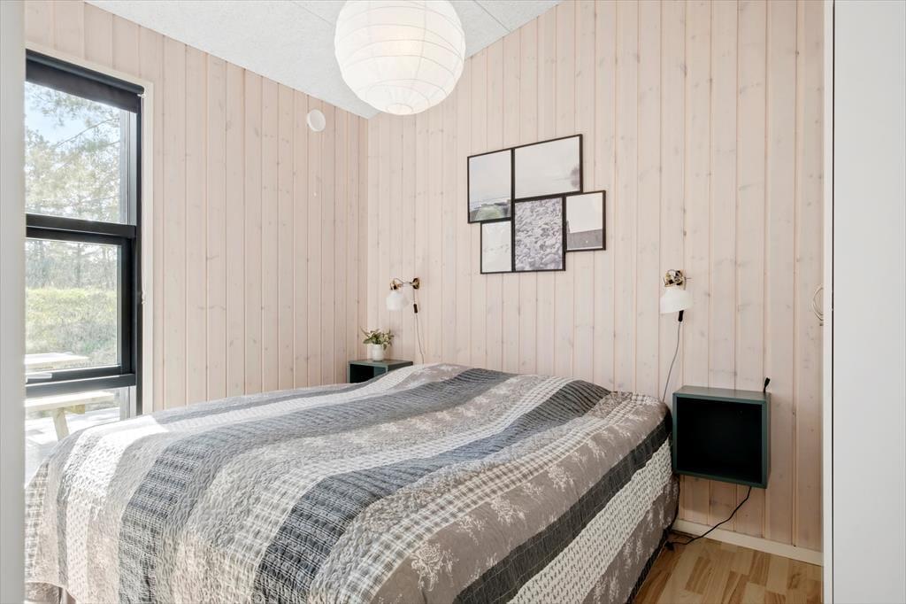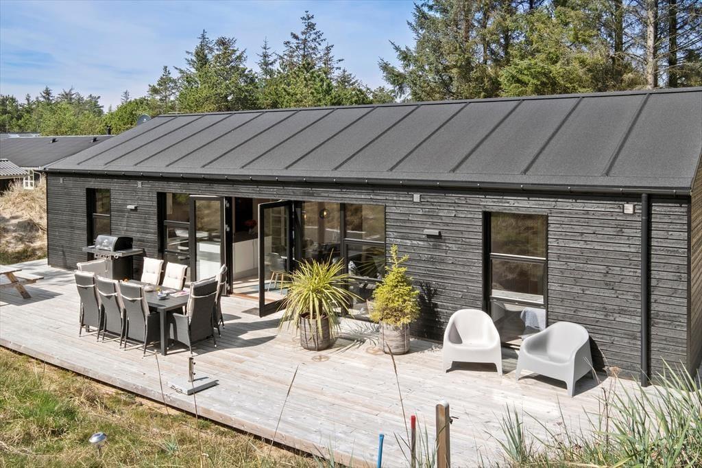 Das Ferienhaus wurde 2020 erbaut, und wie Sie von einem Qualitätsbau erwarten können, ist sowohl auf Ästhetik wie auch Funktionalität Innen besonderen Wert gelegt worden. Mit Akustikdecken, schönen Fußböden und Holzverkleidung an den Wänden ist das Raumgefühl richtig gut, und die großen Fenster geben einen herrlichen Lichteinfall, und gleichzeitig freie Aussicht auf die Bäume des Naturgrundstücks. Im Herzen des Hauses liegt der Aufenthaltsraum, wo die Küche und das Wohnzimmer in schöner Vereinigung sind, und hier haben Sie viel Platz um die ganze Familie zu versammeln. Der moderne Bauplan bietet auch eine Gästetoilette mit Waschmaschine und Trockner, ein Badezimmer mit Eckbadewanne und zuletzt vier gute Schlafzimmer, die alle mit Doppelbetten ausgestattet sind.