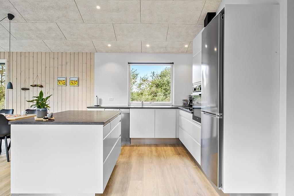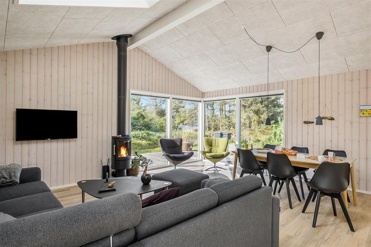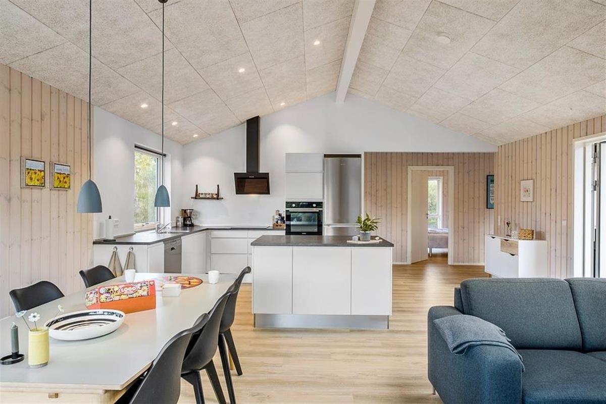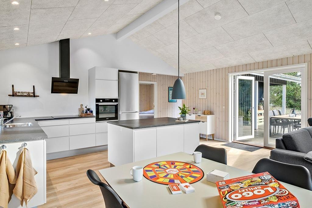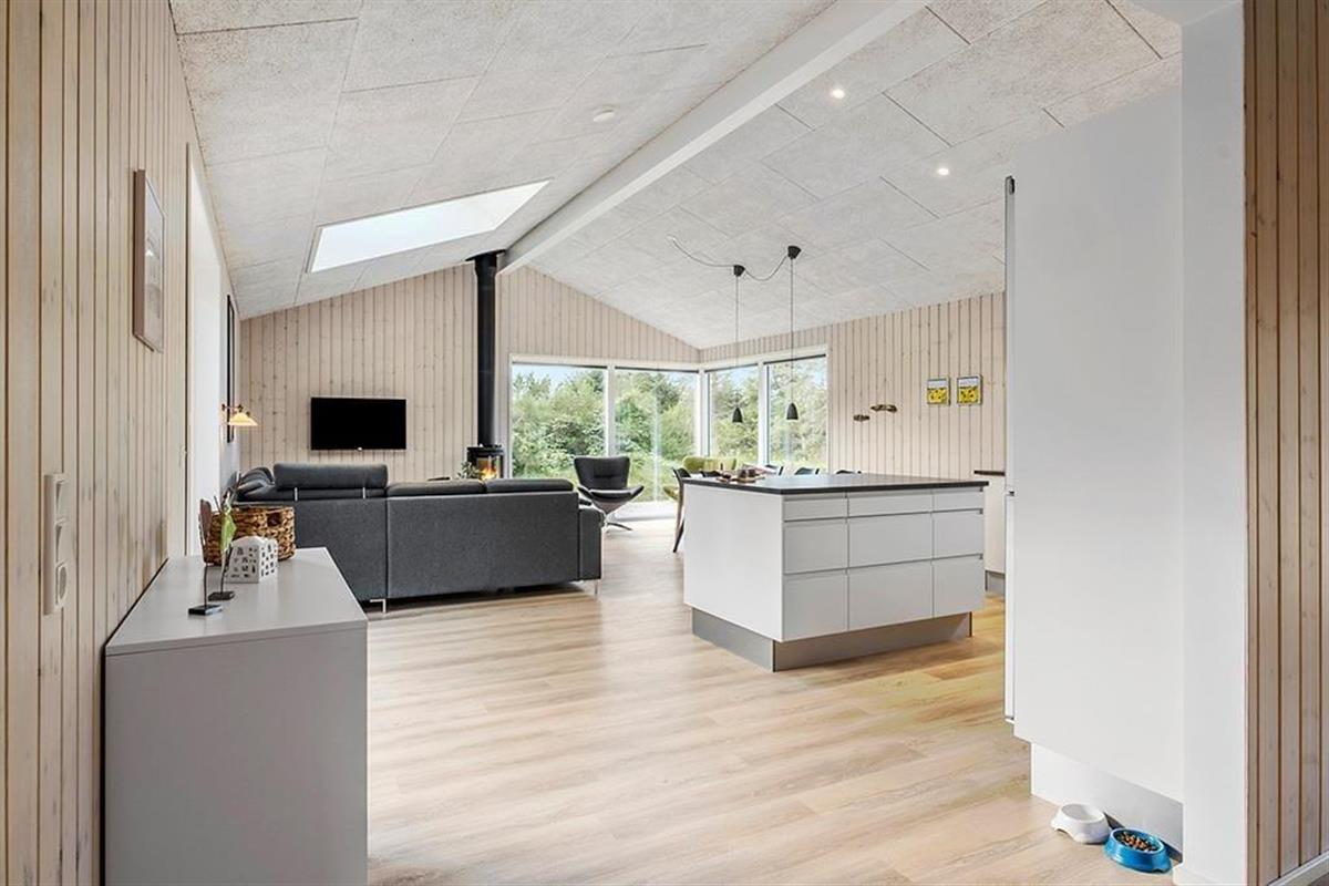 Das im Jahr 2018 errichtete Ferienhaus besticht in Bezug auf die Einrichtung und das Interieur mit einem ausgesprochen hohen Standard. Hier werden Sie vom ersten Moment an spüren, dass der Besitzer viel Sinn für die Schaffung von schönen und guten Gemeinschaftsbereichen gezeigt hat. Dank der großen Fensterpartien genießen Sie zudem das Gefühl, dass das Hausinnere und die wunderschöne Natur ringsum nahezu verschmelzen. Das Herzstück des Hauses bildet der große, helle Aufenthaltsraum, der mit einer warmen und einladenden Wohnatmosphäre begeistert. Freuen Sie sich in diesem Raum auf hohe Decken und Dachflächenfenster, die unglaublich viel Tageslicht durch den Raum strömen lassen. Die Einrichtung ist funktionell und umfasst einen Esstisch, eine Sofagruppe und eine Leseecke. Die moderne Küche ist selbstverständlich offen in den Raum integriert, sodass Sie selbst während der Zubereitung der Mahlzeiten am Familiengeschehen im Wohnraum teilhaben. Zur Wohnfläche zählen darüber hinaus auch drei Schlafräume, ein tolles Badezimmer und ein Gäste-WC.