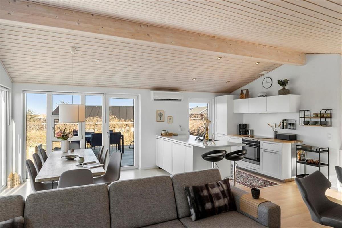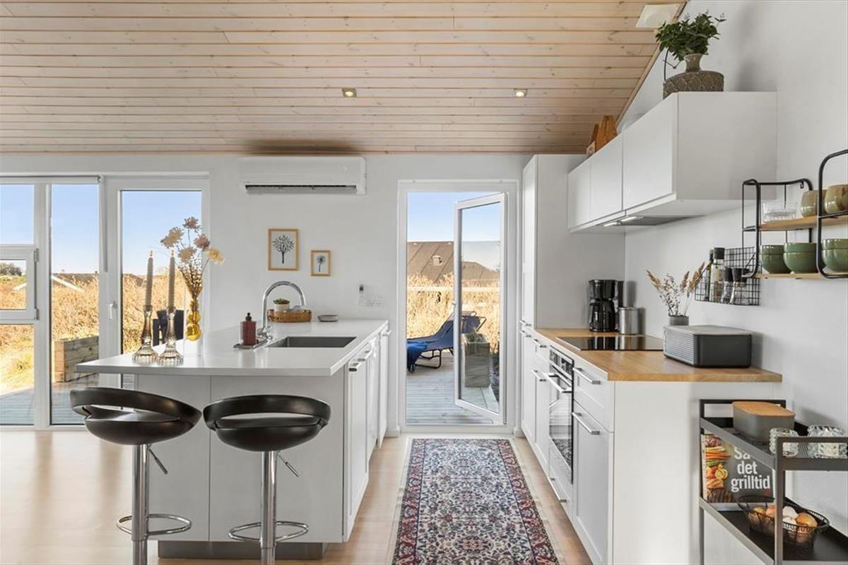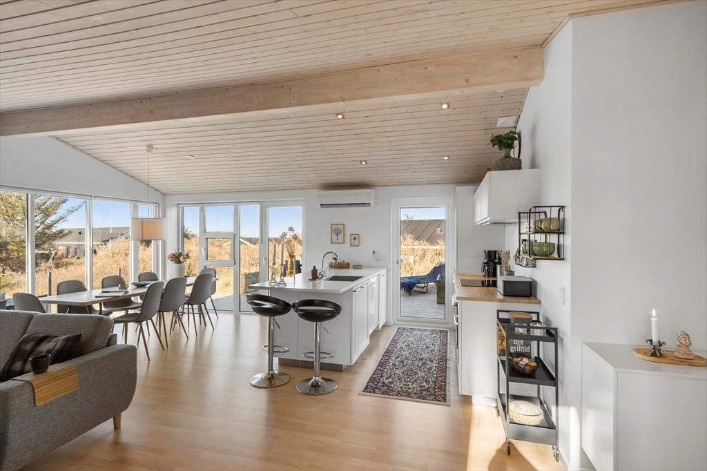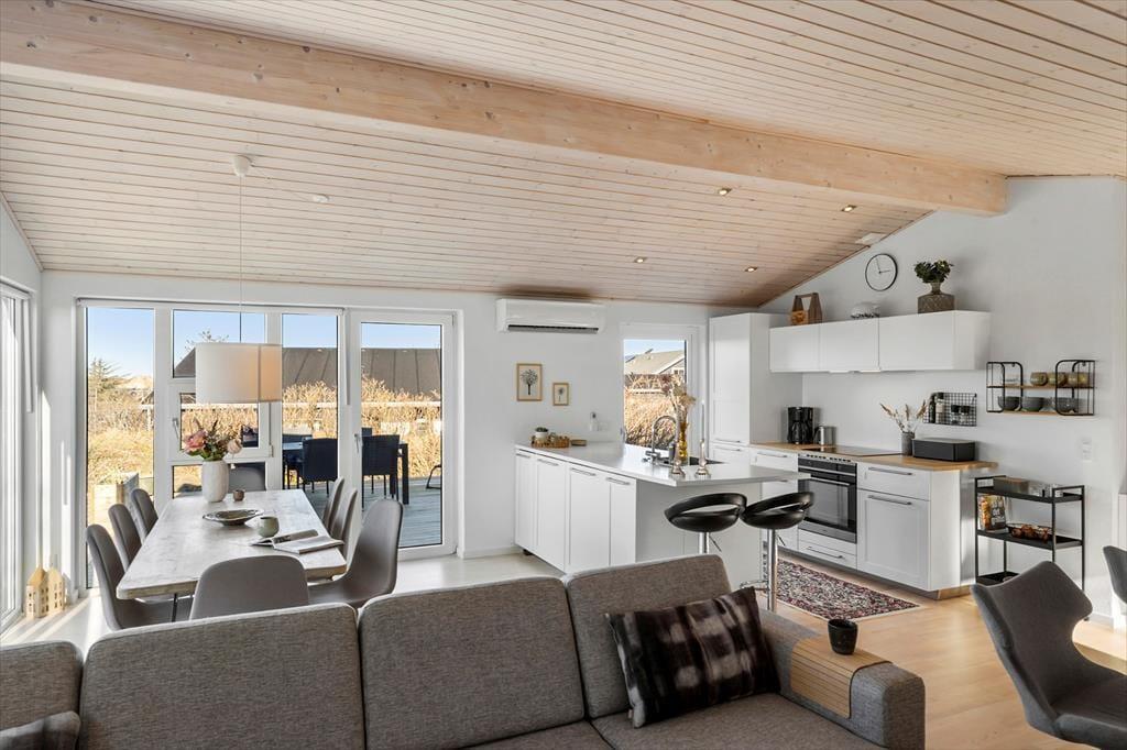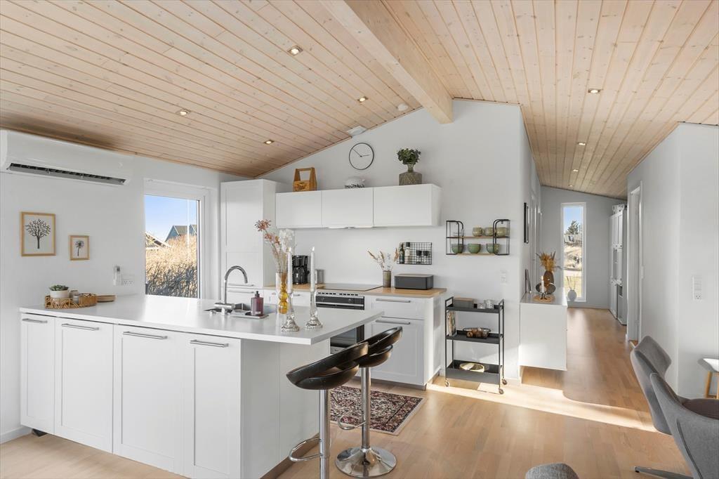 Sobald du in dieses charmante Ferienhaus trittst, wirst du von einem offenen und einladenden Wohnbereich mit hohen Decken empfangen, der eine geräumige und helle Atmosphäre schafft. Der Kaminofen in der Ecke lädt zu gemütlichen Abenden mit Wärme und Licht ein, während die großen Fenster einen schönen Blick auf das hügelige Naturgrundstück rund um das Haus bieten. Der Wohn-Essbereich ist der perfekte Treffpunkt für die ganze Familie, und mit Platz für sowohl Kochen als auch geselliges Beisammensein ist es ein schöner Ort, um Zeit miteinander zu verbringen. Hier kannst du auch nach einem langen Tag auf dem Sofa entspannen und dich auf das nächste Abenteuer in Blokhus vorbereiten.