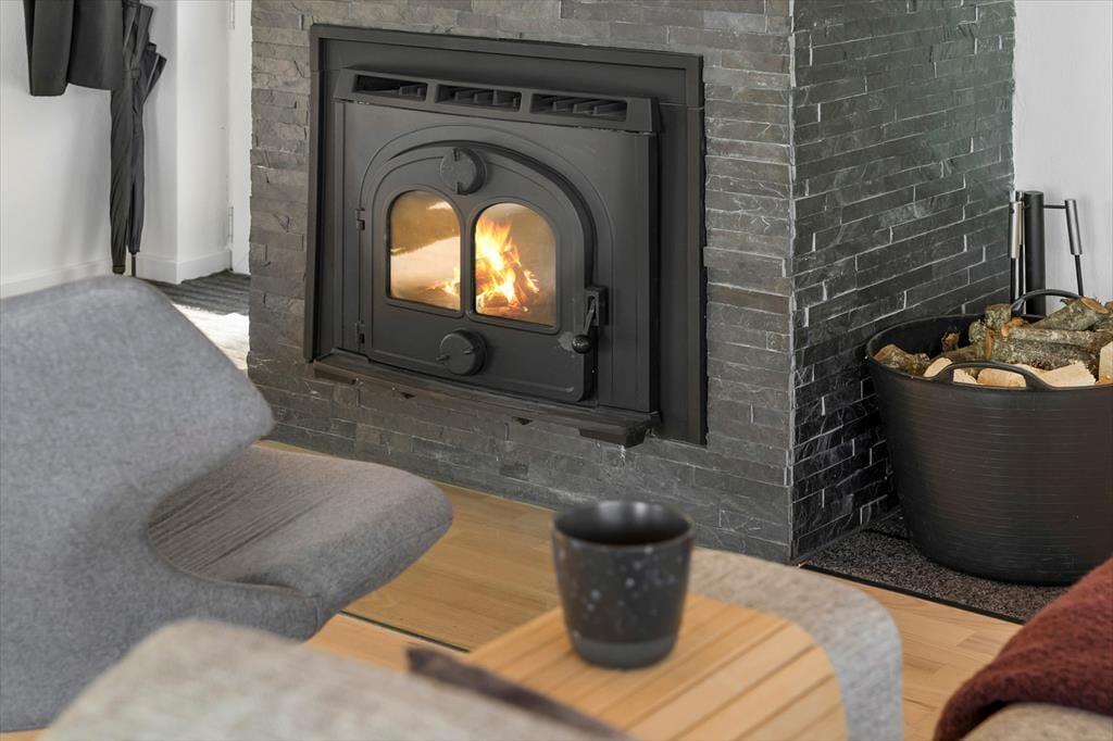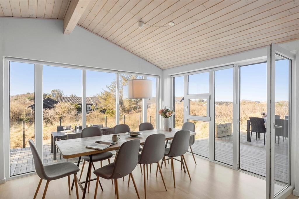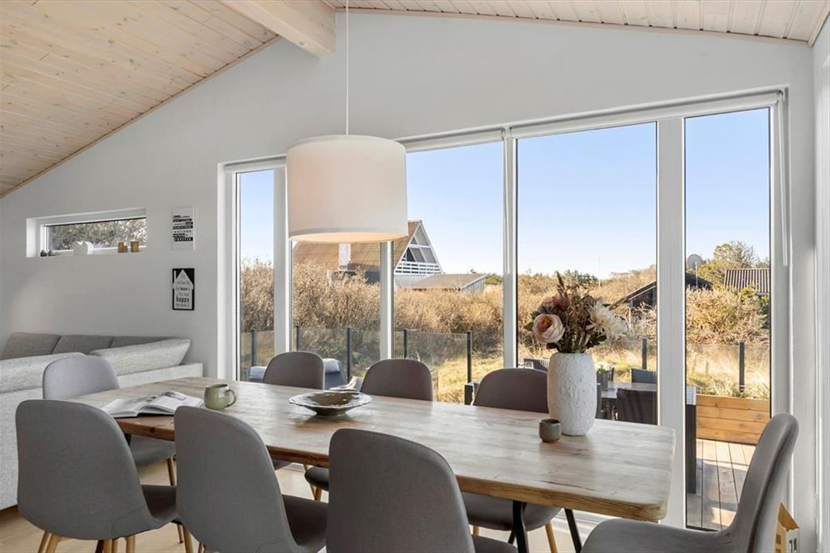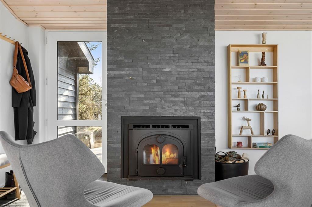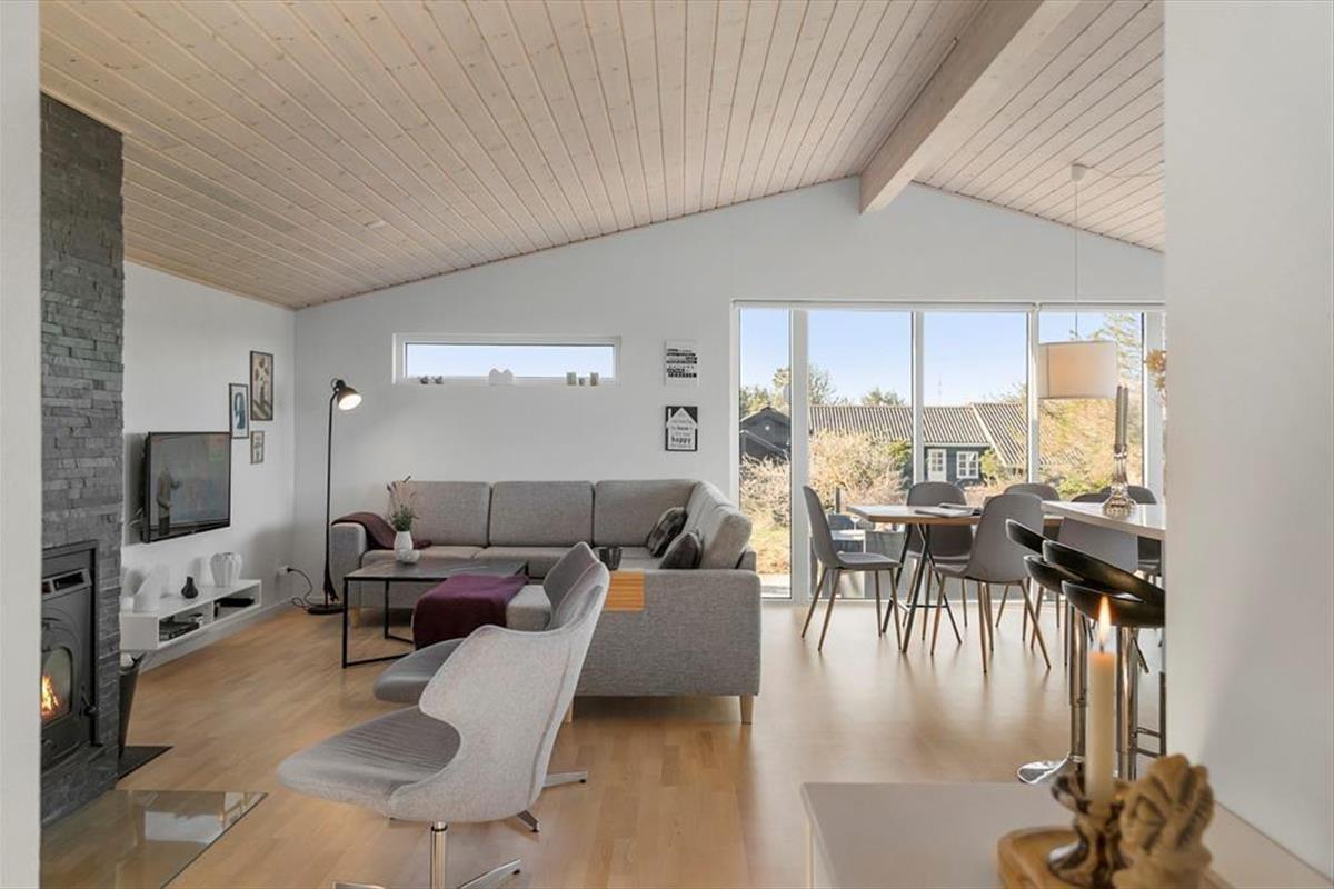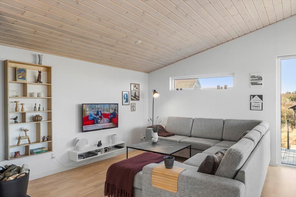 Sobald du in dieses charmante Ferienhaus trittst, wirst du von einem offenen und einladenden Wohnbereich mit hohen Decken empfangen, der eine geräumige und helle Atmosphäre schafft. Der Kaminofen in der Ecke lädt zu gemütlichen Abenden mit Wärme und Licht ein, während die großen Fenster einen schönen Blick auf das hügelige Naturgrundstück rund um das Haus bieten. Der Wohn-Essbereich ist der perfekte Treffpunkt für die ganze Familie, und mit Platz für sowohl Kochen als auch geselliges Beisammensein ist es ein schöner Ort, um Zeit miteinander zu verbringen. Hier kannst du auch nach einem langen Tag auf dem Sofa entspannen und dich auf das nächste Abenteuer in Blokhus vorbereiten.