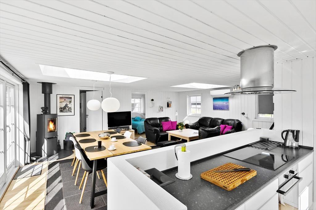 Sobald du das Haus betrittst, wirst du von einem hellen und freundlichen Inneren begrüßt, in dem das Licht durch große Fenster strömt und den Räumen eine offene und einladende Atmosphäre verleiht. Das Wohnzimmer ist der perfekte Treffpunkt, um dich vor dem Kaminofen zu entspannen, während du ein gutes Buch liest oder dich mit anderen unterhältst. Der offene Grundriss zwischen Wohnzimmer und Küche macht es einfach, Zeit miteinander zu verbringen, auch während des Kochens. Die gut eingerichteten Schlafzimmer bieten einen gemütlichen Rückzugsort, wenn du etwas Ruhe und Entspannung brauchst.
