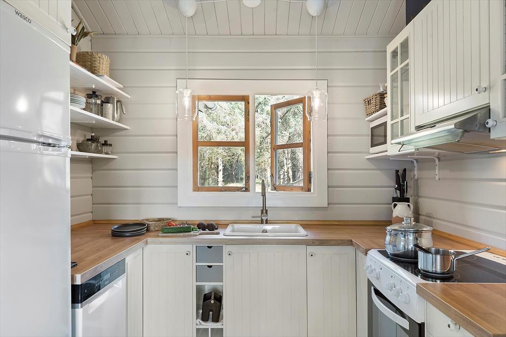 Wenn du das Ferienhaus betrittst, wirst du von einer hellen und einladenden Atmosphäre begrüßt. Das offene Wohnzimmer mit Kaminofen schafft eine gemütliche und warme Stimmung, und hier kannst du dich mit deinen Liebsten nach einem langen Tag entspannen. Die großen Fenster sorgen für ein fantastisches Licht, das dem gesamten Haus eine luftige und offene Atmosphäre verleiht. Hier hast du sowohl Platz zum Entspannen als auch zum geselligen Beisammensein – sei es beim Lesen eines guten Buches vor dem Kamin oder beim Spielen eines Brettspiels am Esstisch. Die schöne Einrichtung unterstützt einen ungestörten und entspannenden Urlaub.