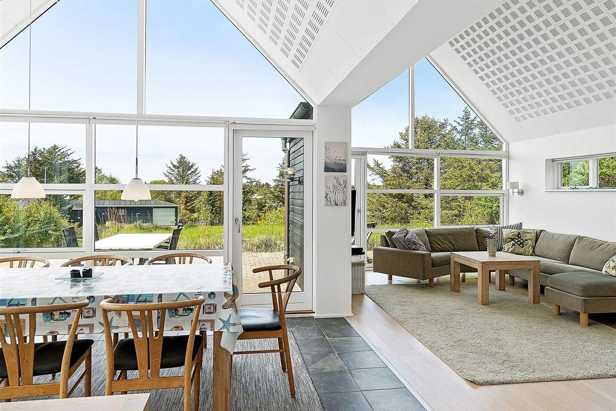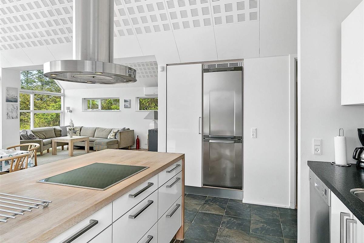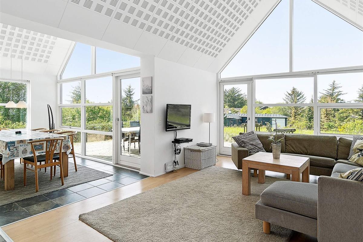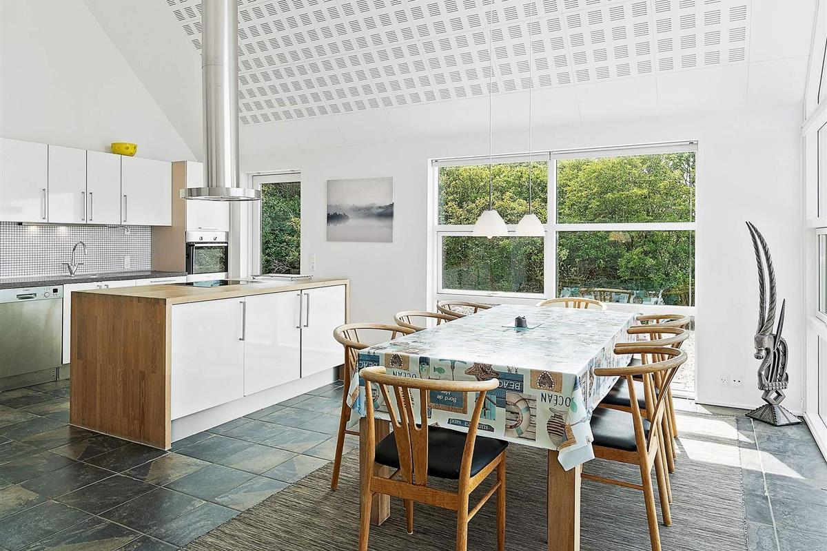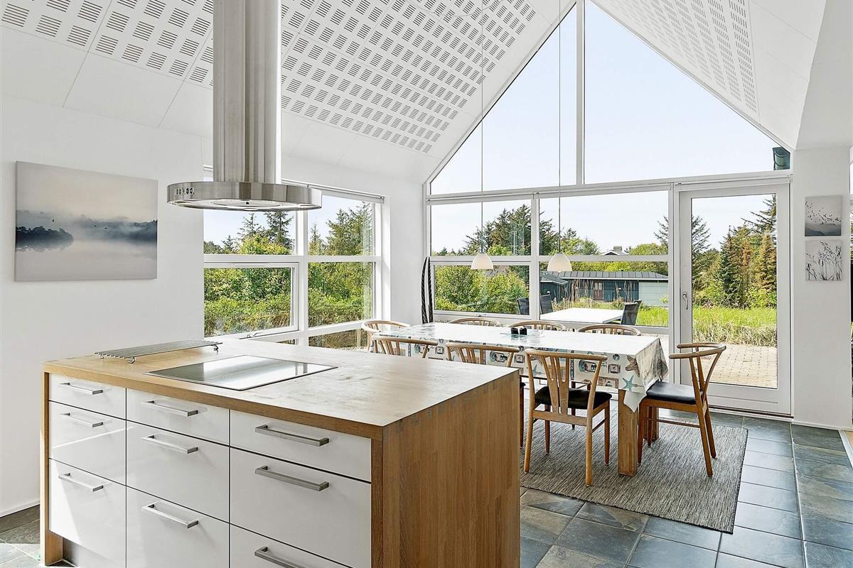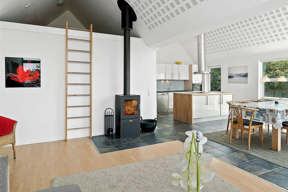 Das moderne Ferienhaus hat einen hellen Küchen-/Wohnbereich für das Familienleben, mit Zugang zur Terrasse davor. Die Küche ist zeitgemäß ausgestattet und bietet ebenso wie der Essbereich davor herrlichen Ausblick in die grüne Umgebung. Die offene Zimmerdecke bis zum First und die großen Fensterflächen sorgen im ganzen Raum für ein luftiges und lichtdurchflutetes Wohnambiente. Im Wohnbereich steht eine gemütliche Sitzecke bereit. Zudem gibt es einen Holzofen für kühlere Tage sowie WLAN und einige deutsche TV-Sender im Haus.