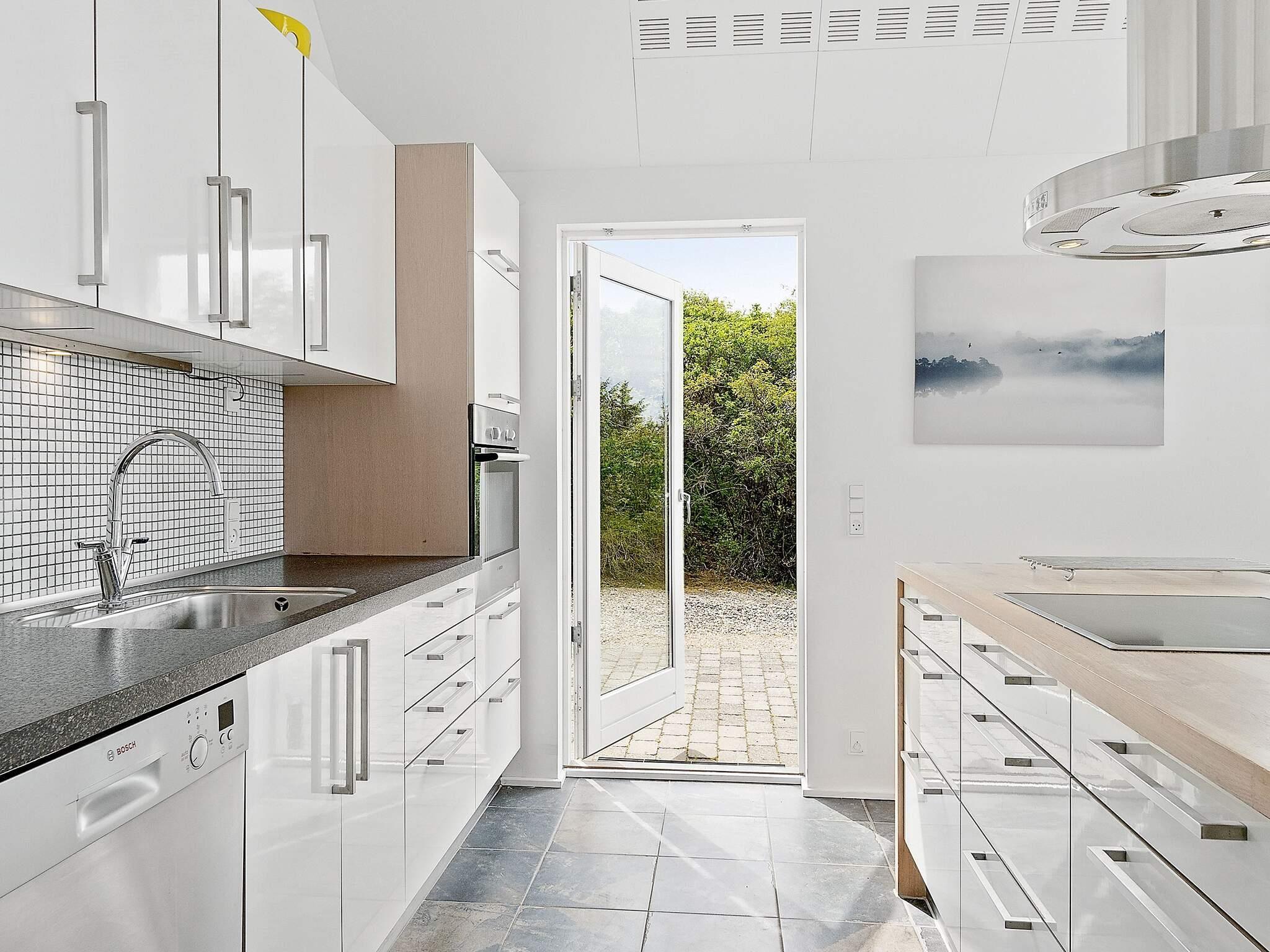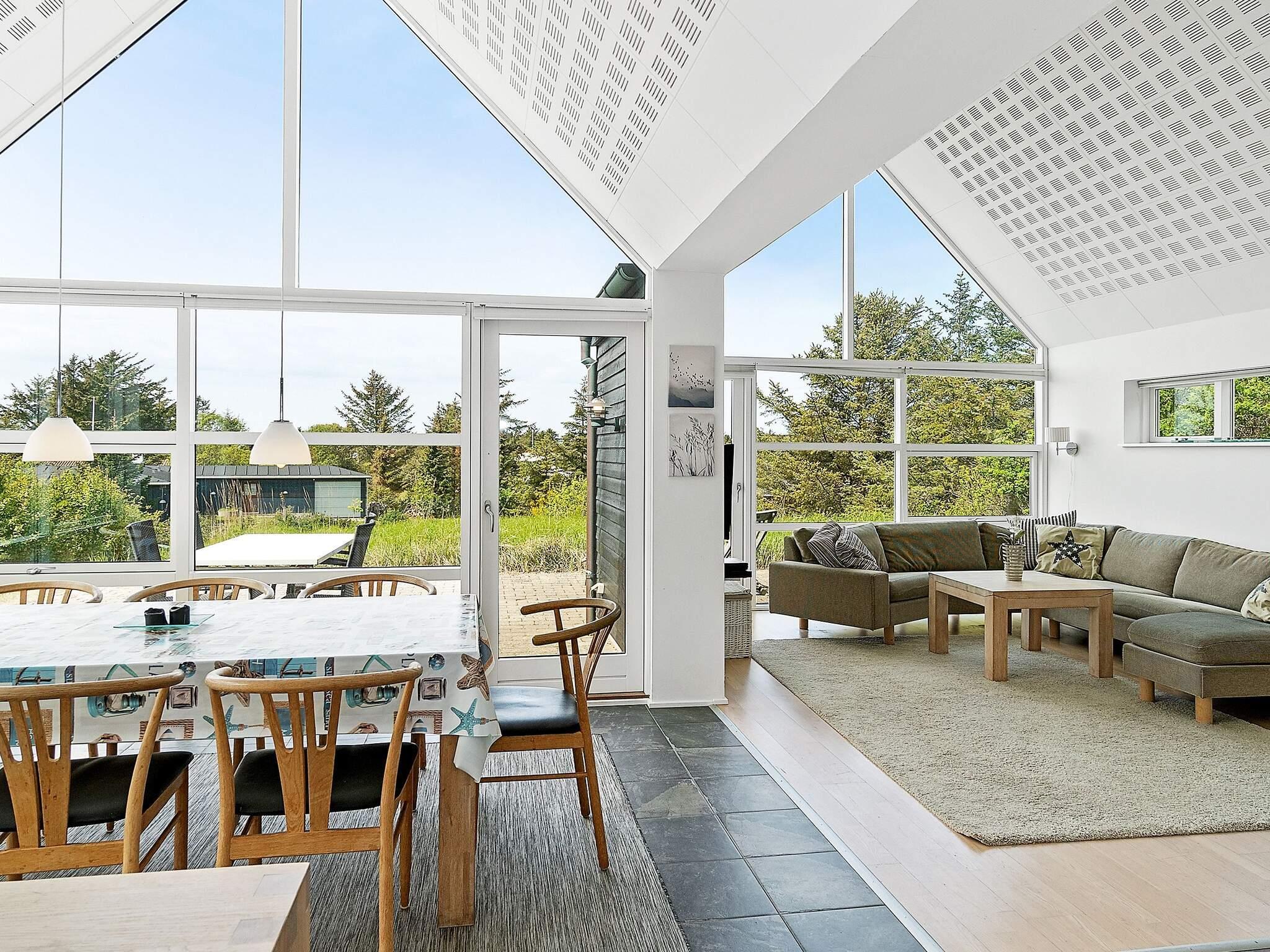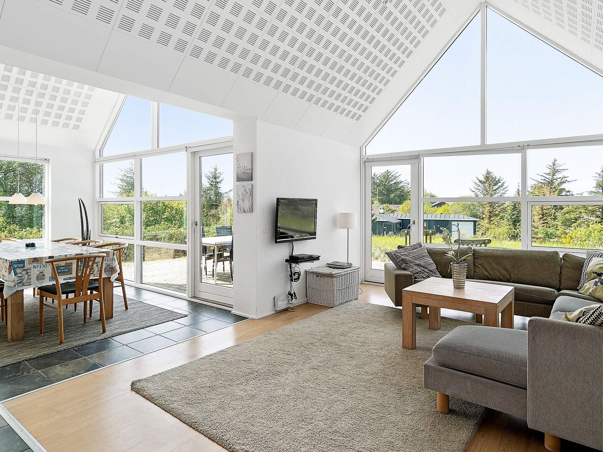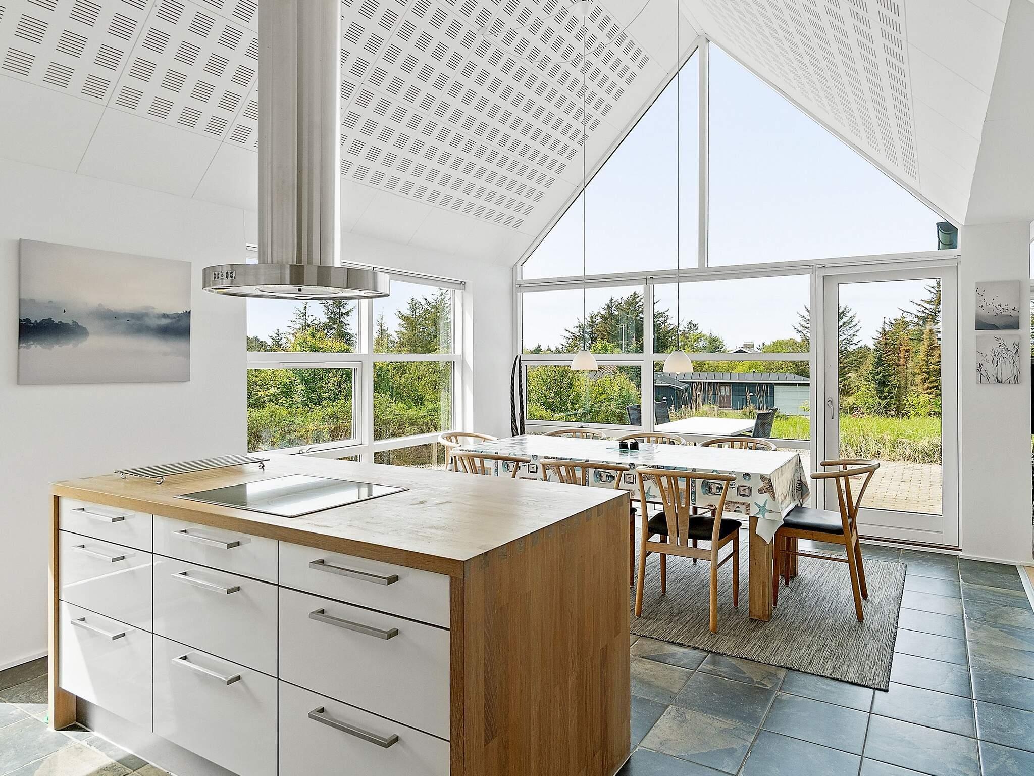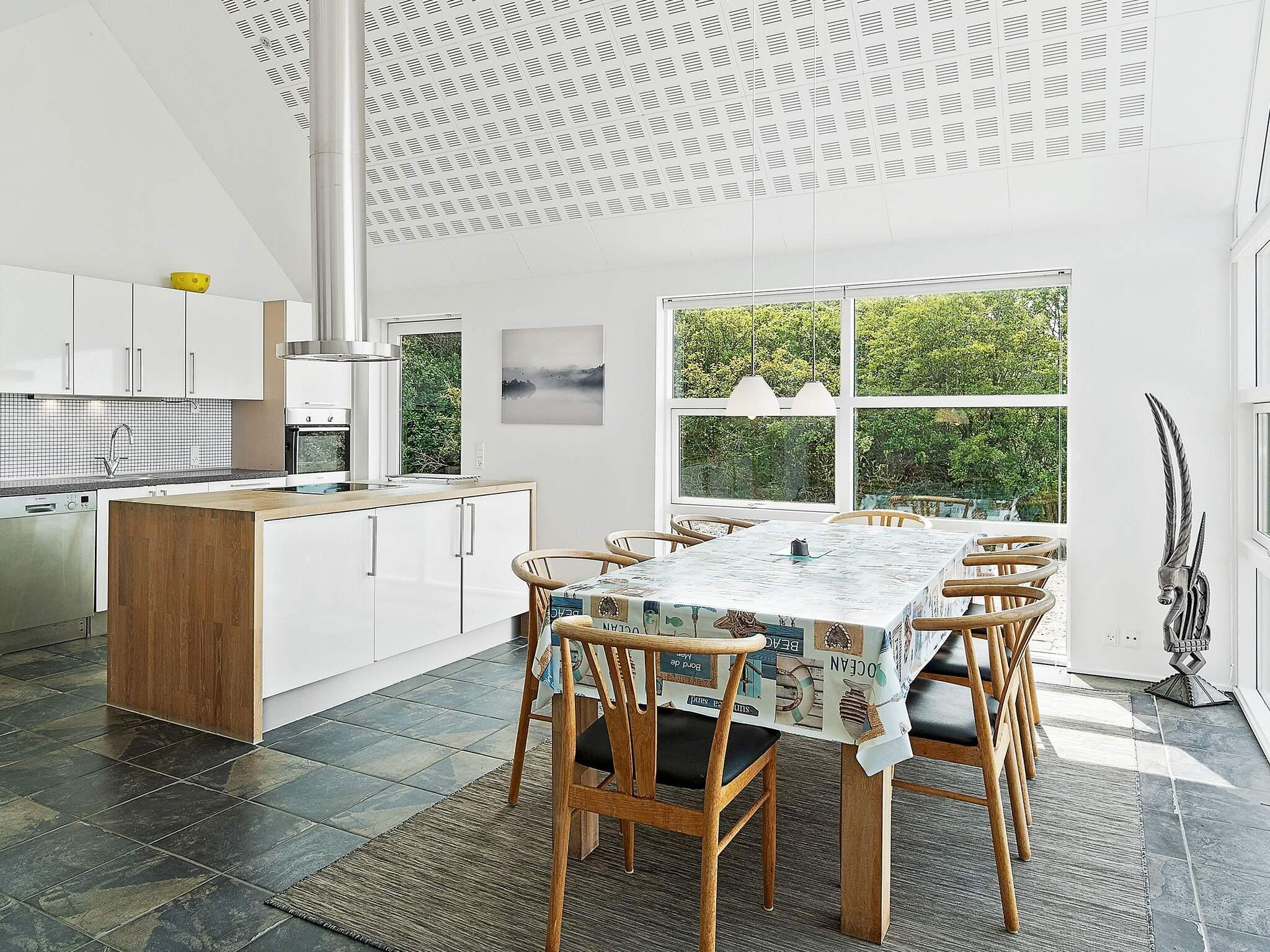 Das moderne Ferienhaus hat einen hellen Küchen-/Wohnbereich für das Familienleben, mit Zugang zur Terrasse davor. Die Küche ist zeitgemäß ausgestattet und bietet ebenso wie der Essbereich davor herrlichen Ausblick in die grüne Umgebung. Die offene Zimmerdecke bis zum First und die großen Fensterflächen sorgen im ganzen Raum für ein luftiges und lichtdurchflutetes Wohnambiente. Im Wohnbereich steht eine gemütliche Sitzecke bereit. Zudem gibt es einen Holzofen für kühlere Tage sowie WLAN und einige deutsche TV-Sender im Haus.