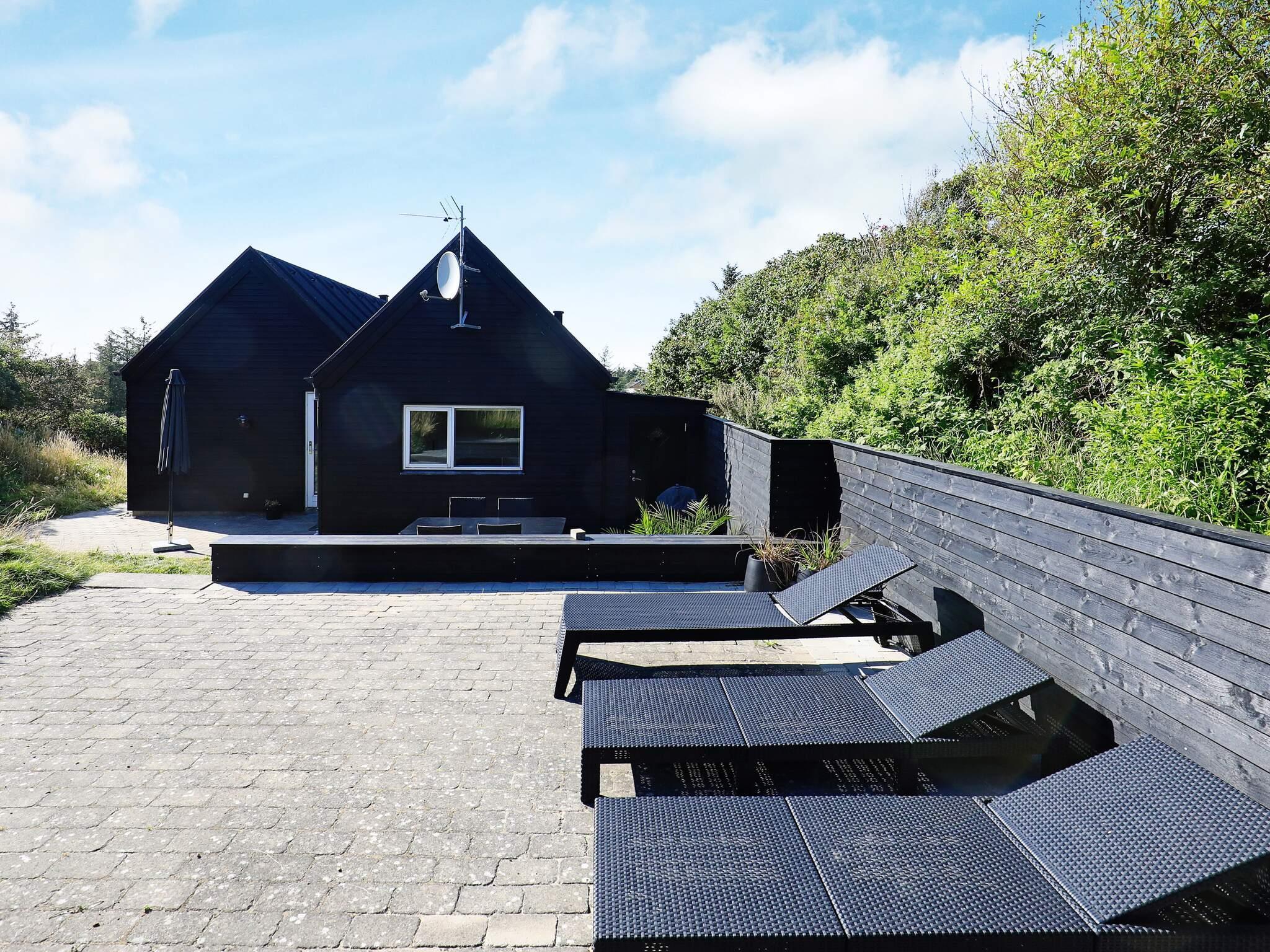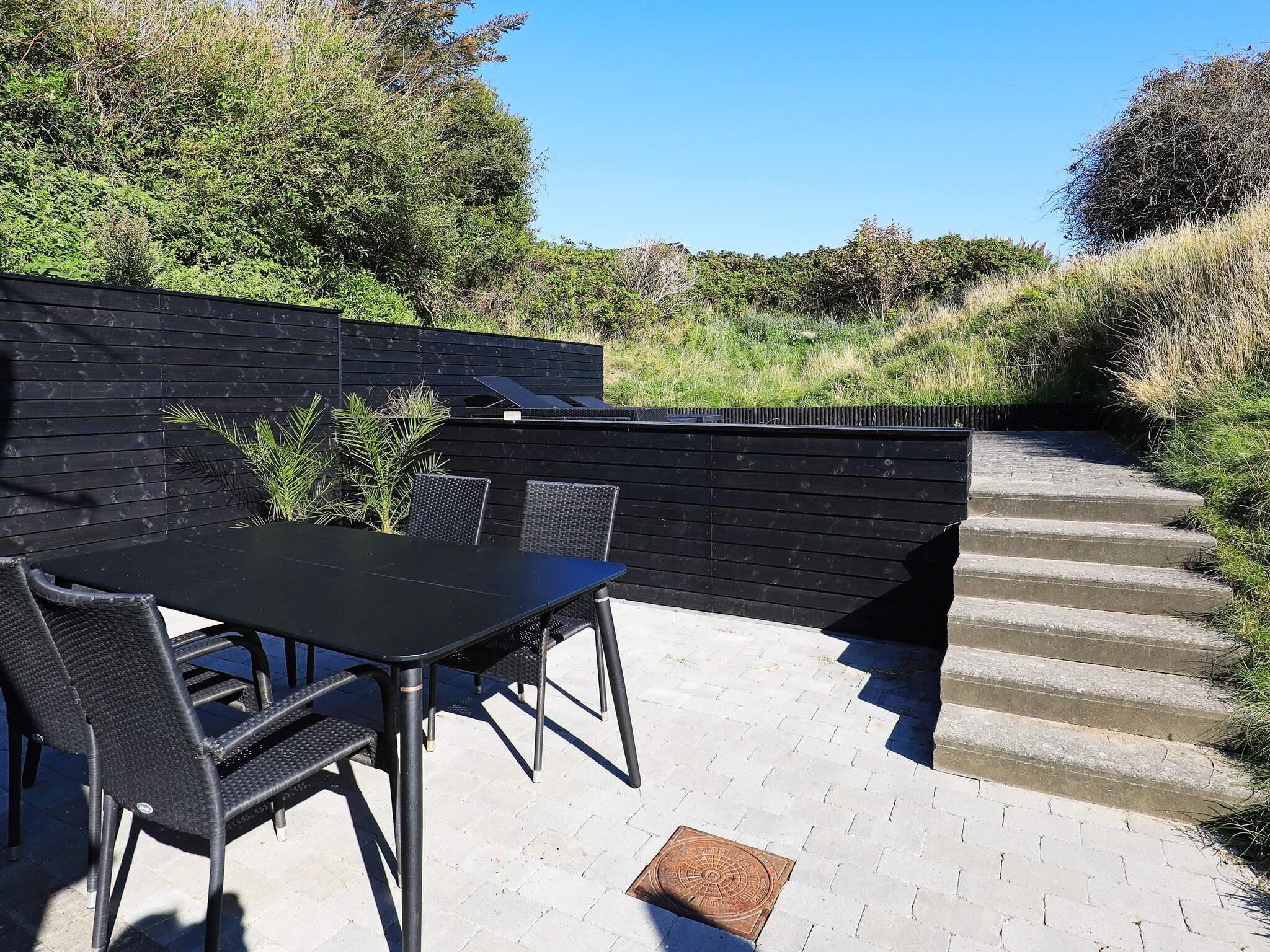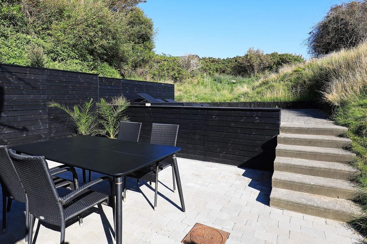 Im Außenbereich steht eine größere Terrassenfläche zur Verfügung, darunter auch eine gänzlich abgeschirmte Ostterrasse hinter dem Haus. Genießen Sie die Sonnentage oder Grillabende draußen an der frischen Luft und dennoch gut geschützt vor der Meeresbrise. Das Ferienhaus liegt auf einem hügeligen Naturgrundtück, das je nach Wunsch und Tageszeit Sonne oder Schatten bietet.