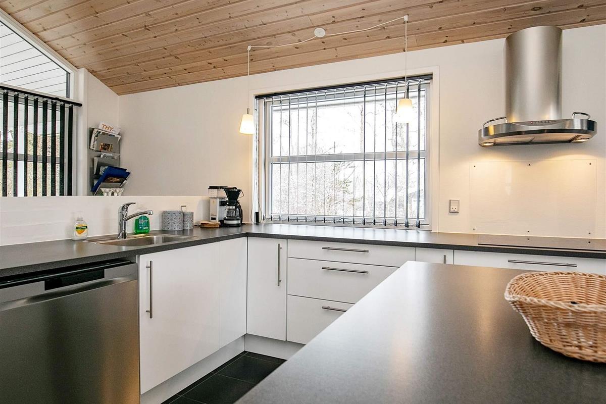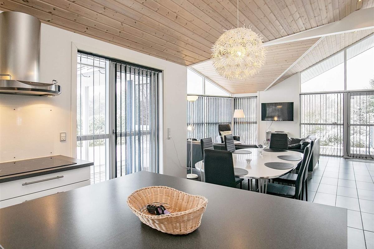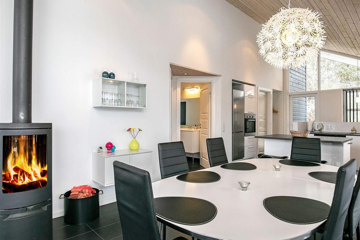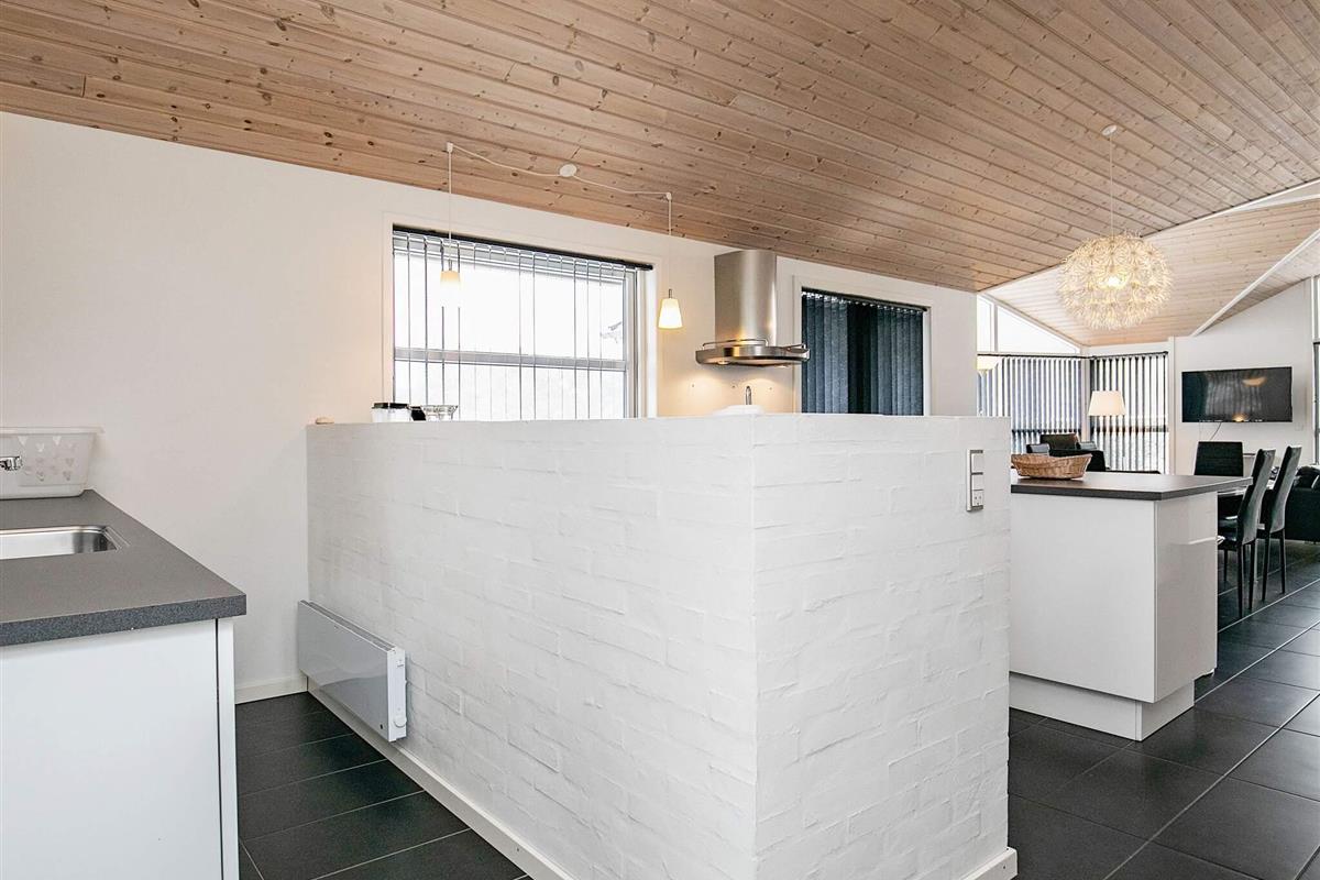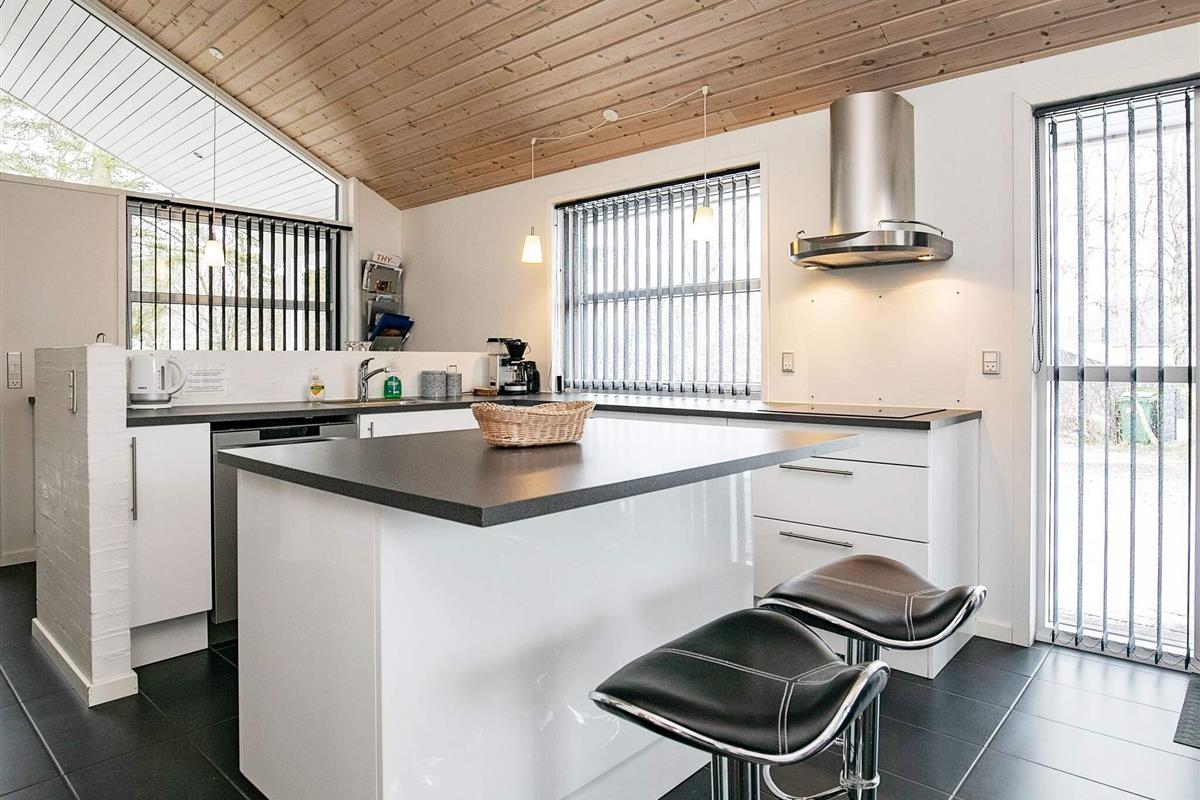 Ansprechendes Ferienhaus bei Blokhus, gut eingerichtet und hell und luftig gestaltet. Offener Küchen-/Wohnbereich für das Familienleben. Vom gemütlichen Wohnbereich hat man Zutritt zu einer schönen Terrassenfläche, die sich um das Haus herum erstreckt. Der Kaminofen des Hauses wurde mittig im Raum platziert, sodass das Feuer von mehren Seiten aus genossen werden kann.