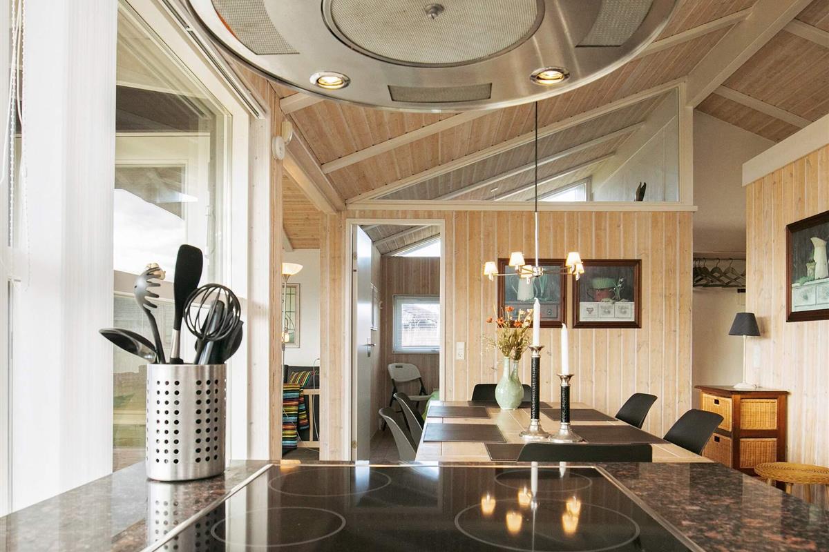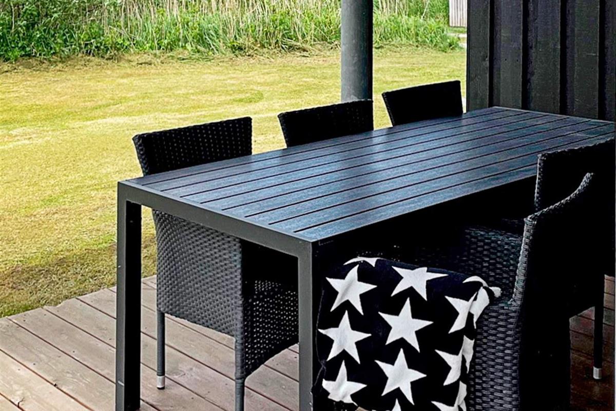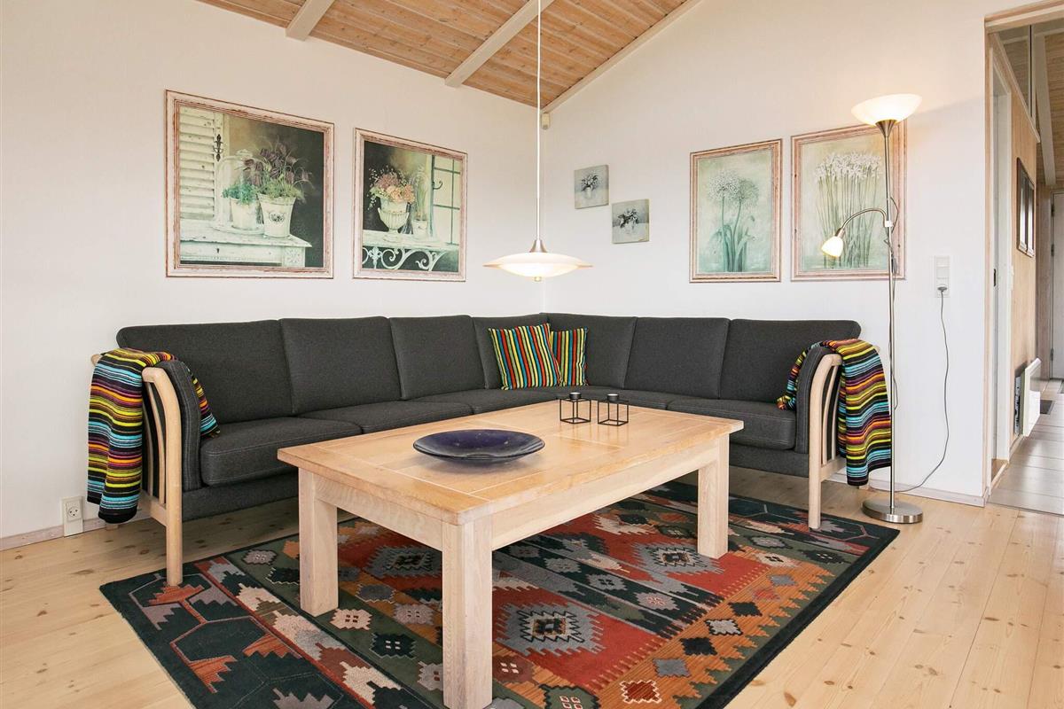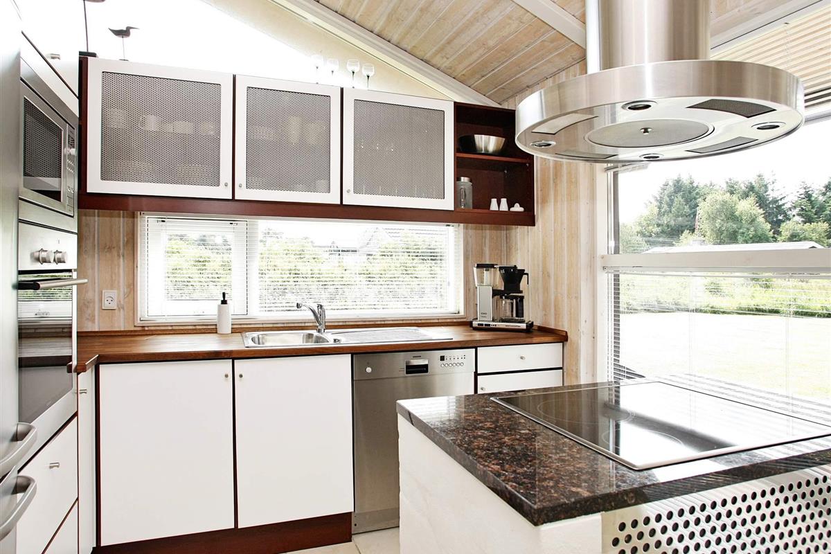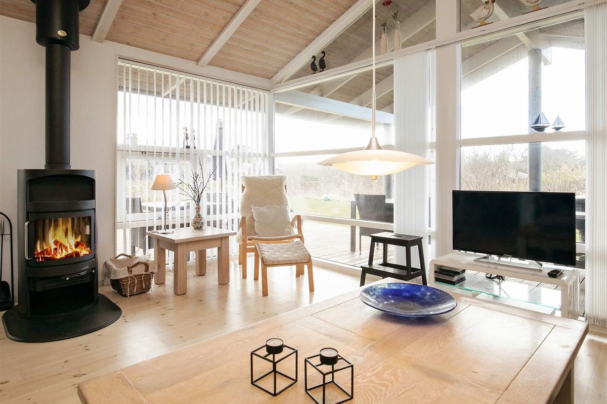 Ferienhaus in schöner Natur auf einem großen Naturgrundstück gelegen. Sollte es einmal zu kalt sein, um sich draußen aufzuhalten, kann die Natur durch die großen Panoramafenster des kombinierten Wohn-/Essbereiches genossen werden. Helle Farben und eine moderne Einrichtung verbreiten eine gute Stimmung im ganzen Haus und der Holzofen sorgt auch an kälteren Tagen für behagliche Wärme. Offene und überd. Terrasse mit Gartenmöbeln und Grill. Das Haus liegt zentral zu Einkaufsmöglichkeiten, Restaurants, Badestrand, Golfplatz und dem Vergnügungspark "Fårup Sommerland".