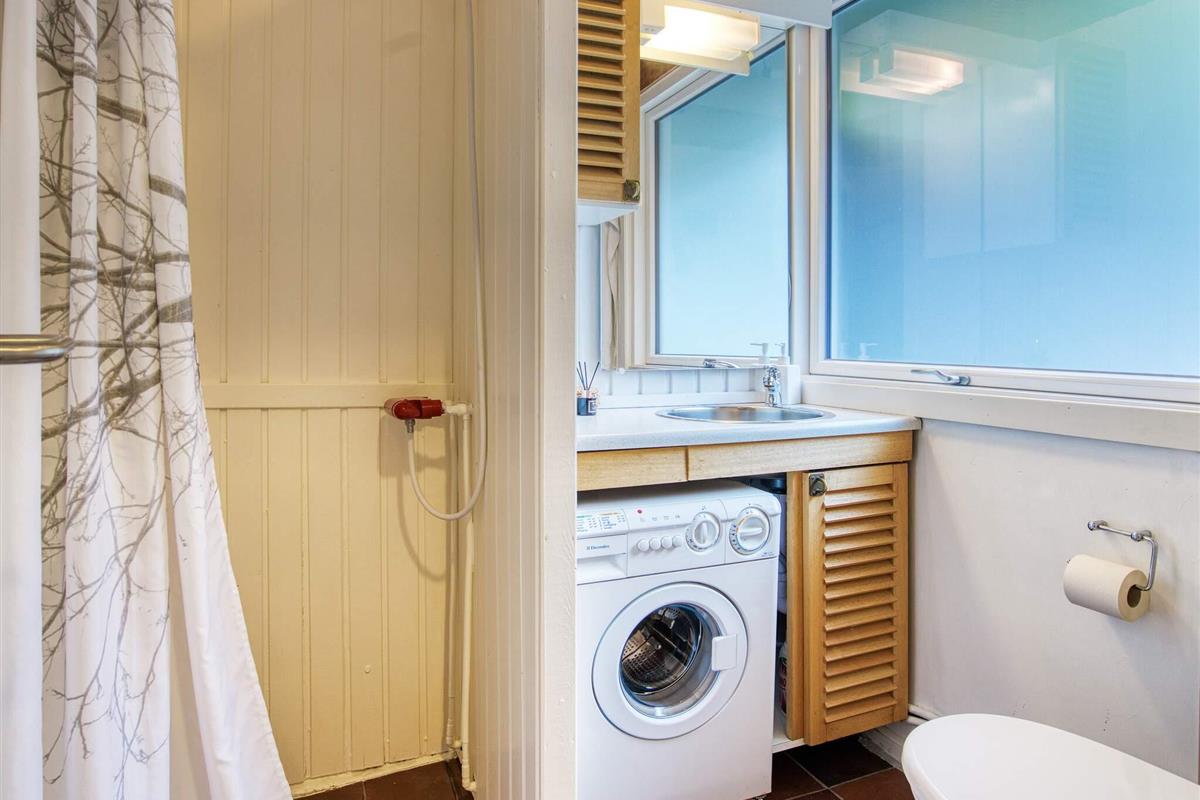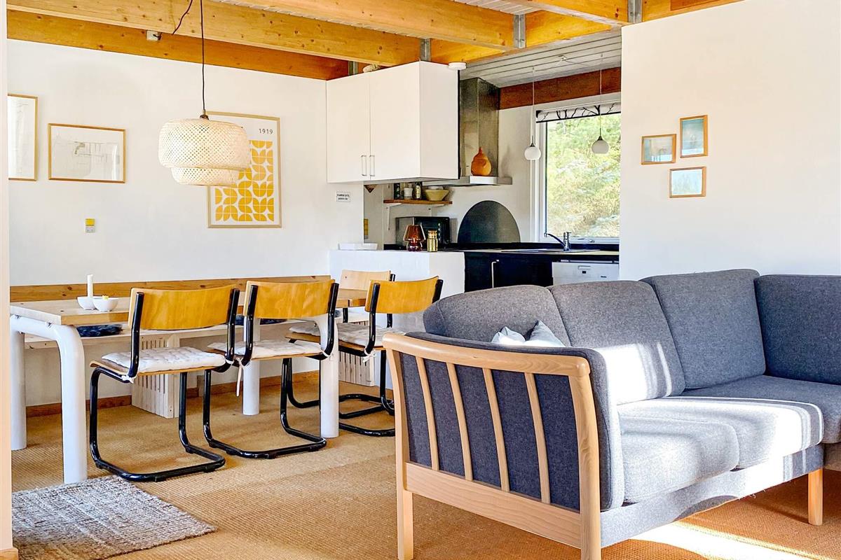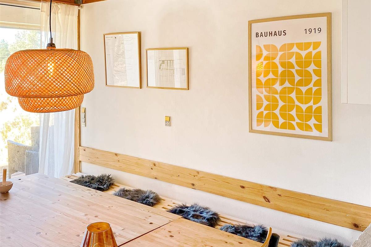Das Haus verfügt über drei Schlafzimmer und ein funktionales Badezimmer. Das Herzstück des Hauses bildet der offene Küchen- und Wohnbereich, der mit einem Essbereich und einer gemütlichen Sitzecke für Familienfeiern konzipiert ist. Von hier aus haben Sie direkten Zugang zur teilweise überdachten Holzterrasse, auf der Sie Mahlzeiten im Freien genießen oder einfach an der frischen Luft entspannen können. An kühleren Tagen sorgt die Wärme des Holzofens für eine gemütliche Atmosphäre, während die energieeffiziente Wärmepumpe eine moderne und klimafreundliche Alternative bietet. Ein kleiner Dachboden (Hems) bietet zusätzliche Schlafmöglichkeiten, besonders geeignet für Kinder.