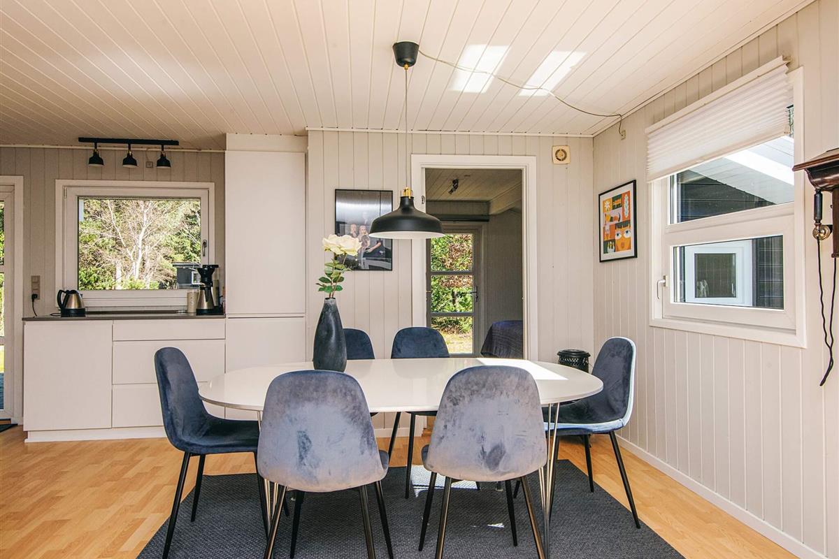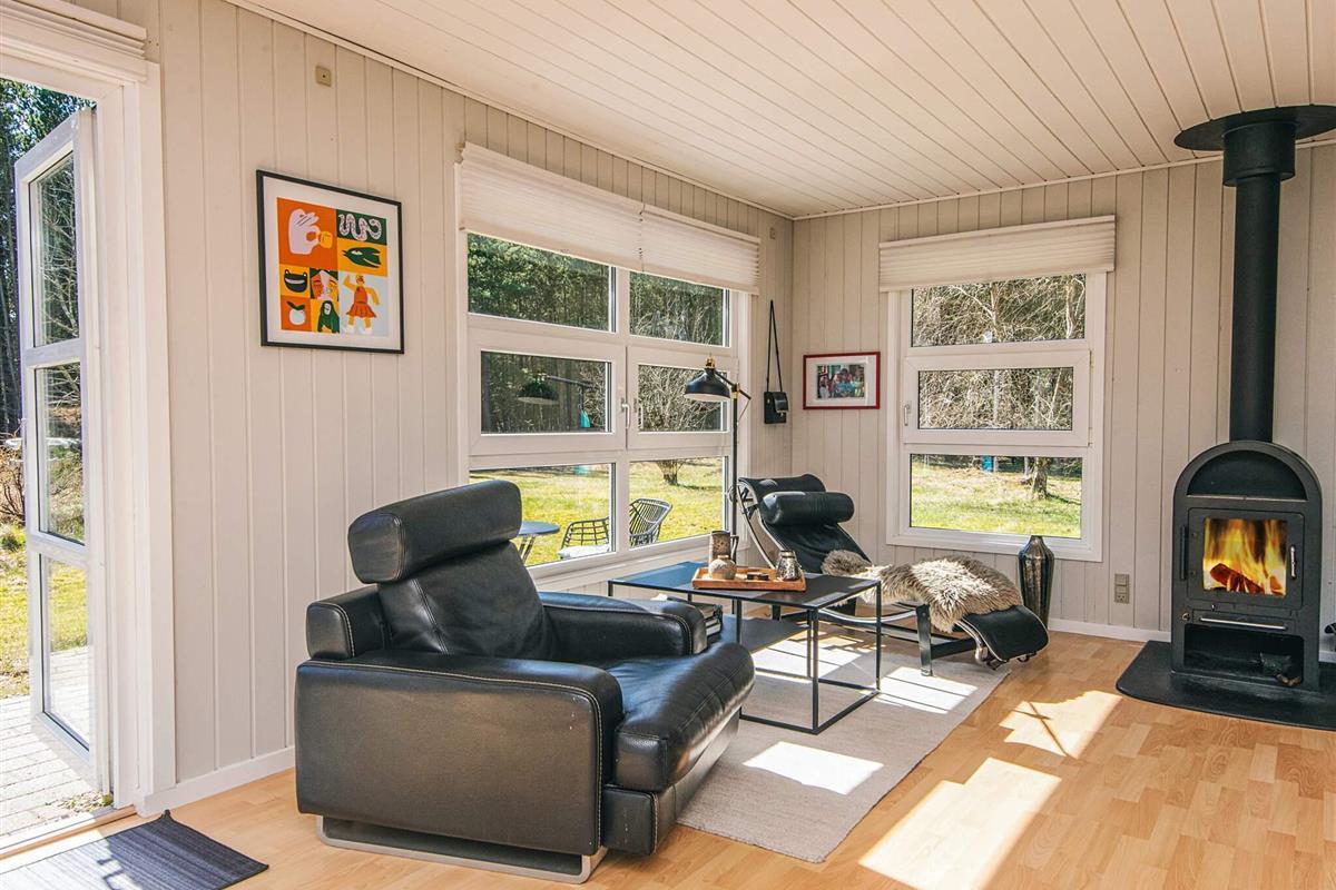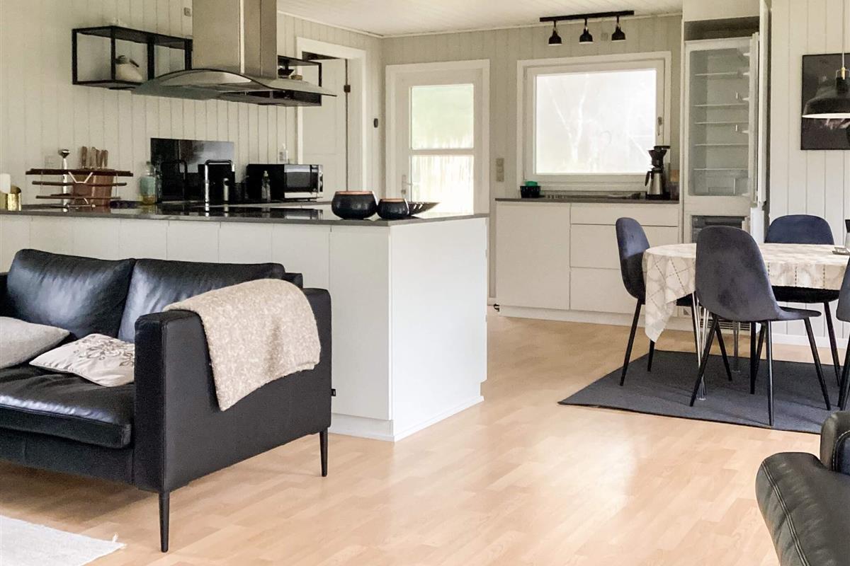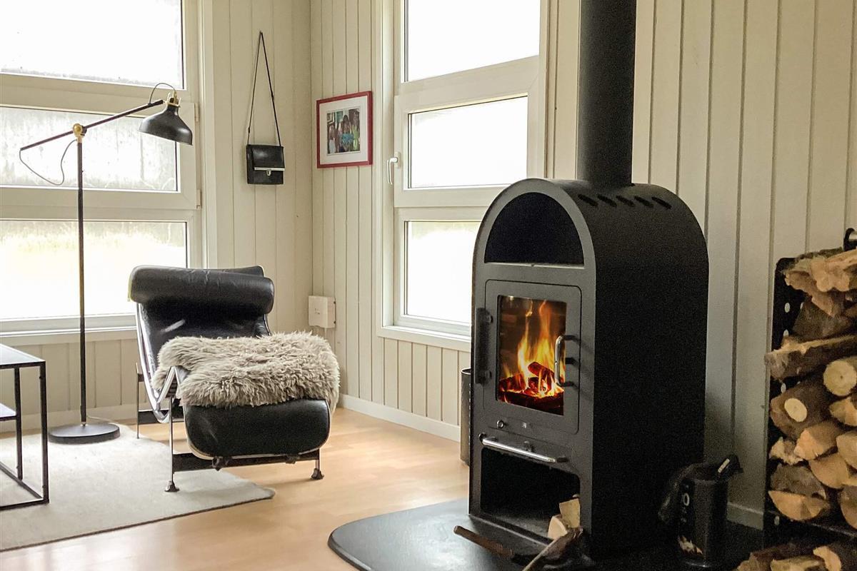 Das gut ausgestattete Ferienhaus hat Terrassentüren und große Fenster die für helle Räumlichkeiten sorgen. Das Haus besteht aus einer Wohnküche mit Essbereich und Sitzecke. Ein Zimmer mit 2 Einzelbetten, 2. Zimmer mit einem Doppelbett und ein 3. größeres Schlafzimmer mit einem weiteren Doppelbett. Ein Badezimmer im Haus. Im Wohnzimmer gibt es einen Holzofen. Um einen geringen Verbrauch und ein gutes Raumklima zu gewährleisten, ist im Haus eine klimafreundliche Wärmepumpe installiert.