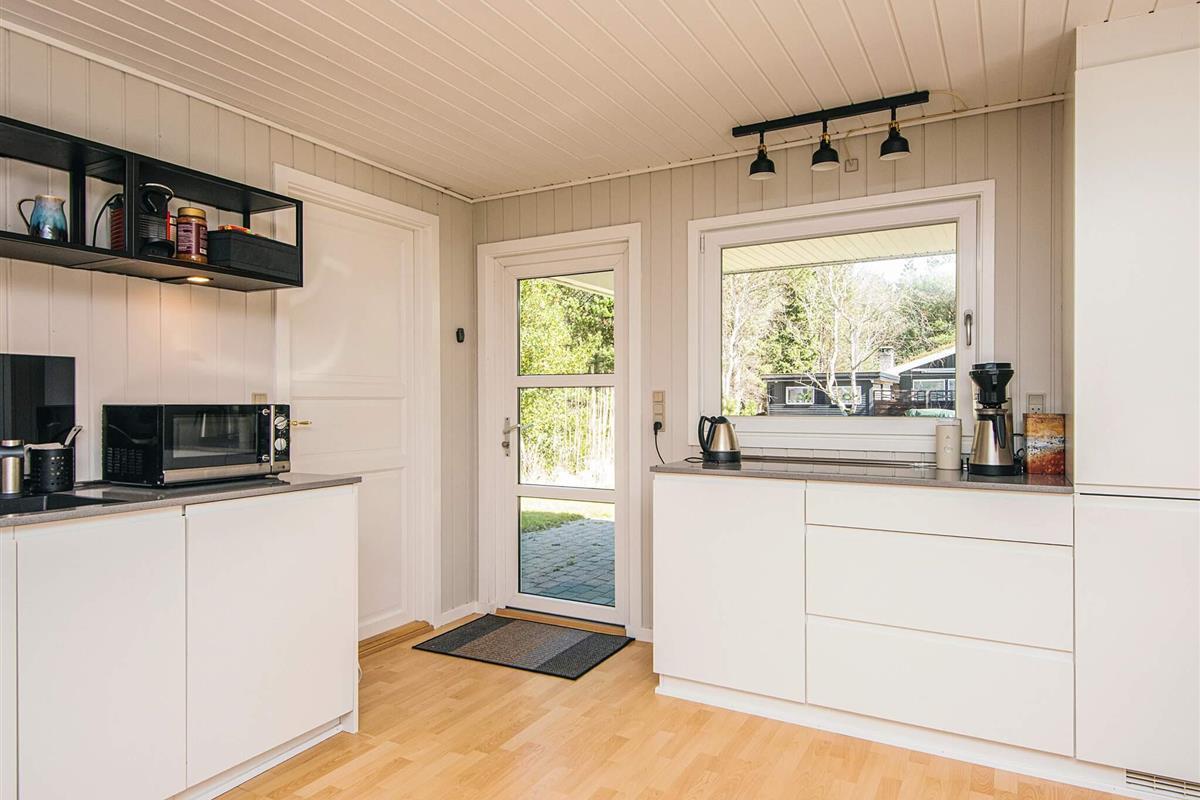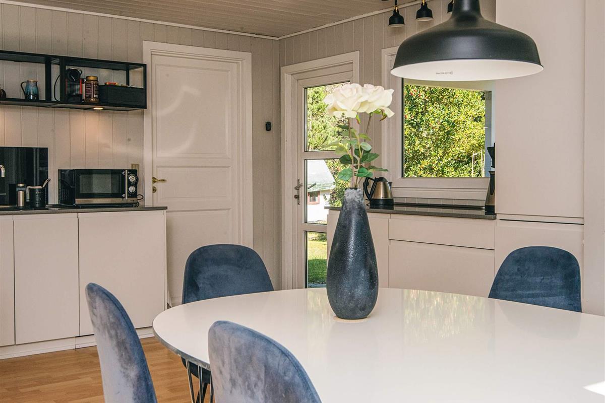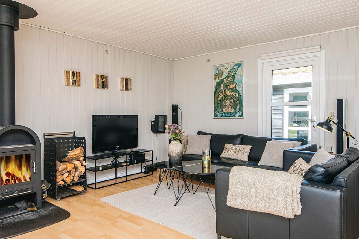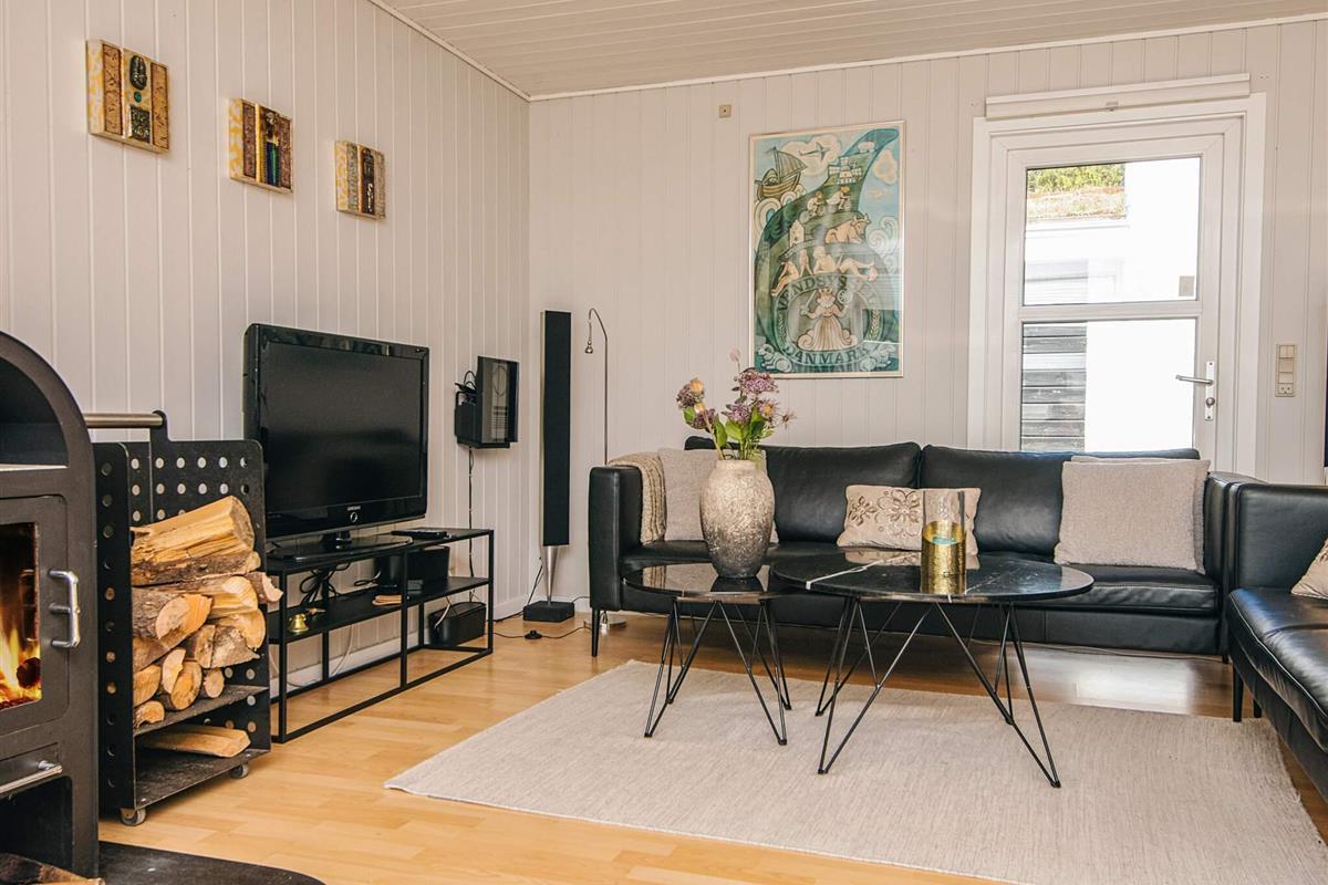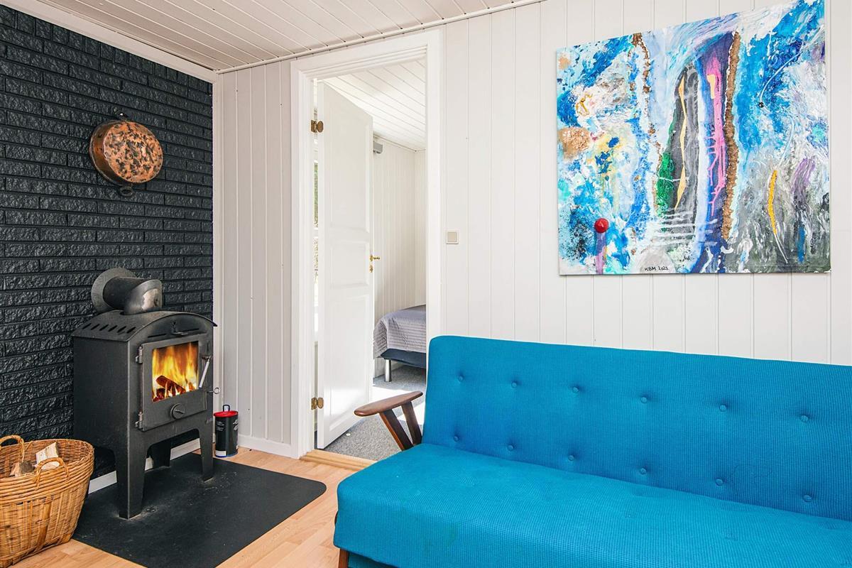 Das gut ausgestattete Ferienhaus hat Terrassentüren und große Fenster die für helle Räumlichkeiten sorgen. Das Haus besteht aus einer Wohnküche mit Essbereich und Sitzecke. Ein Zimmer mit 2 Einzelbetten, 2. Zimmer mit einem Doppelbett und ein 3. größeres Schlafzimmer mit einem weiteren Doppelbett. Ein Badezimmer im Haus. Im Wohnzimmer gibt es einen Holzofen. Um einen geringen Verbrauch und ein gutes Raumklima zu gewährleisten, ist im Haus eine klimafreundliche Wärmepumpe installiert.