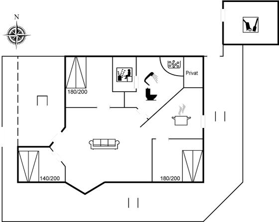 De vakantiewoning is gelegen op een 1200 m² groot natuural grond. Afstand tot de zee 2150 m. Dichtstbijzijnde winkel 1750 m. Bij de vakantiewoning hoort 30 m² terras. Daarnaast is er een 20 m² groot overdekt terras. Gereedschapsruimte. Zandbak. Barbecue. Parkeerplaats bij het huis.