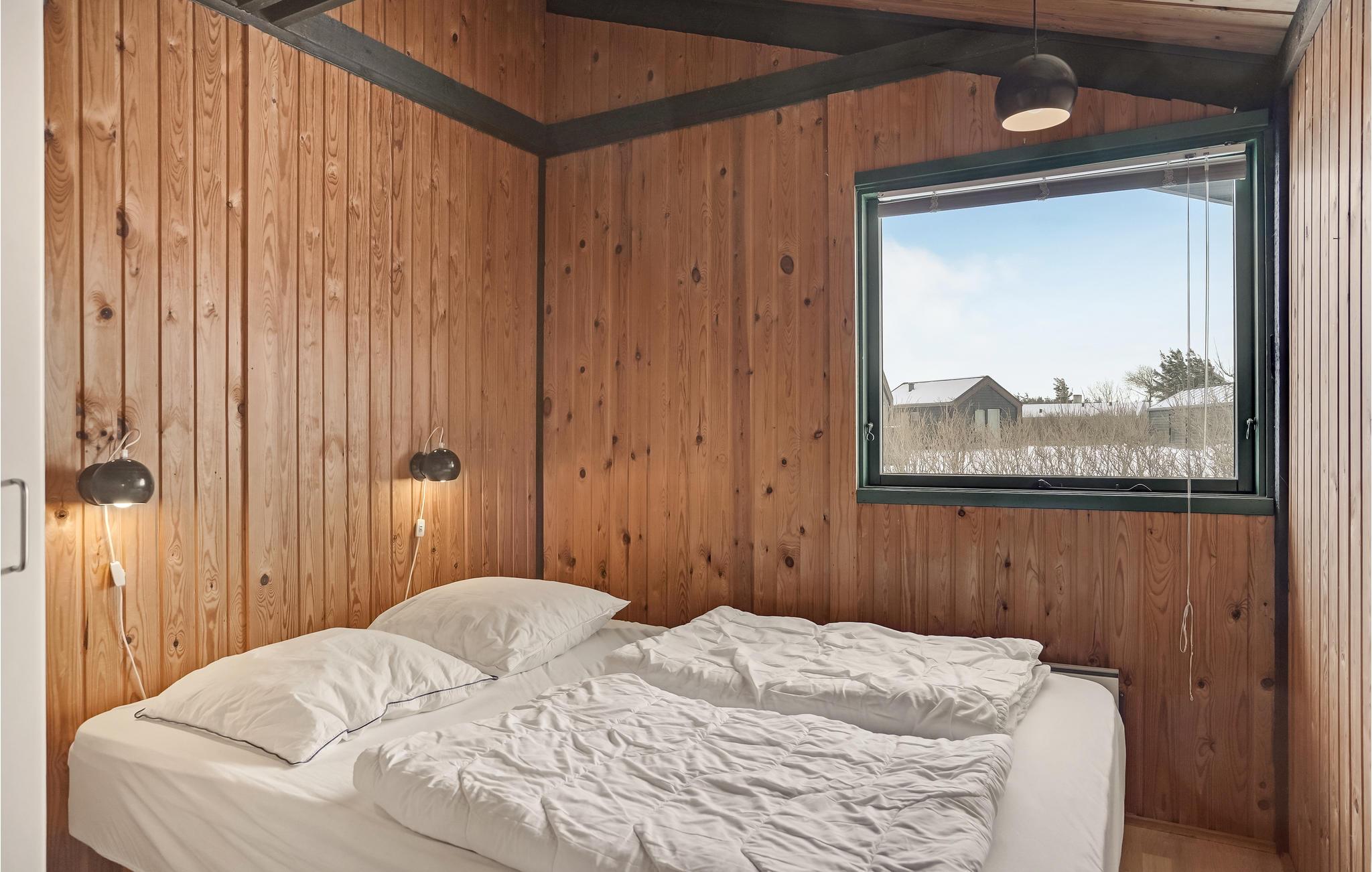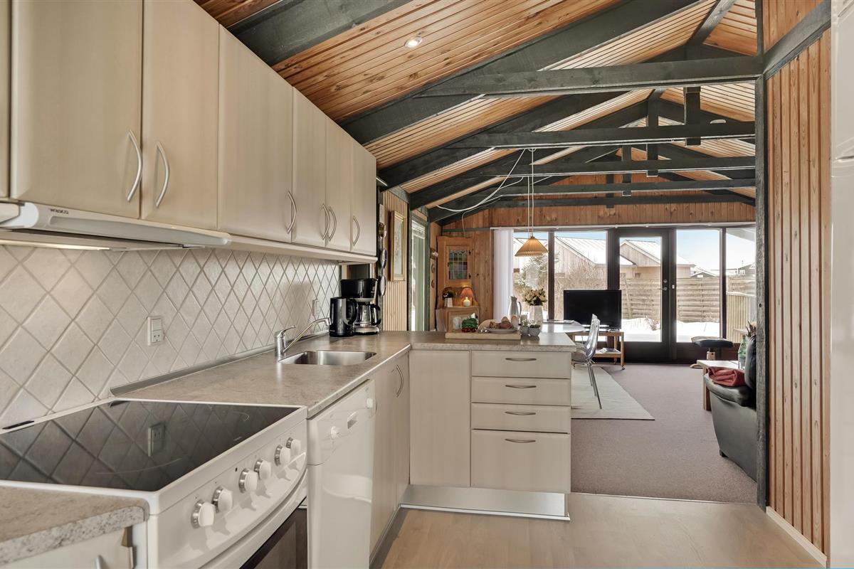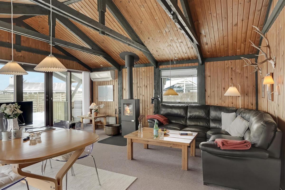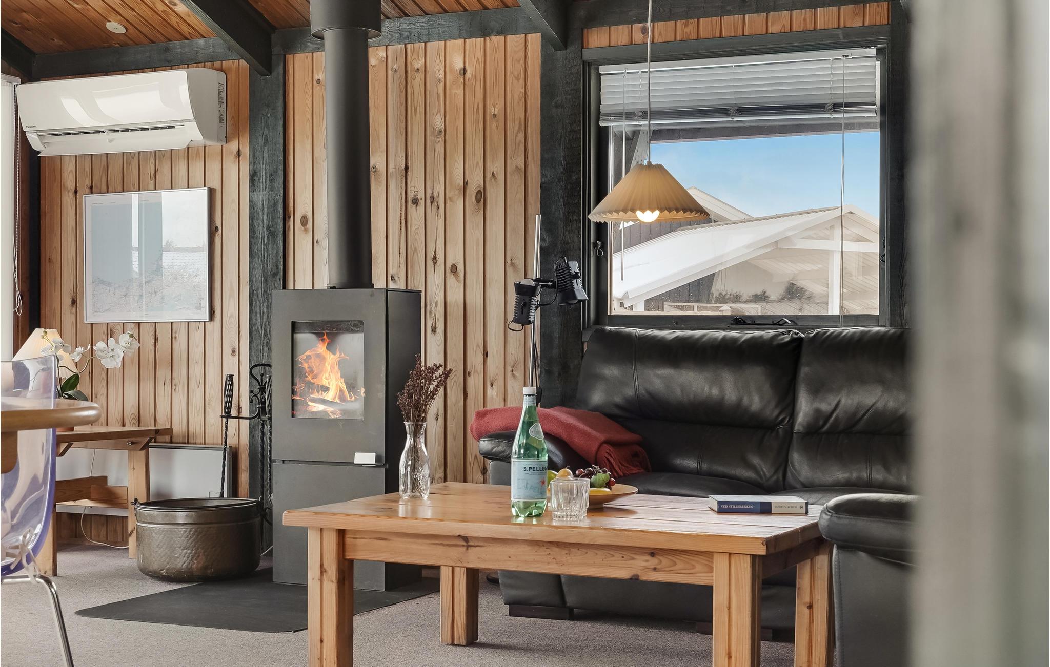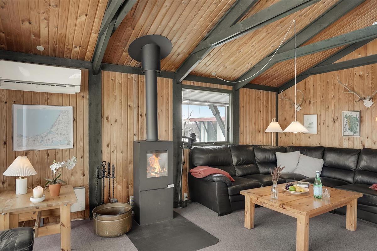Dit vakantiehuis in Blokhus biedt een rustige vakantie voor gezinnen of kleinere groepen. De open keuken is functioneel en loopt naadloos over in de woonkamer, die licht biedt door de grote ramen en een prachtig uitzicht op het omliggende terrein. De gezellige zithoek belooft ontspannende uren bij het vuur in de kachel, terwijl de rustieke houten sfeer de perfecte zomerhuisjessfeer creëert.