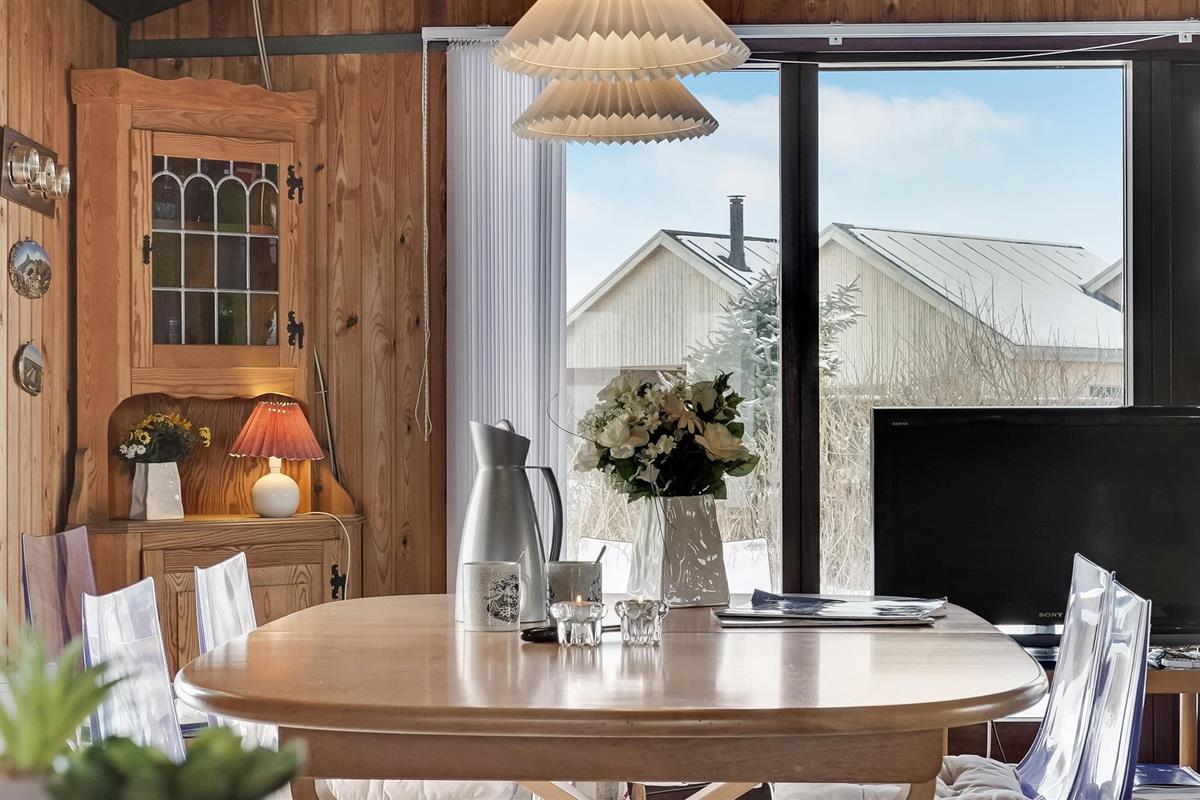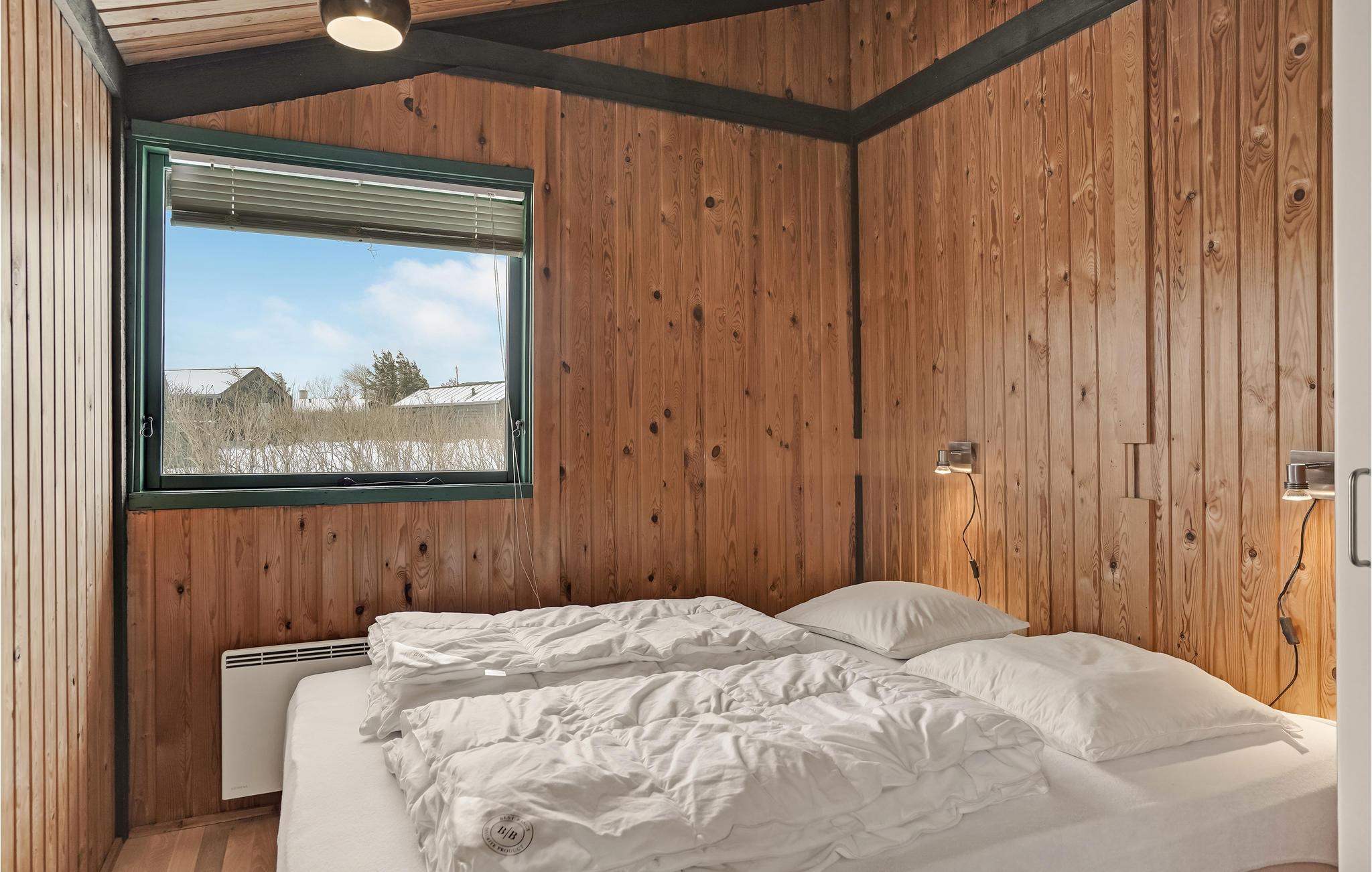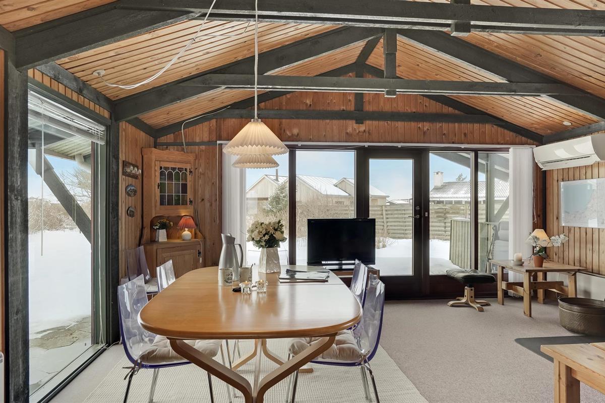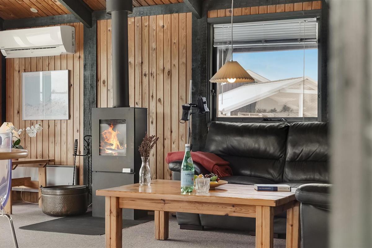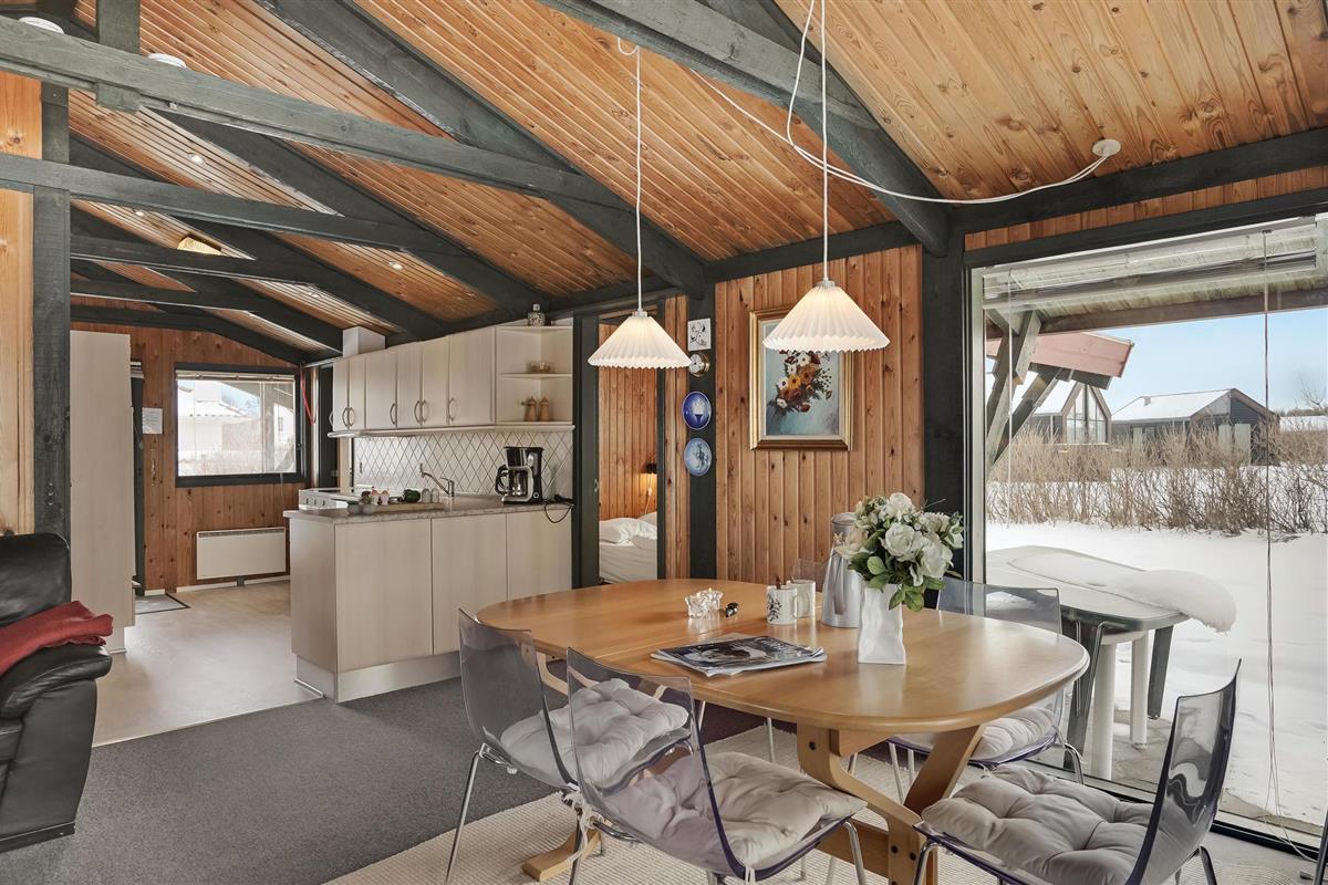 Dit vakantiehuis in Blokhus biedt een rustige vakantie voor gezinnen of kleinere groepen. De open keuken is functioneel en loopt naadloos over in de woonkamer, die licht biedt door de grote ramen en een prachtig uitzicht op het omliggende terrein. De gezellige zithoek belooft ontspannende uren bij het vuur in de kachel, terwijl de rustieke houten sfeer de perfecte zomerhuisjessfeer creëert.