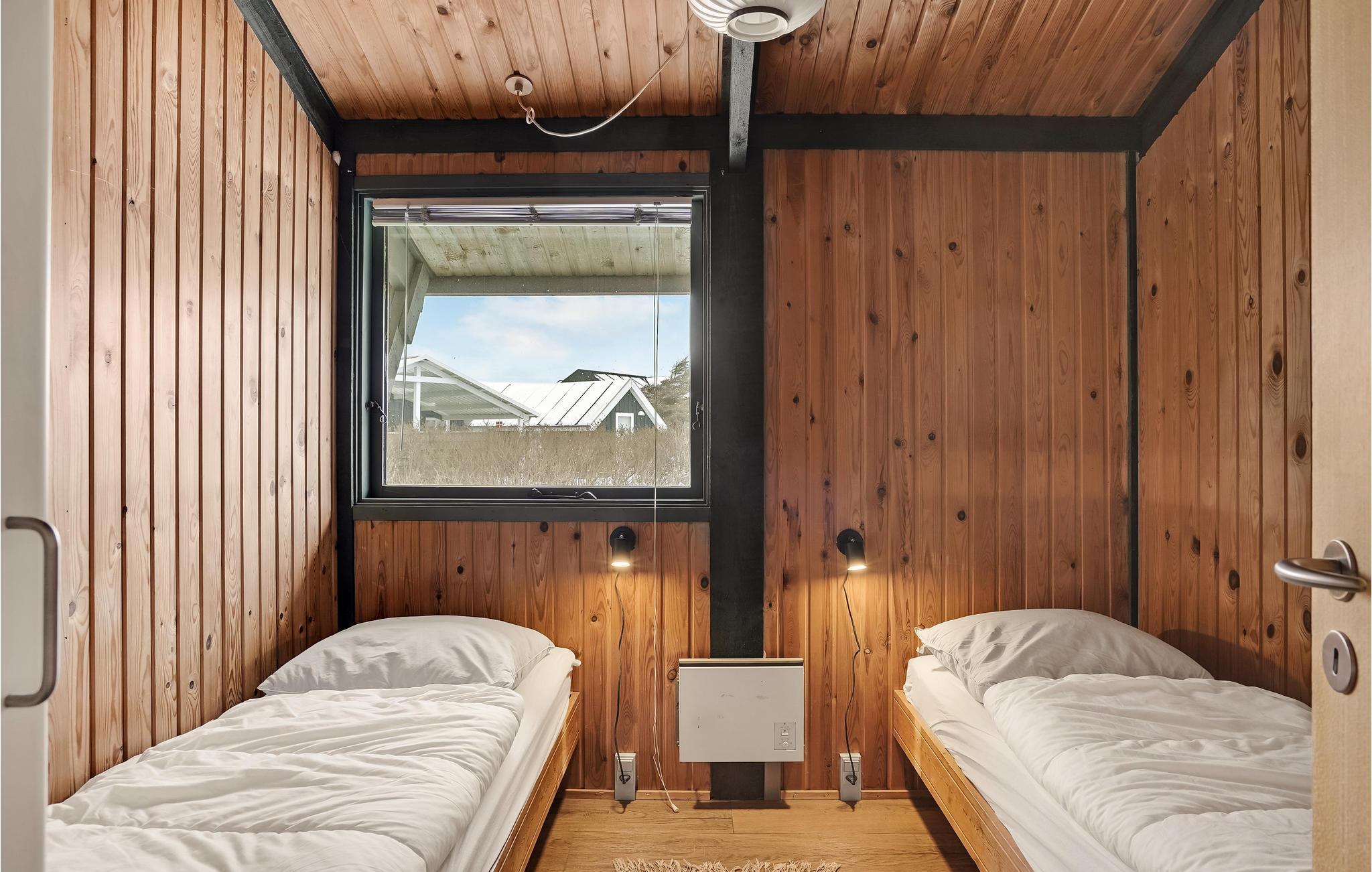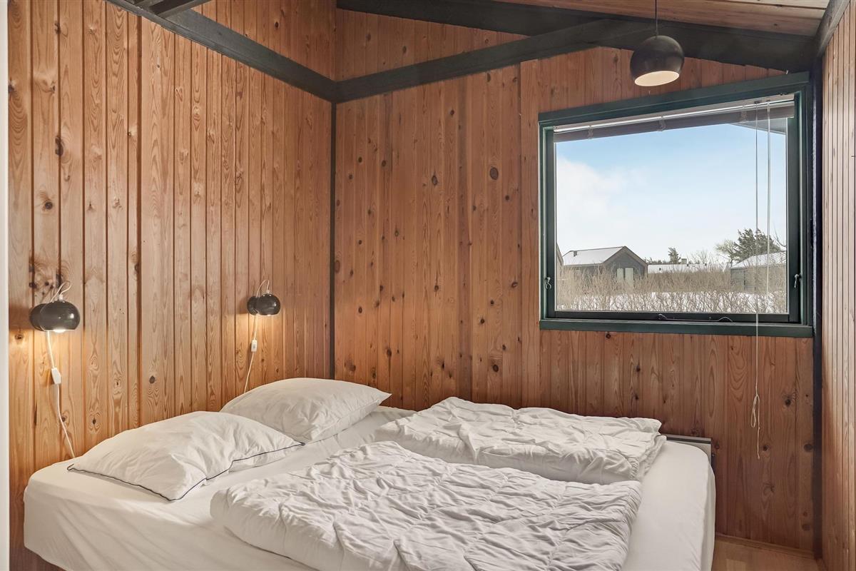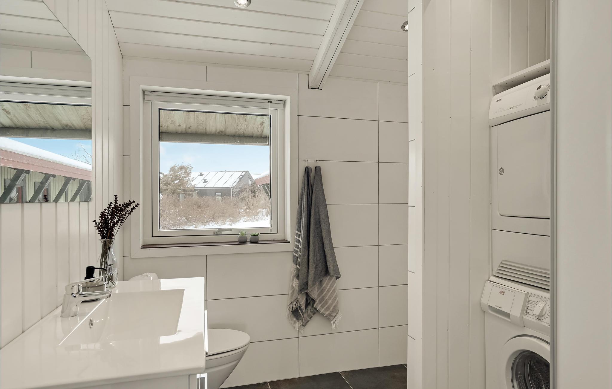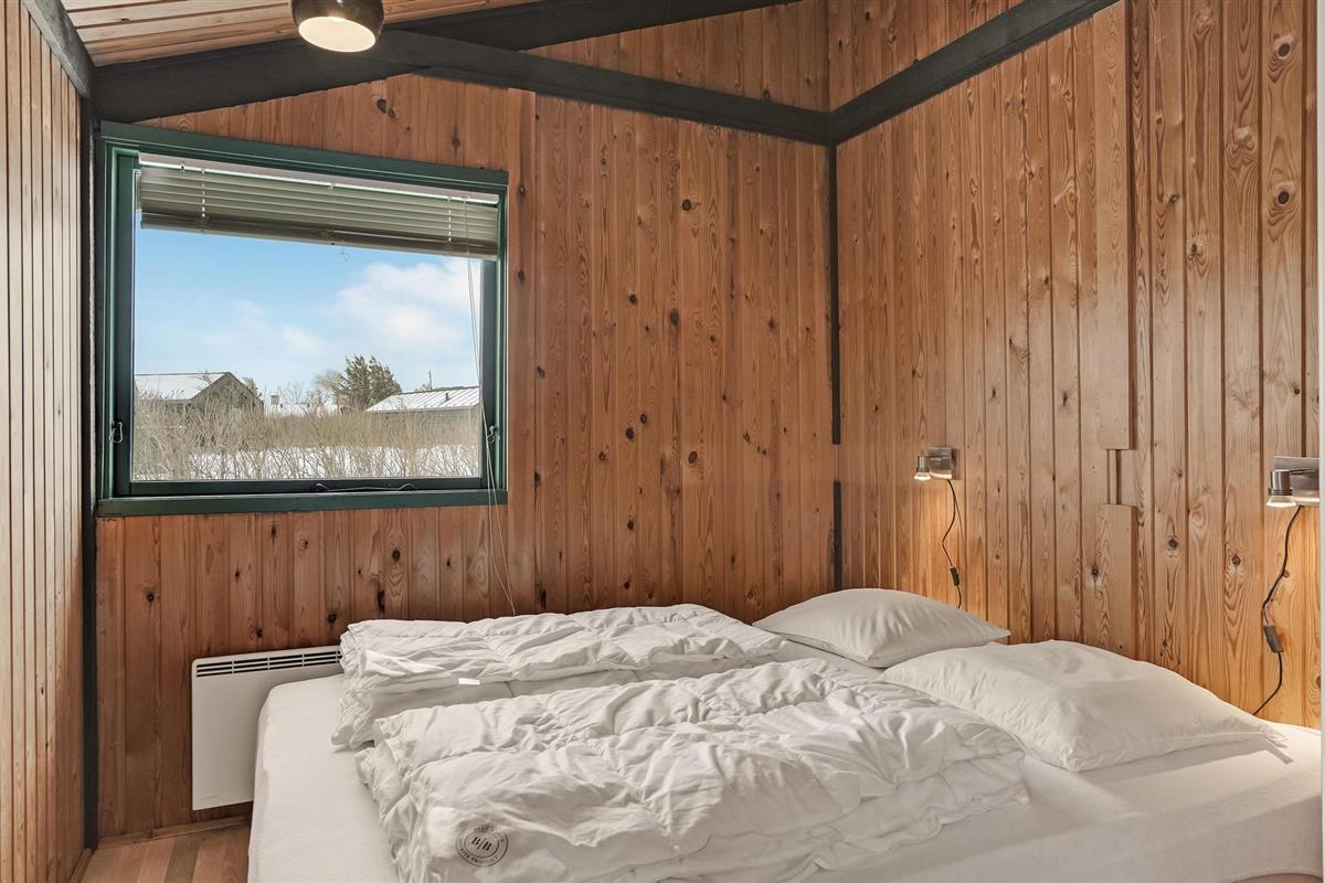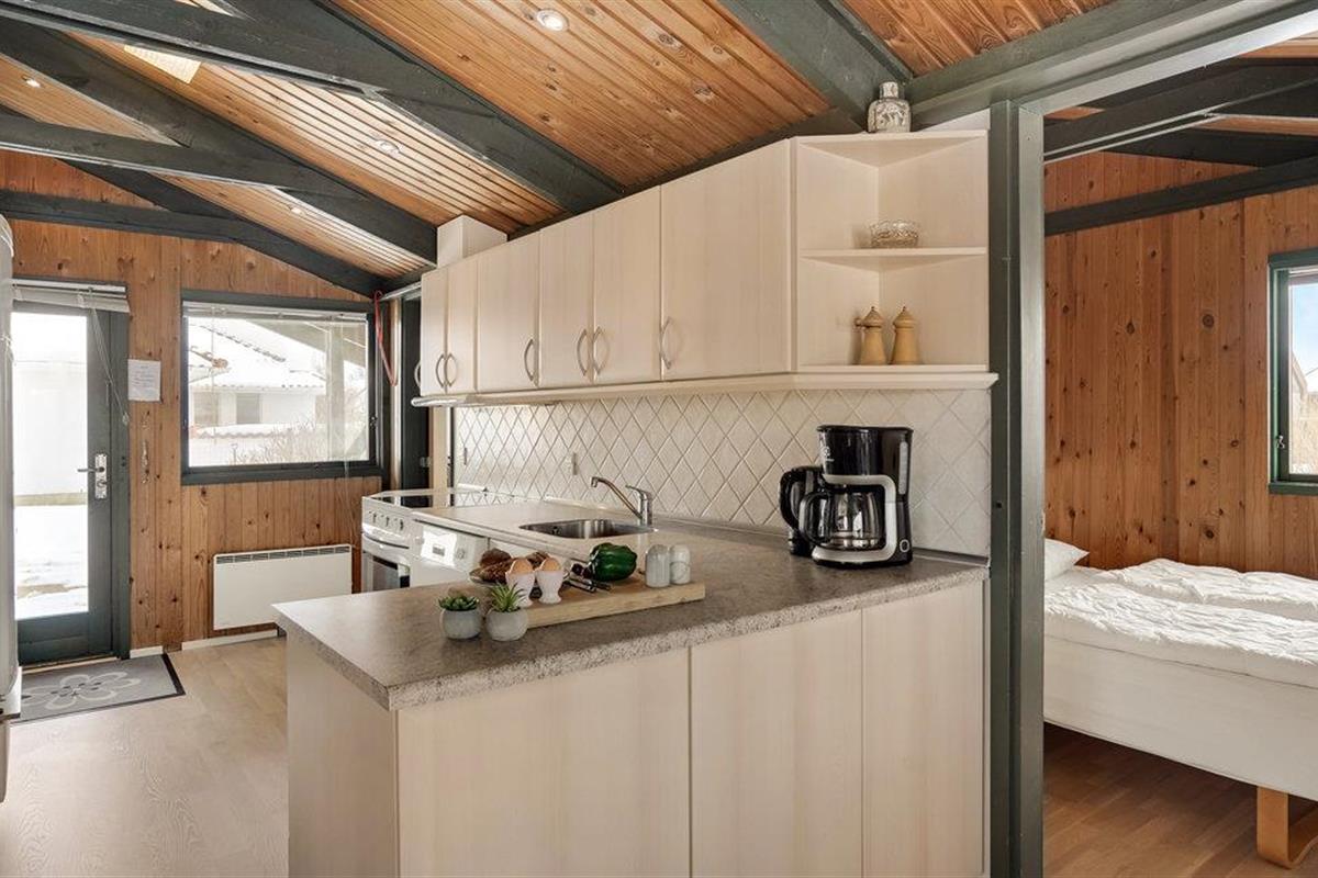 Dit vakantiehuis in Blokhus biedt een rustige vakantie voor gezinnen of kleinere groepen. De open keuken is functioneel en loopt naadloos over in de woonkamer, die licht biedt door de grote ramen en een prachtig uitzicht op het omliggende terrein. De gezellige zithoek belooft ontspannende uren bij het vuur in de kachel, terwijl de rustieke houten sfeer de perfecte zomerhuisjessfeer creëert.