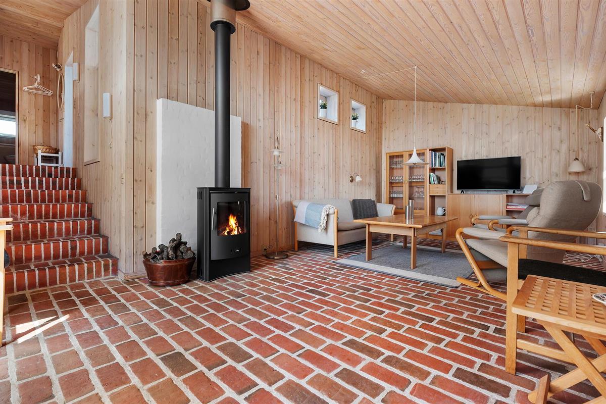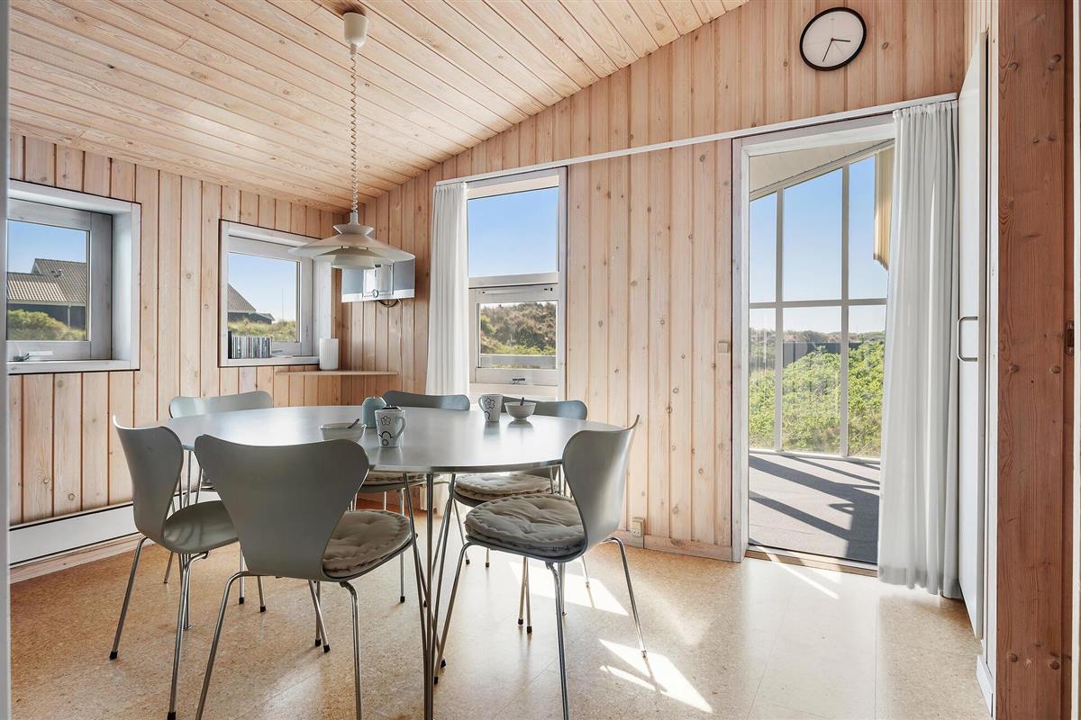 Beleef een ontspannen vakantie in dit vakantiehuis, dat midden in het prachtige duinlandschap aan de Deense westkust ligt. De rustige ligging niet ver van het strand maakt dit vakantiehuis een ideaal toevluchtsoord voor iedereen die op zoek is naar rust, natuur en de zee. Stap binnen en voel je thuis in het gezellige interieur. De centrale woonkamer met houten lambrisering, gezellige zithoek en houtkachel nodigt je uit om ontspannende uren door te brengen. Geniet van het warme vuur en lees een goed boek. Bereid je maaltijden in de keuken en eet samen aan de eettafel met uitzicht op de omgeving.