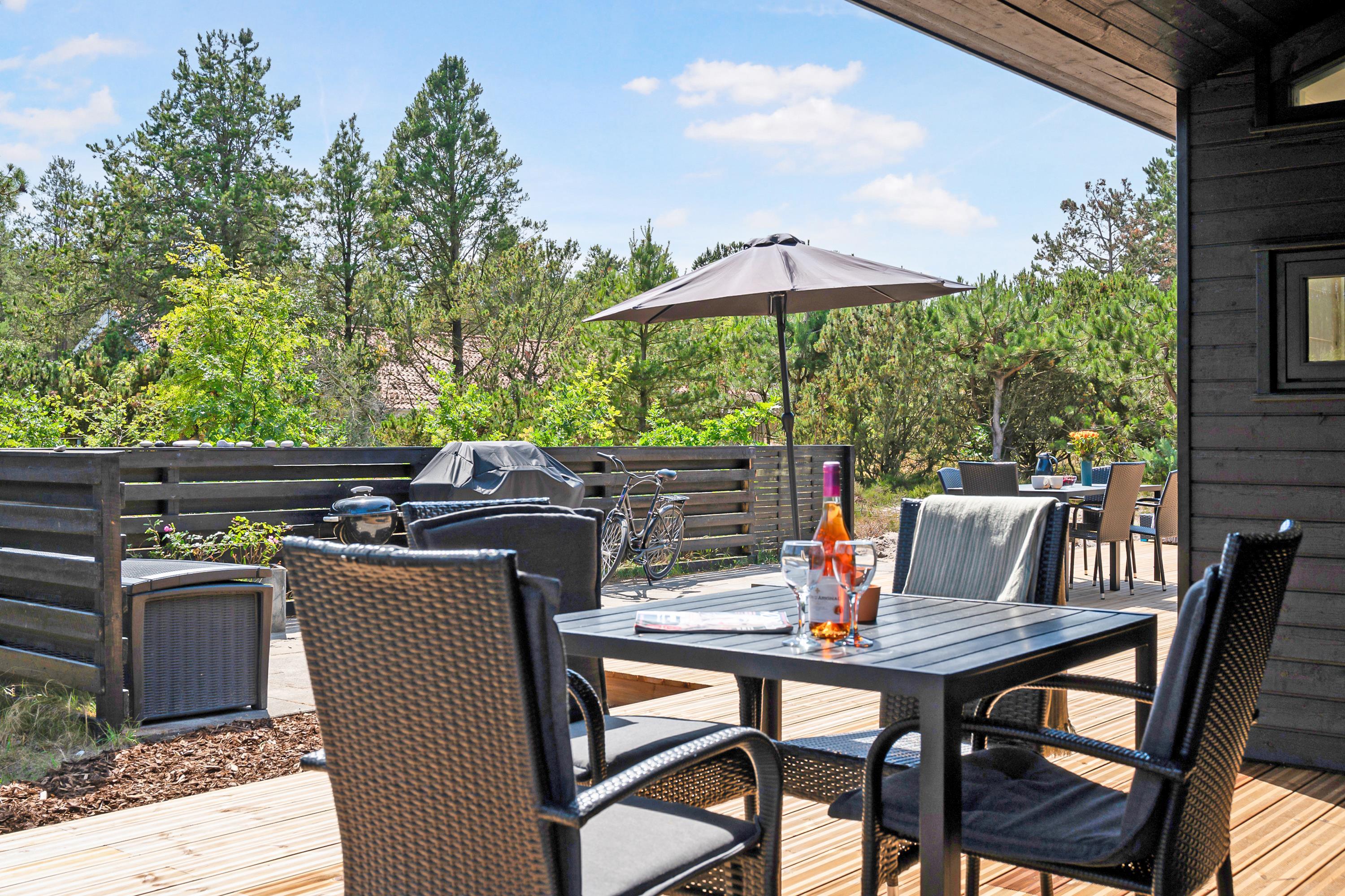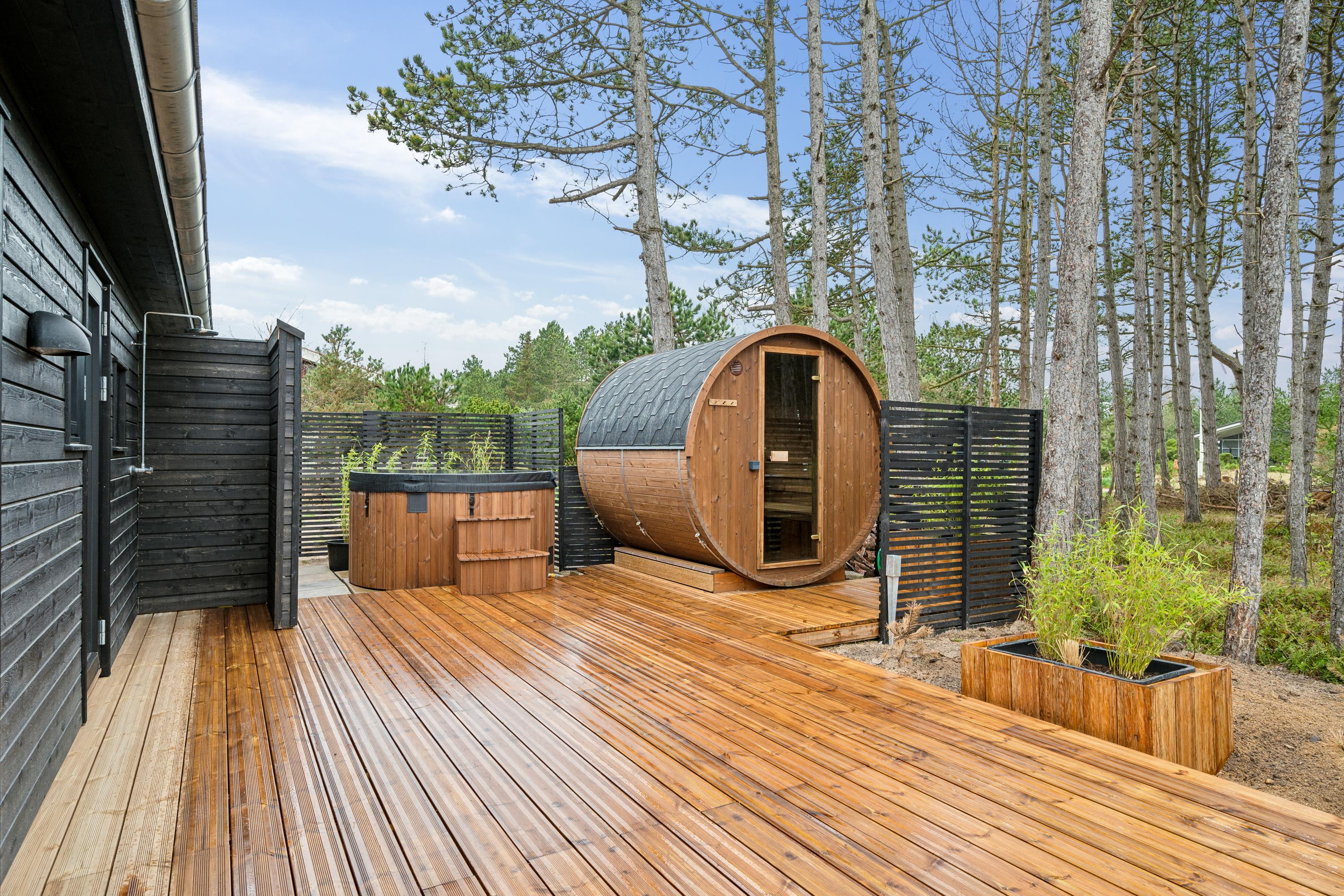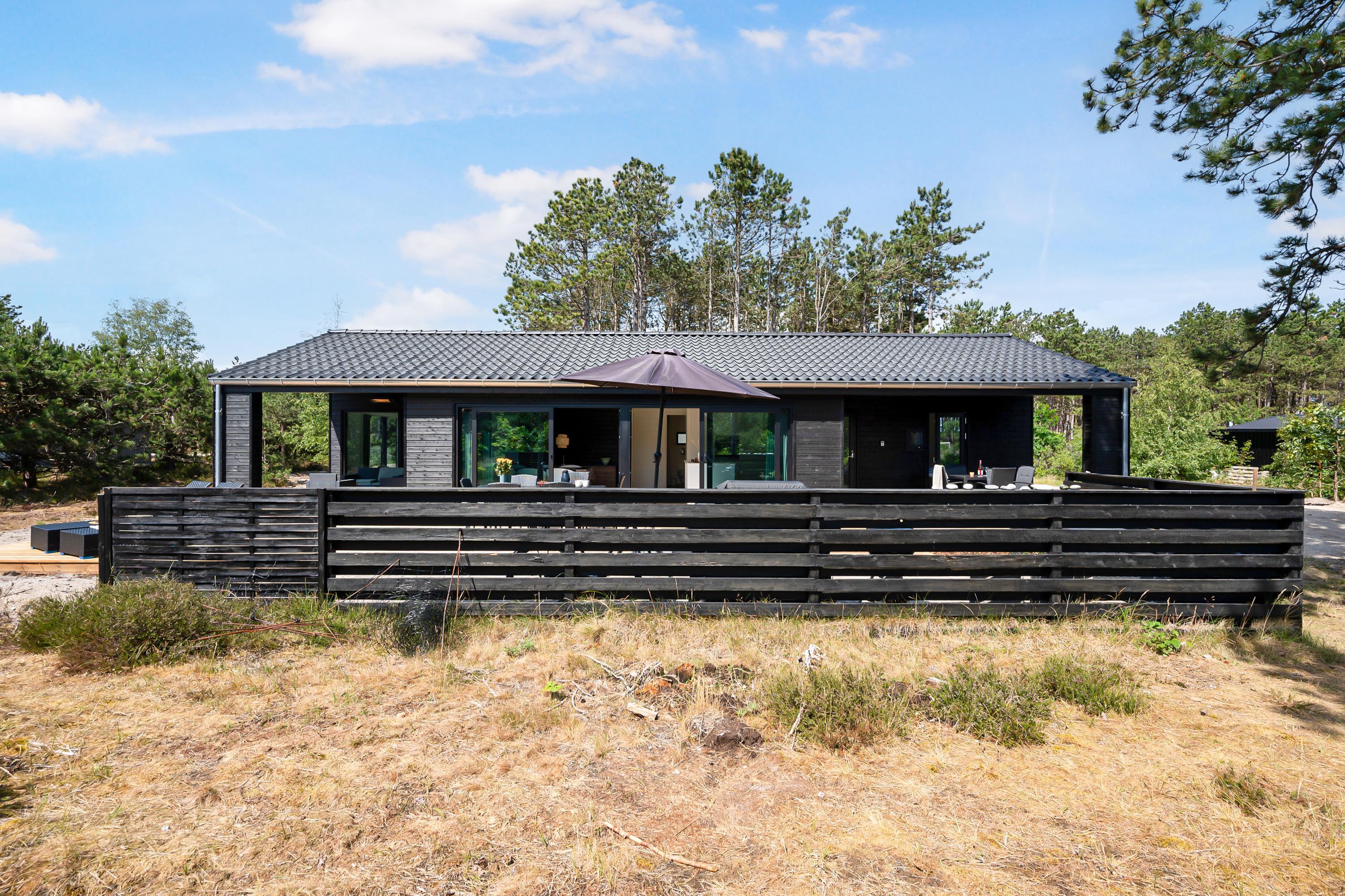 Truly exquisite newly built house only 150 m from a beautiful sandy beach. The house spans 101 m2 and features a large, bright, and well-appointed living room with quality furniture, heat pump, and bio fireplace. Adjacent to the living room is the well-equipped kitchen area with a kitchen island. The house accommodates seven guests across three good-sized bedrooms; two with double beds and one with a double bed and a bunk bed. Two beautiful bathrooms with underfloor heating and shower cubicles. Lovely terraces around the house, both covered and open, equipped with garden furniture, sun loungers, and a grill. Here, one can enjoy outdoor living and be so close to the water that you can hear the waves. There is also an outdoor shower. For the little holiday guests, there will be a high chair. The house is equipped with internet access.