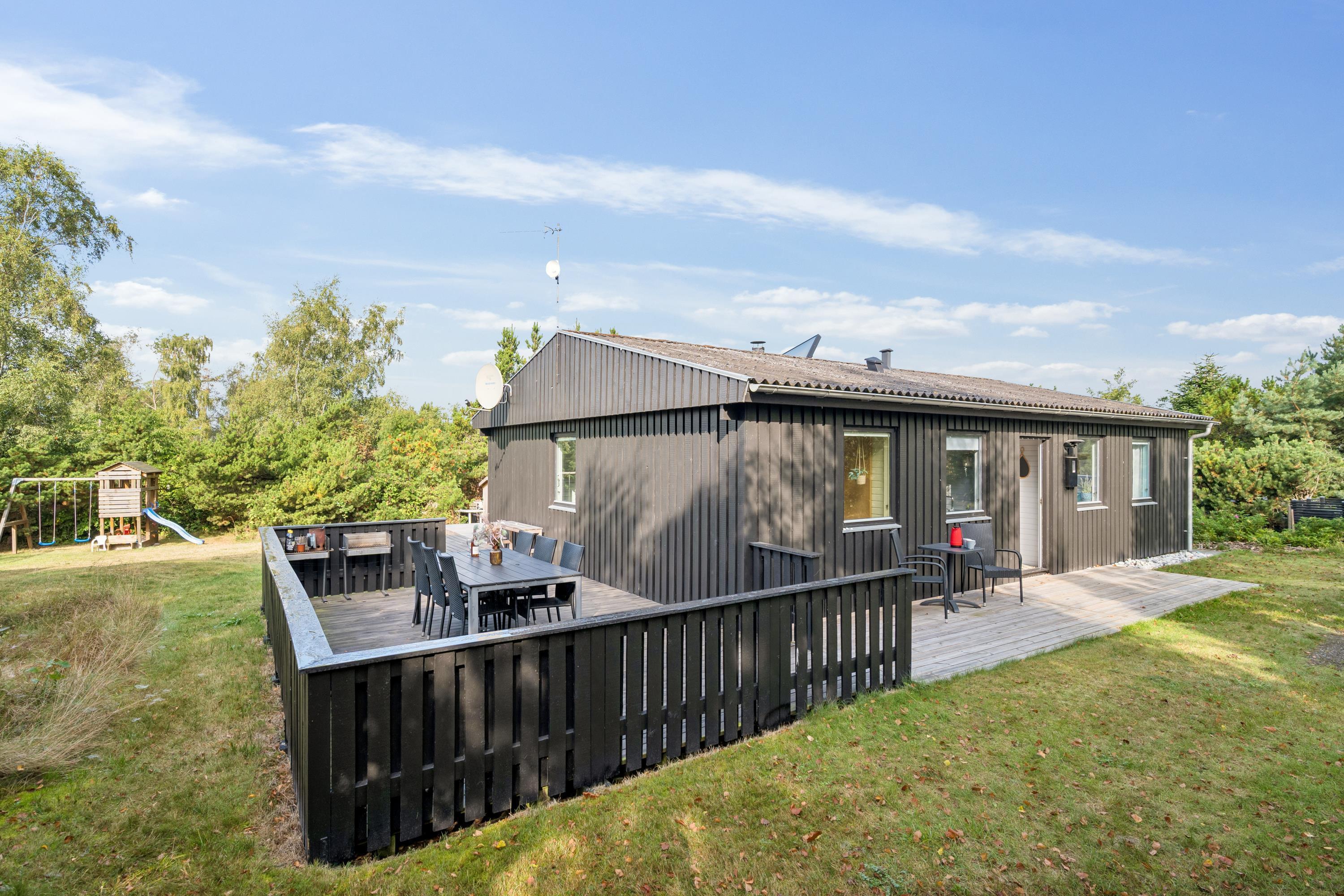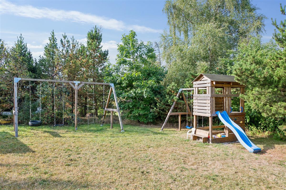 The house is situated on a lovely lot surrounded by charming terrace areas with garden furniture, a grill, and a parasol. There's a large lawn, perfect for playing and outdoor activities, and there are also amenities for the little ones such as a sandbox, swings, and a play tower. It's an ideal holiday home for a family with children.