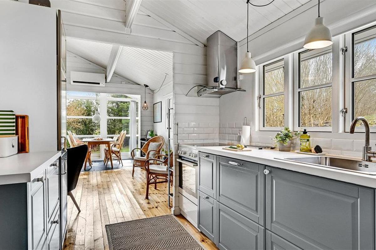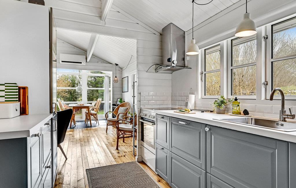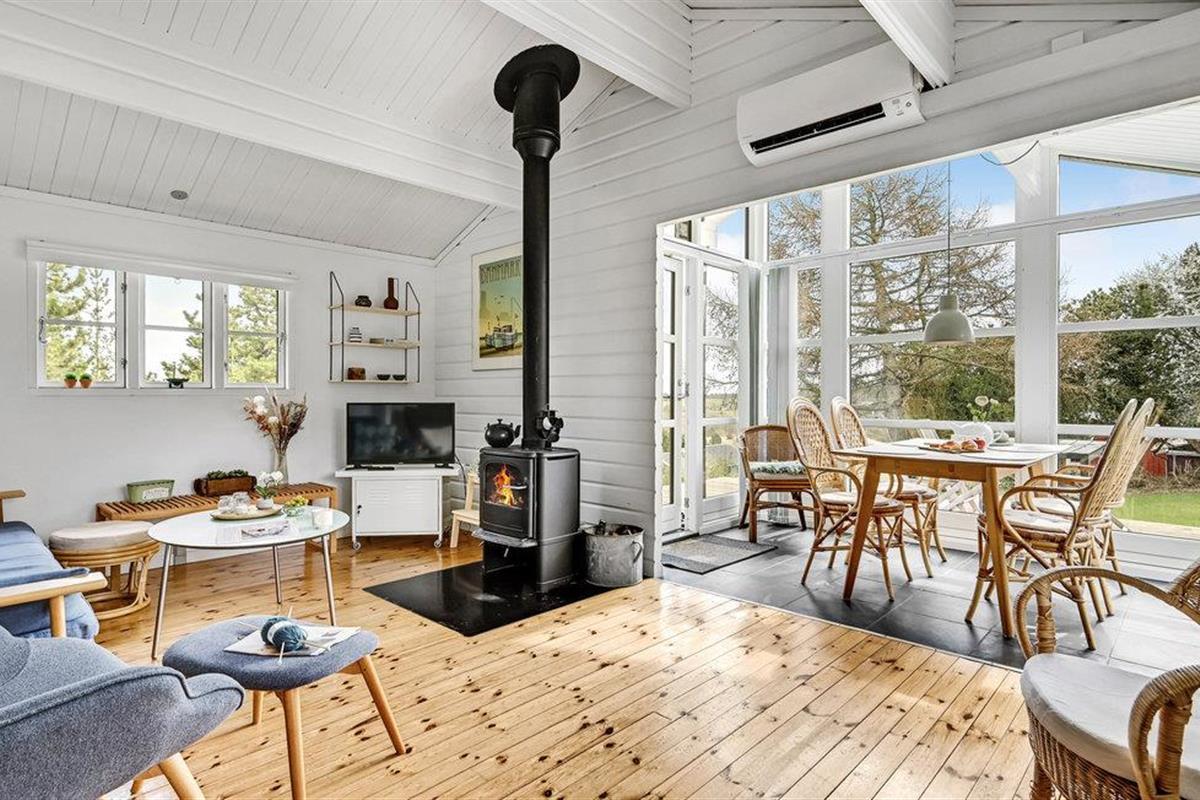 Tussen het mooie stadje Ebeltoft en het gezellige dorpje Boeslum, en dicht bij de uitdagende golfbaan van de Ebeltoft Golf Club, vindt u dit mooie vakantiehuis. Het strand of Ebeltoft bereikt u in slechts 5 minuten met de auto. De mooie blokhut is volledig gerenoveerd en omgetoverd tot een moderne, lichte en uitnodigende plek om te verblijven. Het terras geeft u uitzicht op de omgeving en in de verte, aan de horizon kunt u een beetje van de zee zien. Er is een Duits tv-kanaal (ZDF) beschikbaar en in de koelere seizoenen kunt u zich lekker opwarmen voor de open haard. Bovendien zijn de serre en de woonkamer bijzonder gezellig dankzij de behaaglijke vloerverwarming. De keuken is gloednieuw en goed uitgerust.