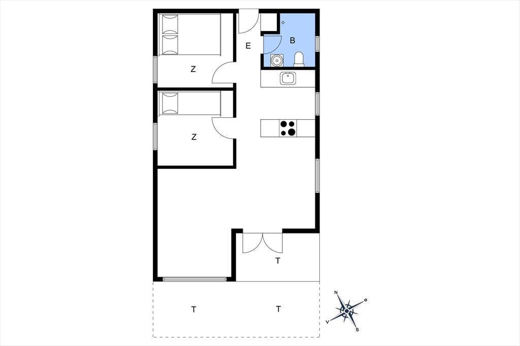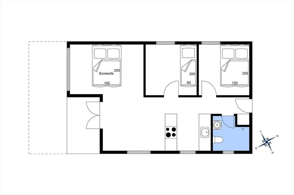 Fra entreen kommer man ind i køkkenet som indeholder komfur med ovn, emhætte, elkedel, samt køleskab og fryser.
