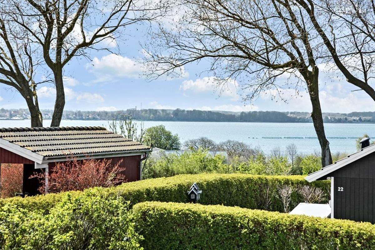 På terrassen kan man sidde og nyde udsigten over Grønsund, Bogø Færgen eller den