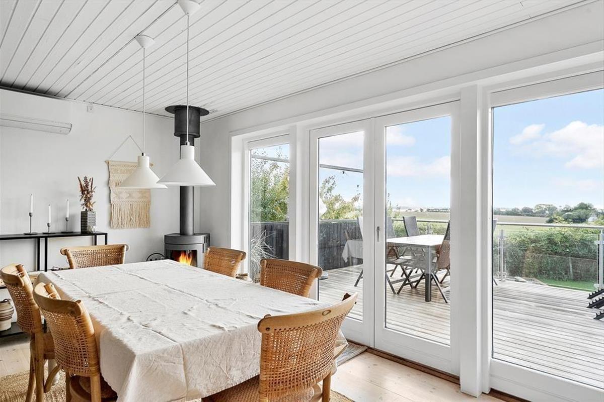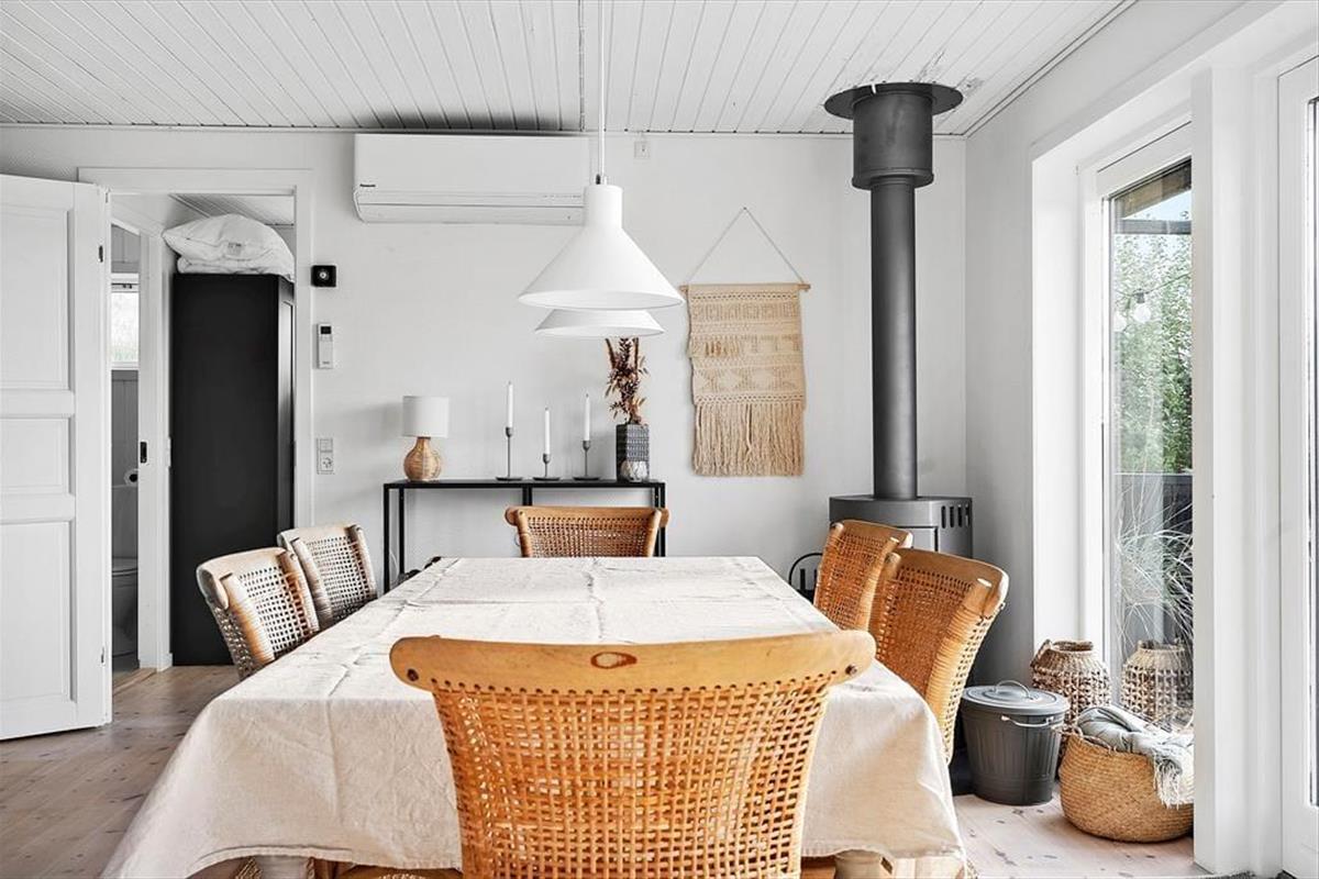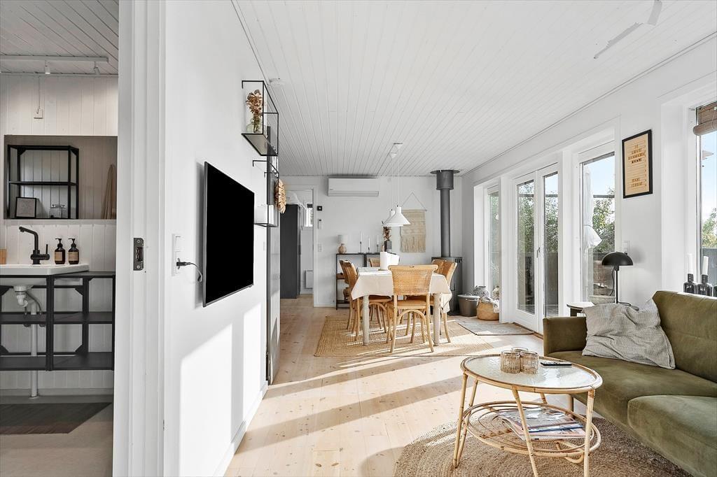 Der helle Wohnraum bietet einen reizvollen Meerblick. Er verfügt über einen Essplatz und einen Ausgang auf die Holzterrasse. Für Unterhaltung sorgt ein Fernseher. Behagliche Temperaturen garantieren der Kaminofen und die Wärmepumpe.