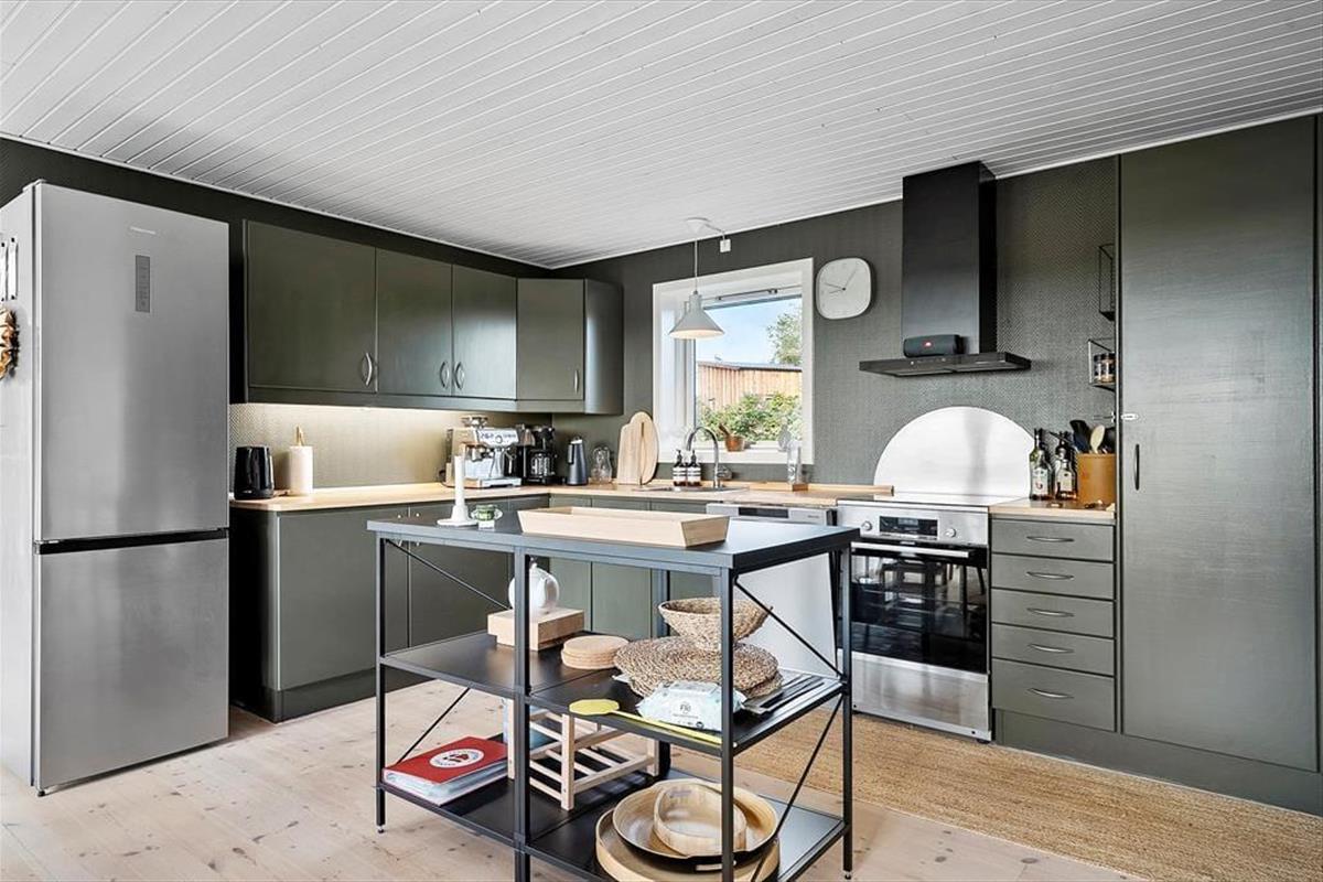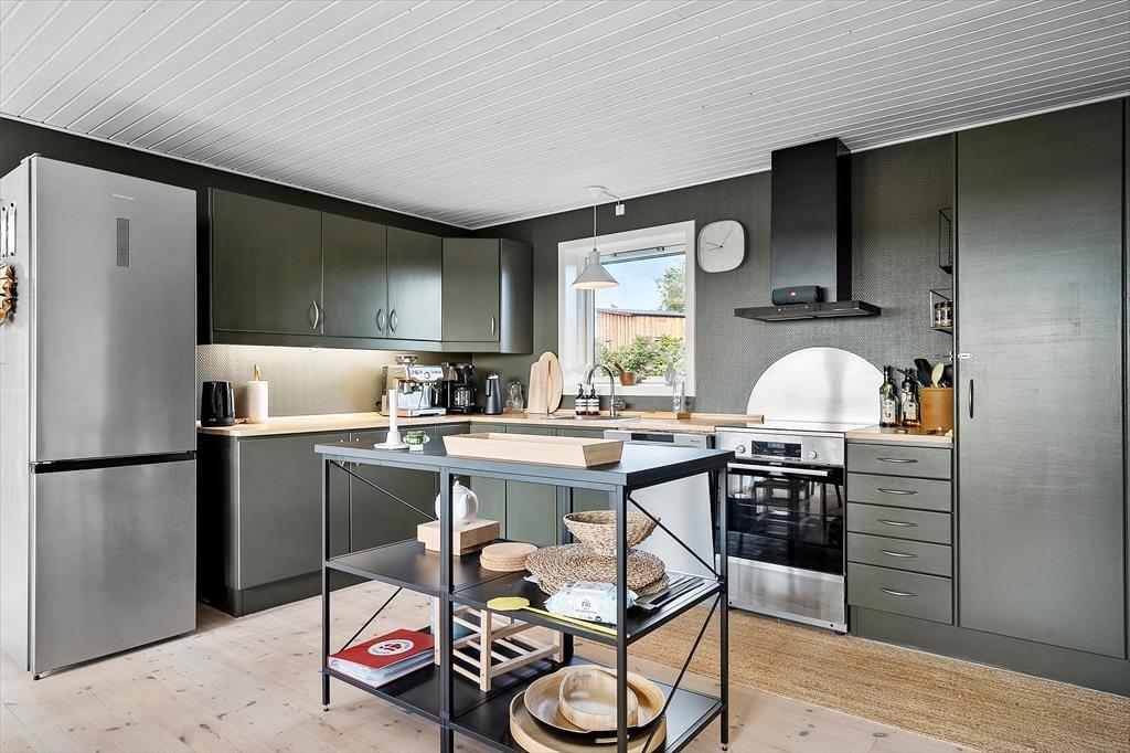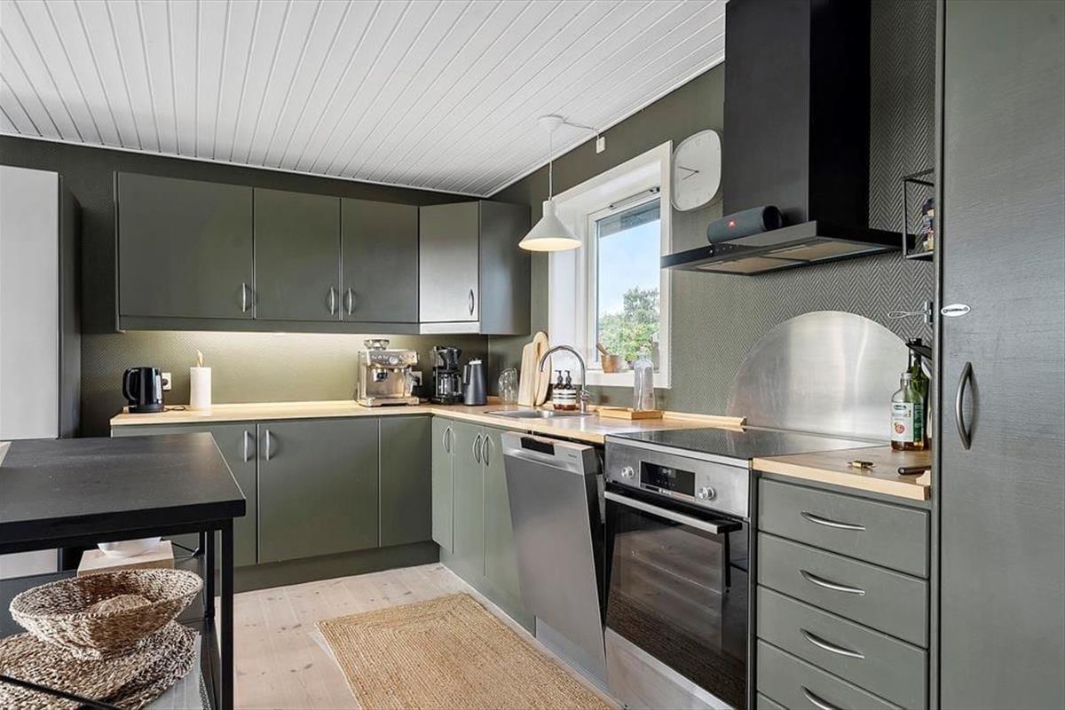 Die tolle Küche fügt sich offen in den Wohnraum ein. Sie umfasst unter anderem einen Herd, einen Backofen, einen Dunstabzug, eine Kaffeemaschine, einen Wasserkocher, einen Geschirrspüler, einen Kühlschrank, einen Tiefkühler sowie Küchenutensilien, Geschirr, Besteck und dergleichen.