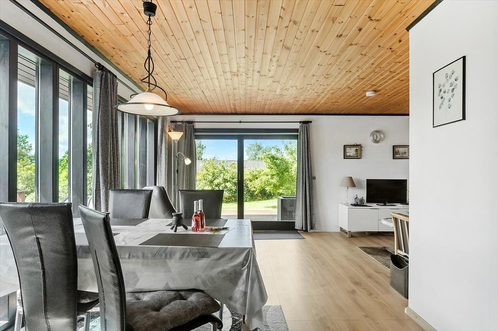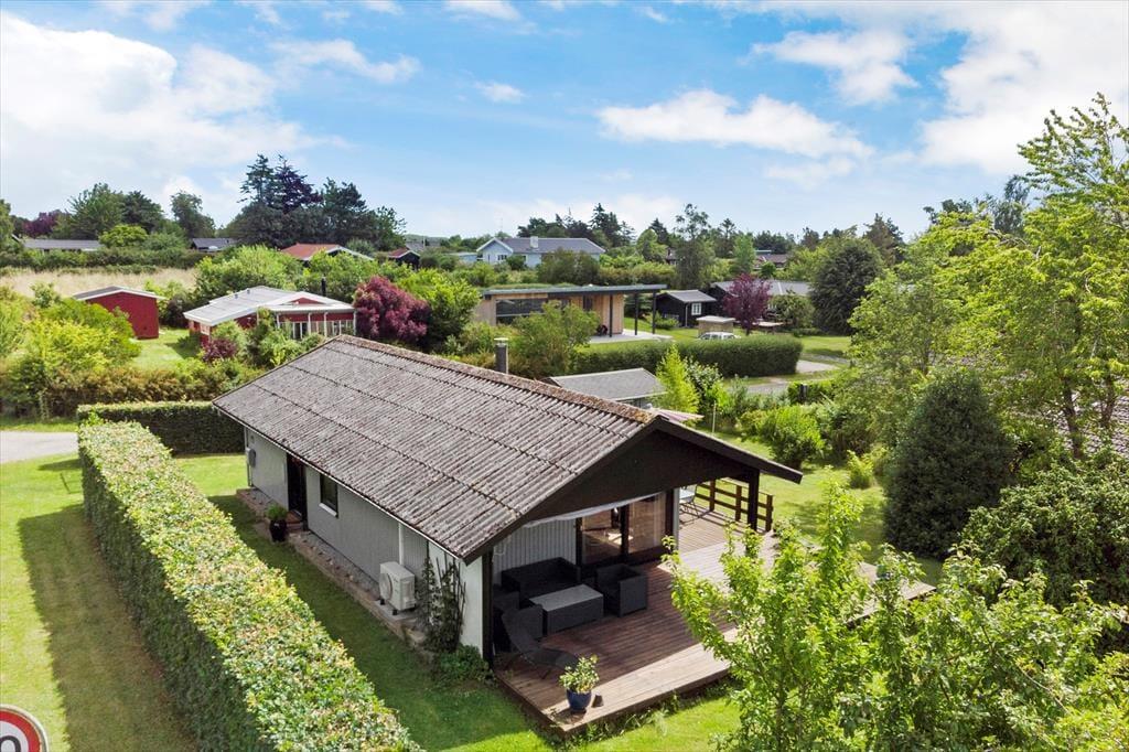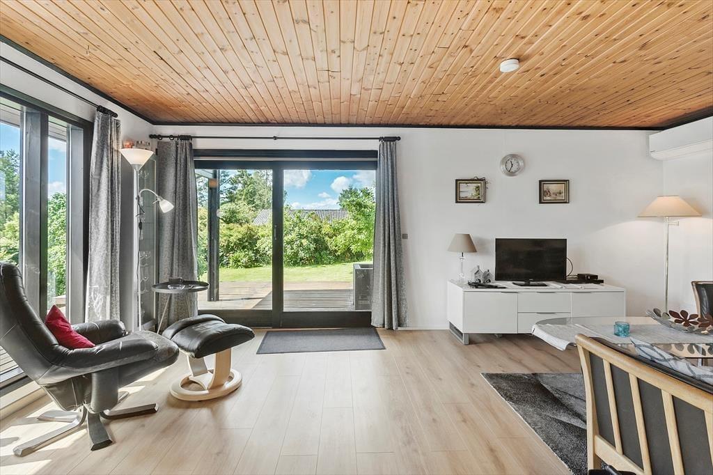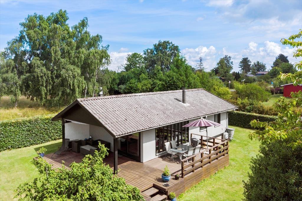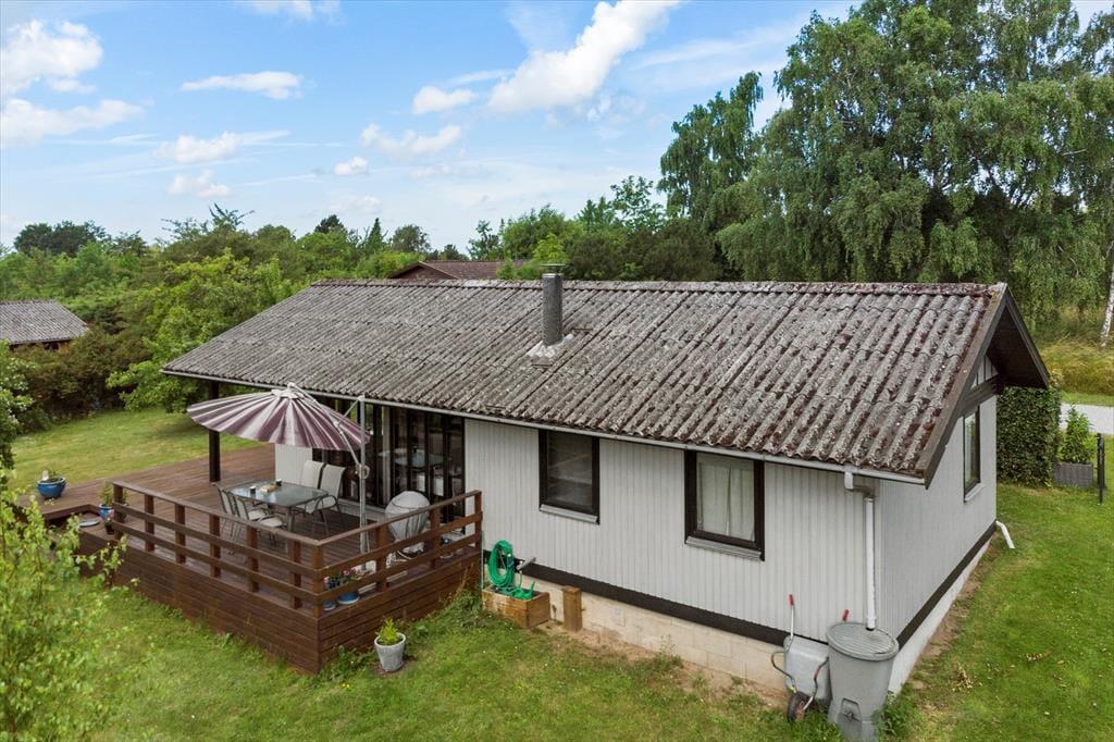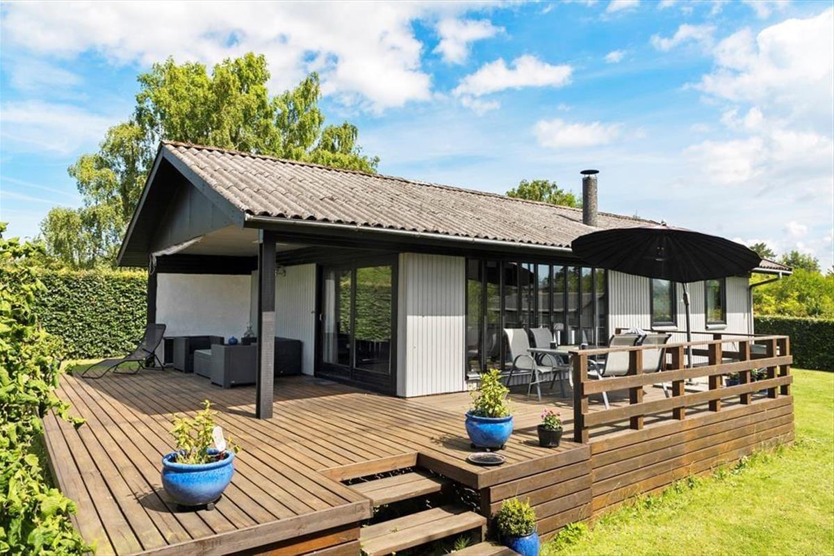Das Ferienhaus ist von einem schönen umschlossenen Garten umgeben. Vom Wohnzimmer aus hast du Zugang zu einer schönen, großen und teilweise überdachten Holzterrasse, auf der du die sonnigen Tage und den Sternenhimmel genießen kannst, wenn es dunkel wird. Der Garten ist sichtgeschützt und bietet dir viele Möglichkeiten, die Sonne zu genießen.