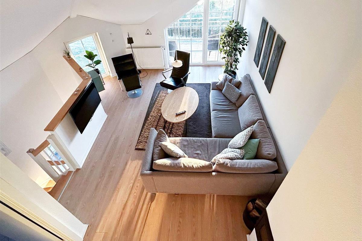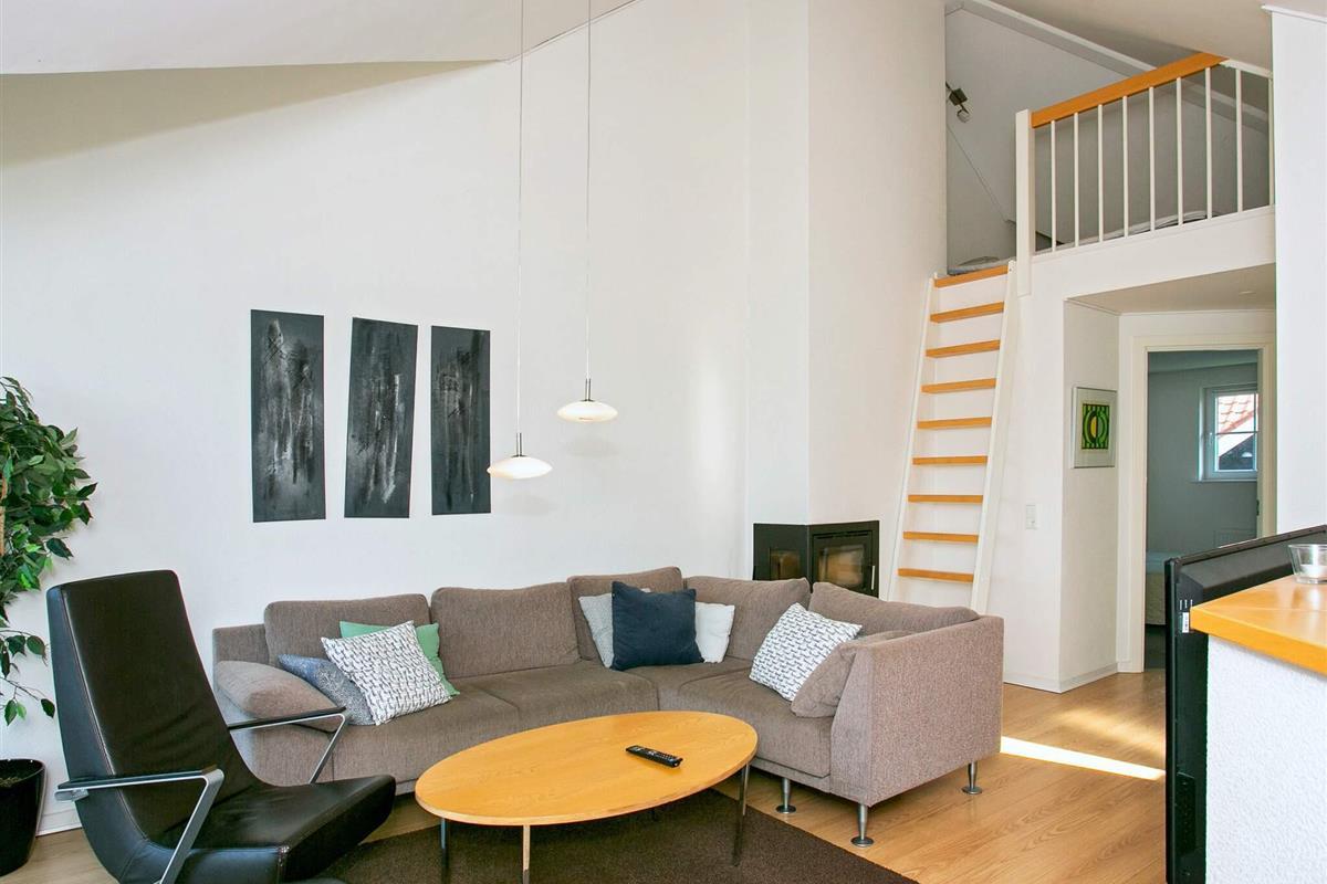 Im Obergeschoss befindet sich ein gemütliches Wohnzimmer mit Holzofen und Zugang zu einem zweiten Balkon, von dem aus Sie die umliegende Landschaft genießen können. Auf dieser Ebene befinden sich außerdem zwei weitere Schlafzimmer und ein Badezimmer mit Dusche, sodass sich die Wohnung für Familien oder kleine Gruppen eignet.