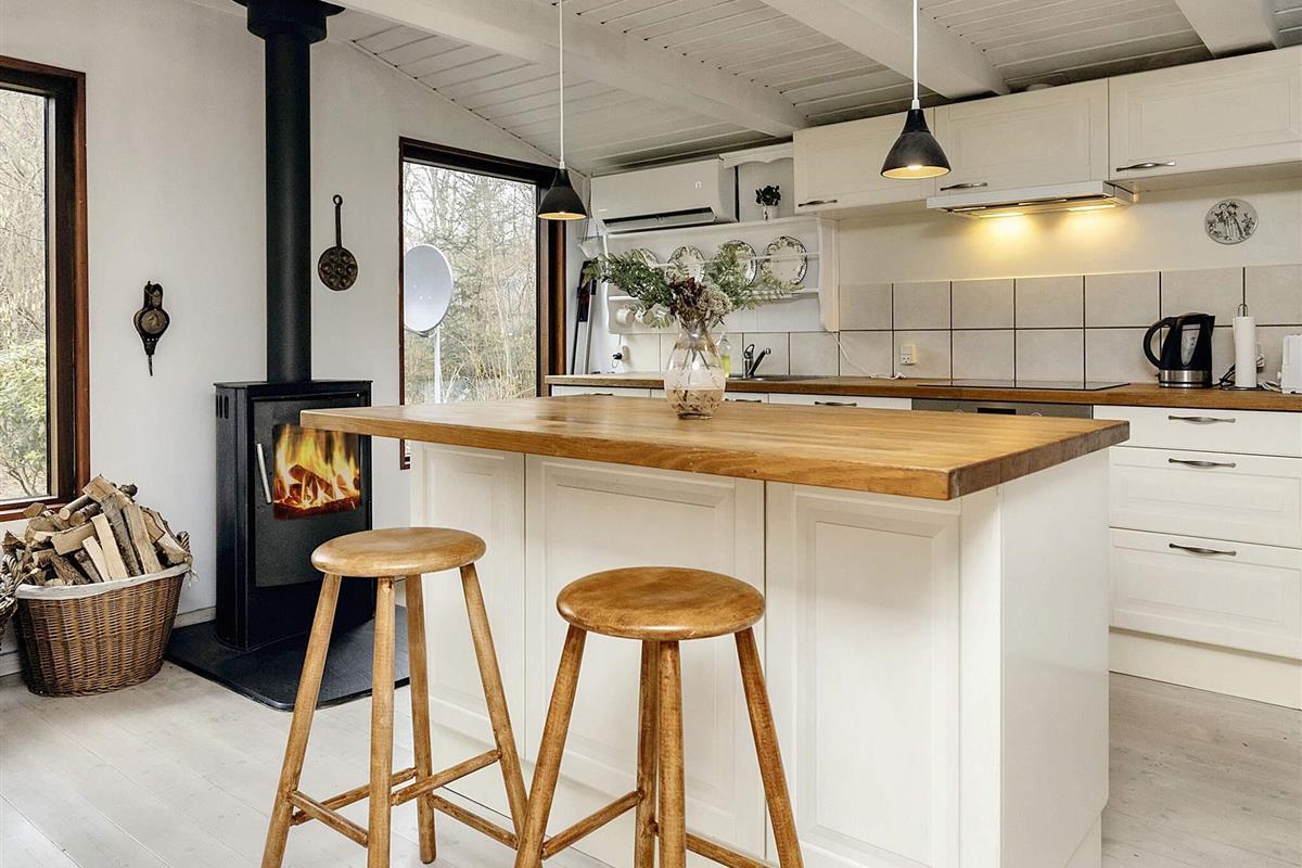 Mit etwas Glück können Sie vom Haus aus diverse Wildtiere, darunter Rehe, Hasen, Fasane, Eichhörnchen und Kleinvögel beobachten. Der Holzofen, die Arbeitsinsel und die Korbstühle verleihen der Wohnküche eine gemütliche Atmosphäre. Die gut ausgestattete Küche bietet u.a. Kühl-Gefrier-Kombi, Cerankochfeld, Geschirrspüler und Mikrowelle. Im Haupthaus befinden sich die Dusche und das geräumige WC sowie ein kleines Schlafzimmer. Nebenan in den beiden separaten Annexen gibt es weitere Schlafplätze und Platz für Ruhe und Erholung.