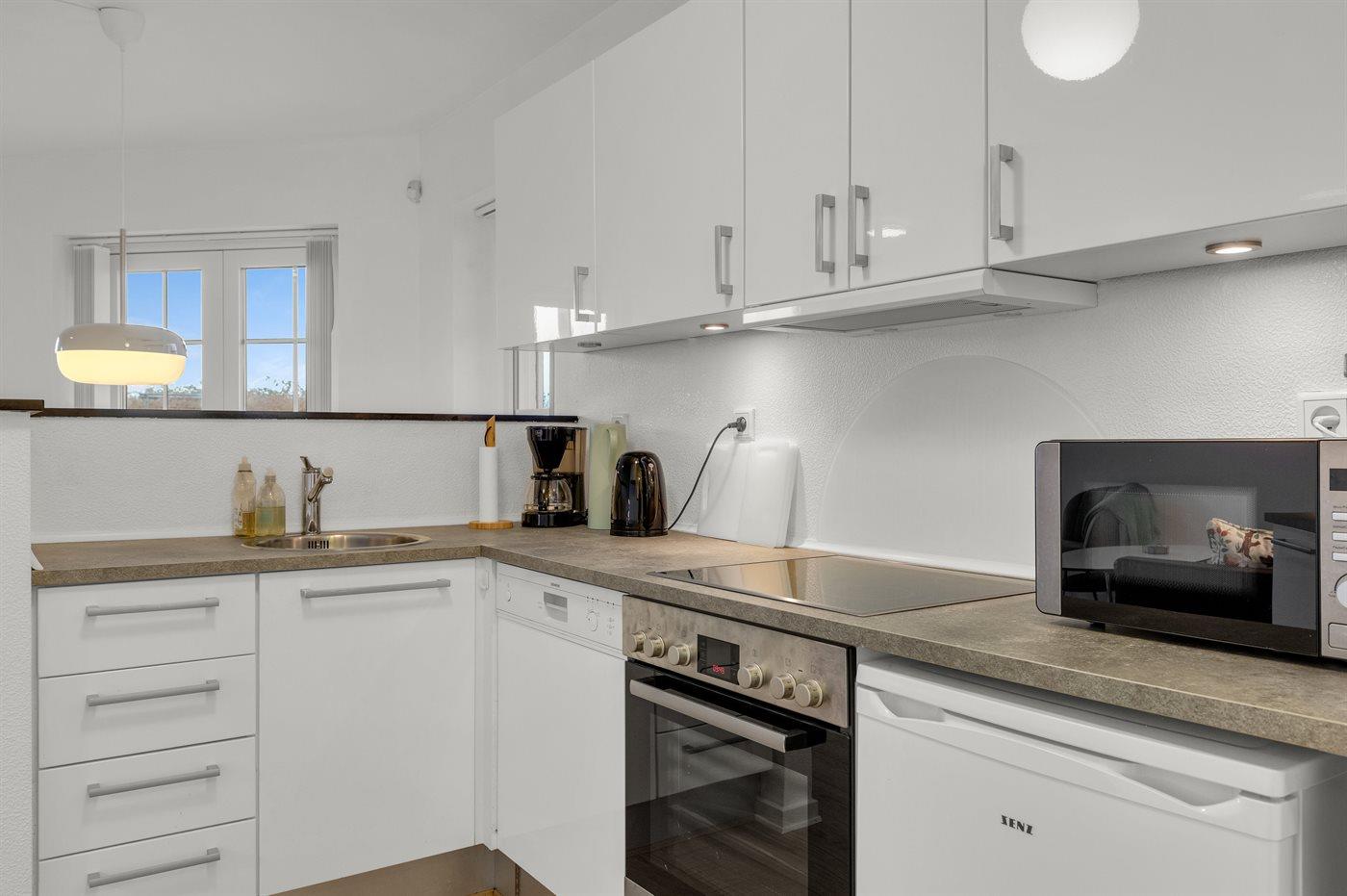 De keuken is uitgerust met koelkast Er zijn 4 keramische kookplaten, heteluchtoven, magnetron en vaatwasser.