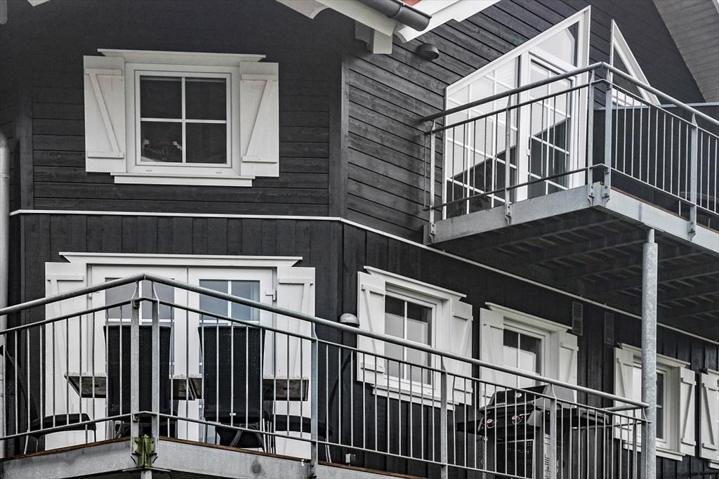 Im zweiten Stock treffen Sie auf einen kleinen Balkon und einen großen, gemütlichen Wohnraum, in dem ein ganz neuer 50" Samsung Smart TV für viel Unterhaltung und Abwechslung sorgt. Darüber hinaus erwarten Sie ein Schlafraum mit einem Doppelbett, Schränken und Stühlen sowie ein Schlafraum mit zwei Einzelbetten und Schrankfläche. Eine Leiter führt Sie vom Wohnraum hinauf auf einen Hängeboden mit zwei zusätzlichen Schlafgelegenheiten. Im Wohnraum zaubert ein Bio-Ofen ein Maximum an Gemütlichkeit. Diesen müssen Sie nicht mit Holz beheizen, können aber dennoch die romantisch flackernden Flammen hinter der Scheibe bewundern.