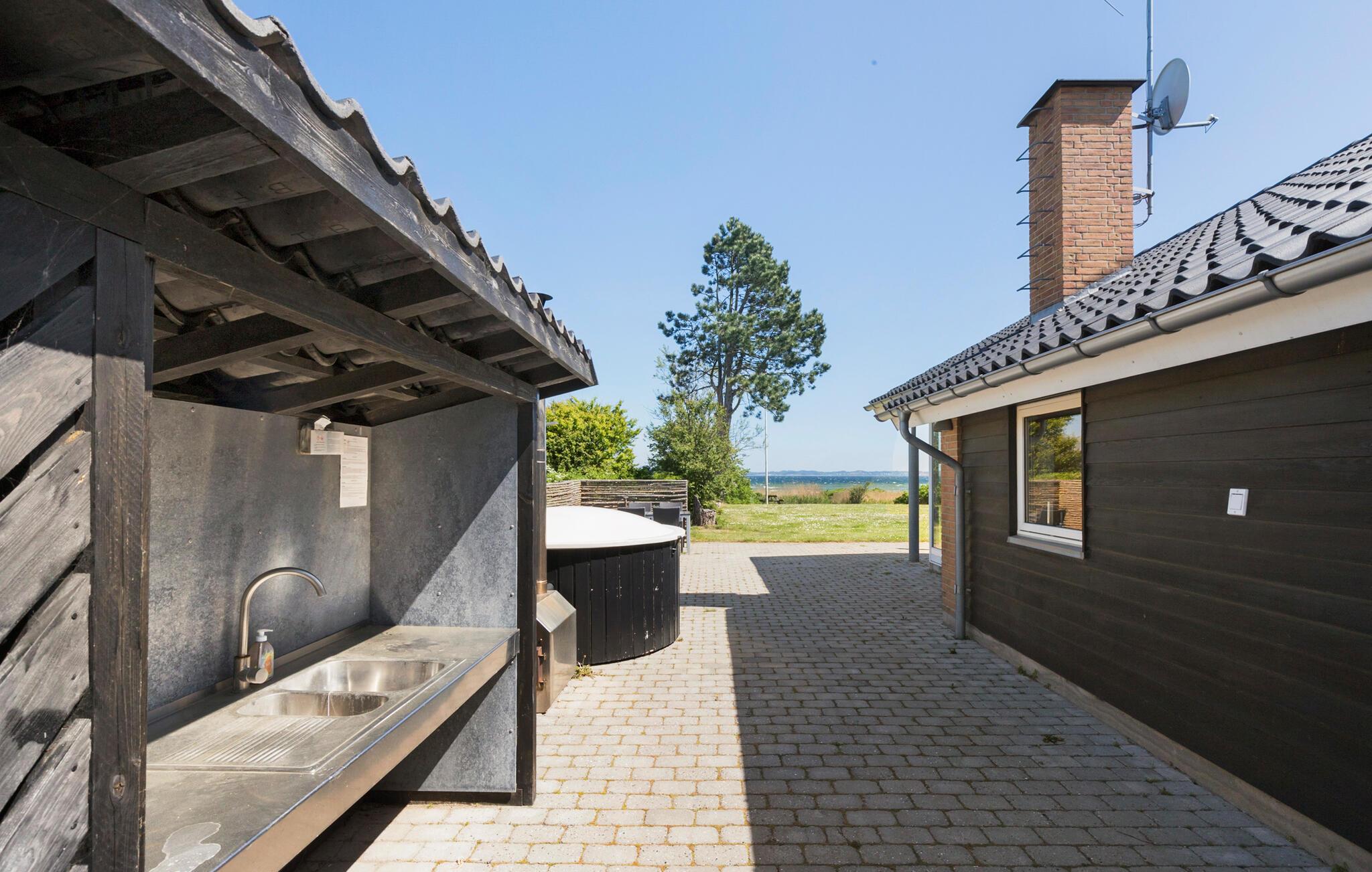 Je kunt van 's ochtends vroeg tot 's avonds laat buiten vertoeven op het overdekte terras. Na een mooie zomerdag is er niets beter dan een avonddip in de ruime, houtgestookte hot tub, die een prachtig uitzicht biedt op Ebeltoft Vig.