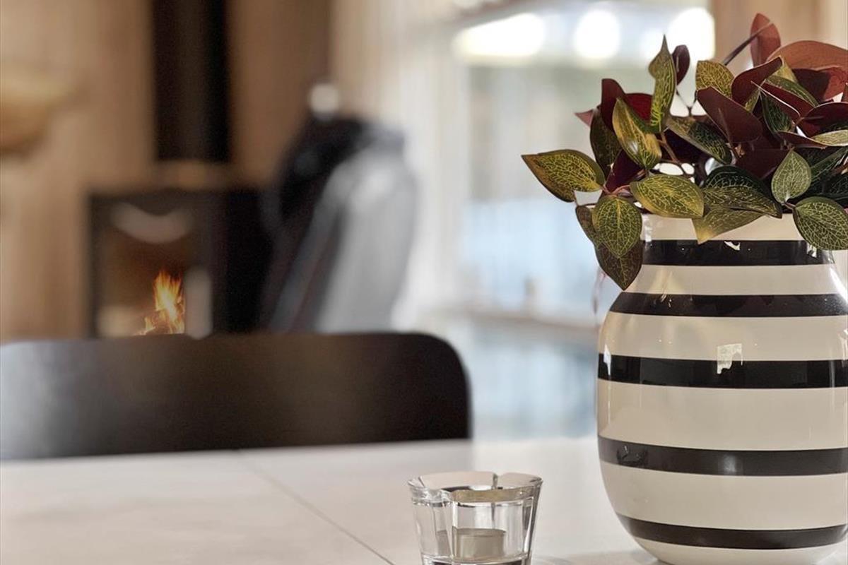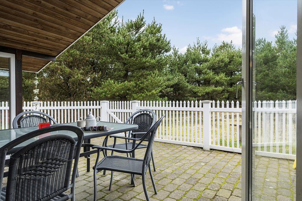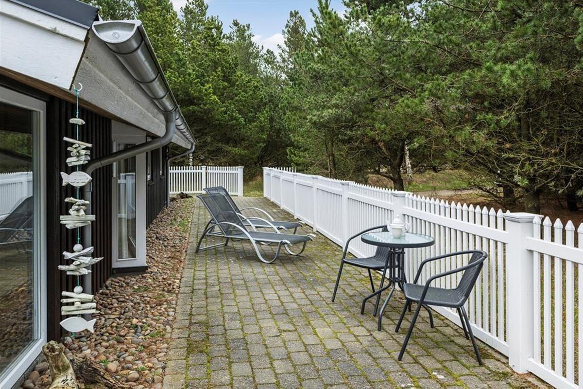 Eine große und schöne Terrasse, die von einem weißen Zaun abgeschirmt ist, schmiegt sich an der Ost-, Süd- und Westseite um das Haus. Mit anderen Worten, man findet fast den ganzen Tag über einen sonnigen Ort – und egal welchen Platz man wählt, so ist man von Bäumen umgeben, die einen schönen Rahmen und den Außenbereich bilden.