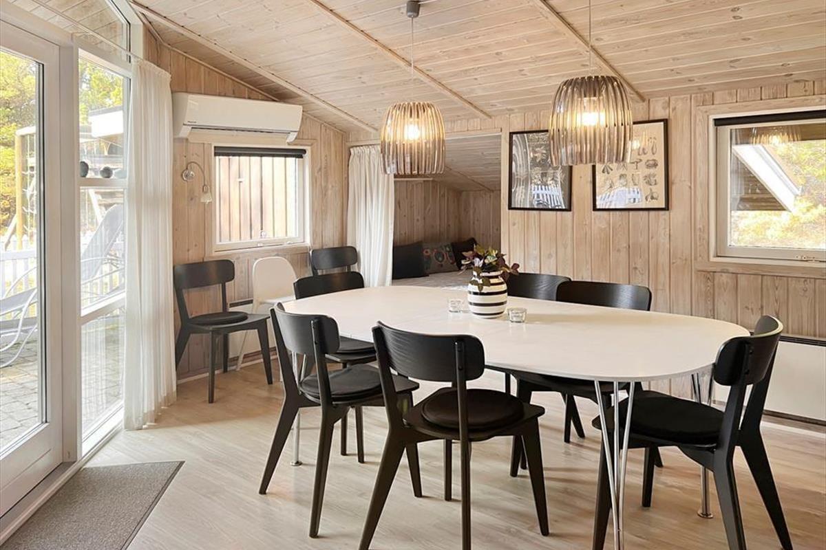 Das Ferienhaus ist mit 3 Schlafzimmern ausgestattet, so dass der Alkoven im Wohnbereich nicht unbedingt zum Übernachten benutzt werden muss. Stattdessen kann er als Kuschelecke dienen, wenn man einen Mittagsschlaf machen oder sich einfach nur ausruhen möchte, während man ein Buch oder die Zeitung liest. Man kann sich selbstverständlich auch in der Sofaecke niederlassen oder sich an den Esstisch setzen – hier hat man übrigens eine tolle Aussicht auf die grünen Kiefern des Grundstücks, die eine schöne Kulisse für gemütliche Stunden darstellen. Möchte man völlig abschalten, kann man sich mit einem Besuch im Whirlpool und in der Sauna verwöhnen, welche sich im Badezimmer befinden.