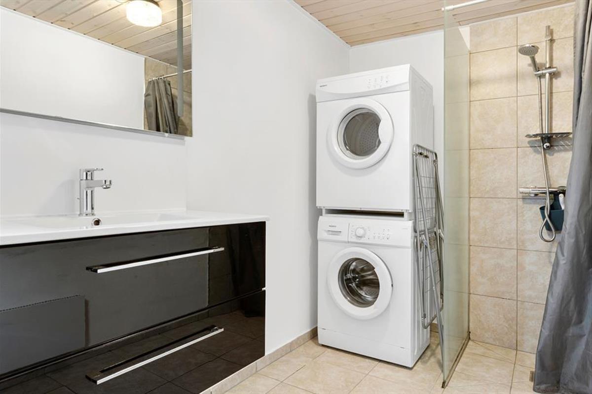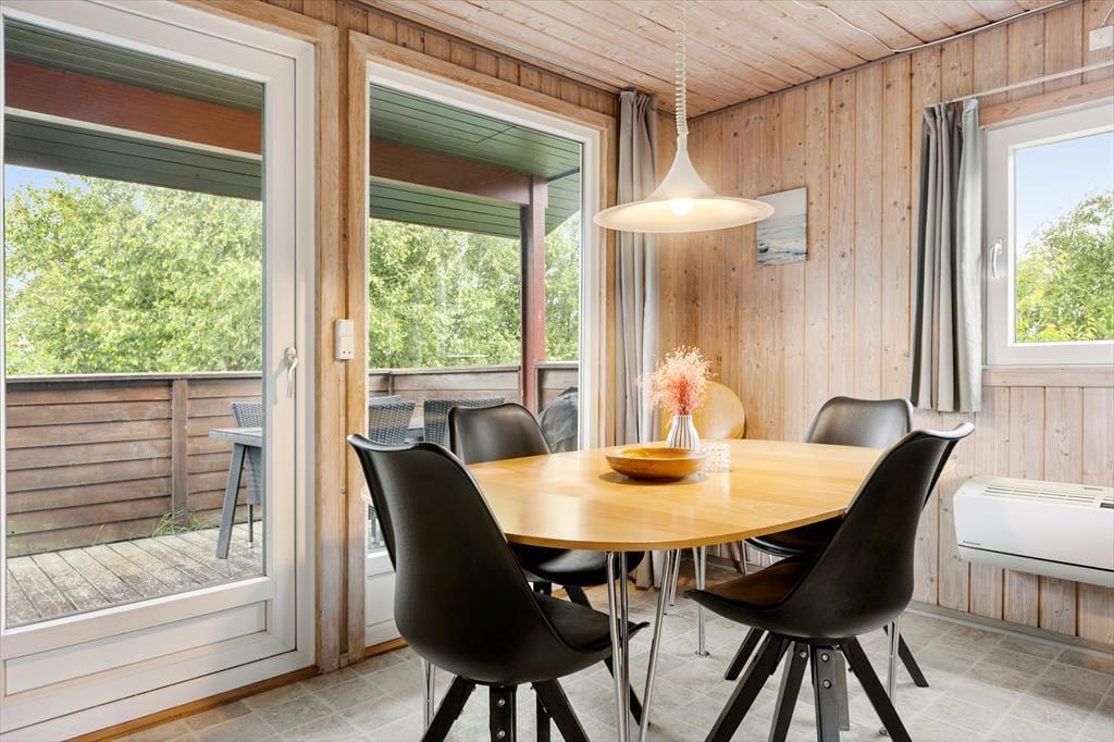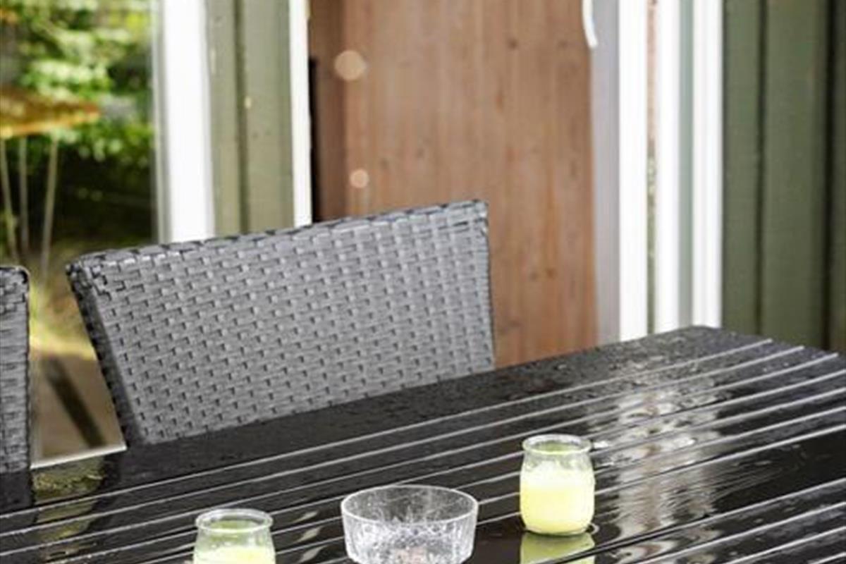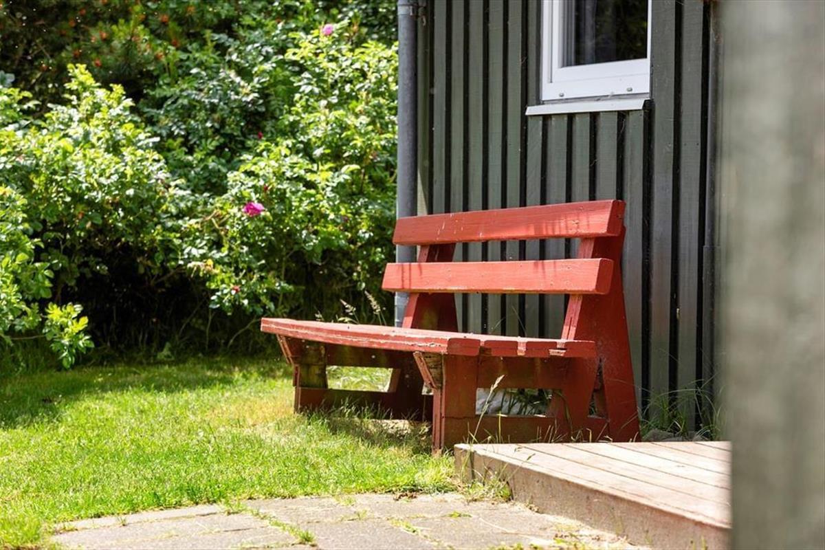 Die Außenbereiche sind besonders schön, denn es gibt viel Platz auf dem Naturgrundstück, und Heckenrosen und andere Pflanzen schirmen Terrassen und Spielmöglichkeiten gut ab, sodass du und deine Familie das süße Urlaubsleben in ungestörten Umgebungen genießen könnt. Es gibt Terrassen nach Osten und Westen, und du kannst dich auch auf die rote Bank neben dem Haus setzen, wenn du Gras unter den Füßen spüren möchtest, während du deinen Vormittagskaffee trinkst. Auf einer Grasfläche gibt es einen Sandkasten und ein Spielgerüst mit Schaukeln und Rutsche, sodass die Kinder beschäftigt sind, während die Erwachsenen den Grill anwerfen und ein kühles Getränk genießen, bevor es Zeit zum Essen ist.
