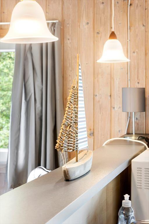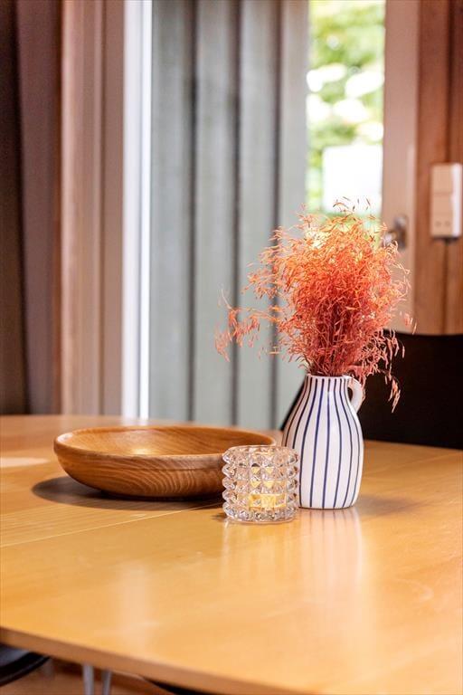 Das Sommerhaus hat ein hübsches Äußeres mit begrüntem Dach und dunkelgrüner Holzfassade, und drinnen ist es gemütlich. Die Küche ist mit dem Wohnzimmer offen verbunden, sodass du, selbst wenn du mit dem Backen von Brötchen oder dem Schälen von Kartoffeln beschäftigt bist, gleichzeitig die Nähe zur Familie genießen und mit deinem Partner plaudern kannst. Der Esstisch ist ein gemütlicher Ort für Gesellschaftsspiele und leckere Mahlzeiten, und im komfortablen Sofa-Bereich habt ihr viel Platz, um Seite an Seite zu entspannen. Ein Badezimmer und drei Schlafzimmer gehören zur Raumaufteilung, sodass insgesamt sechs Personen Platz haben – und zwei Hunde sind übrigens auch im Haus willkommen.
