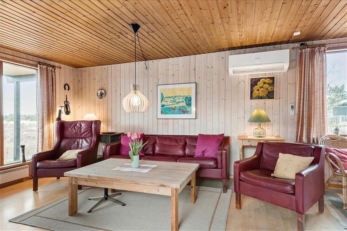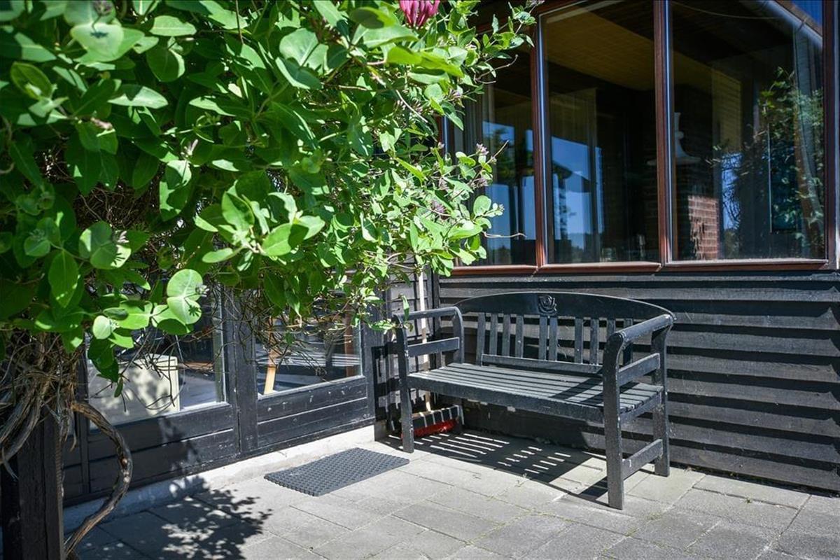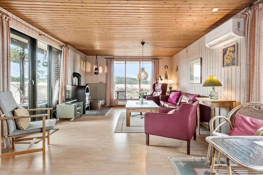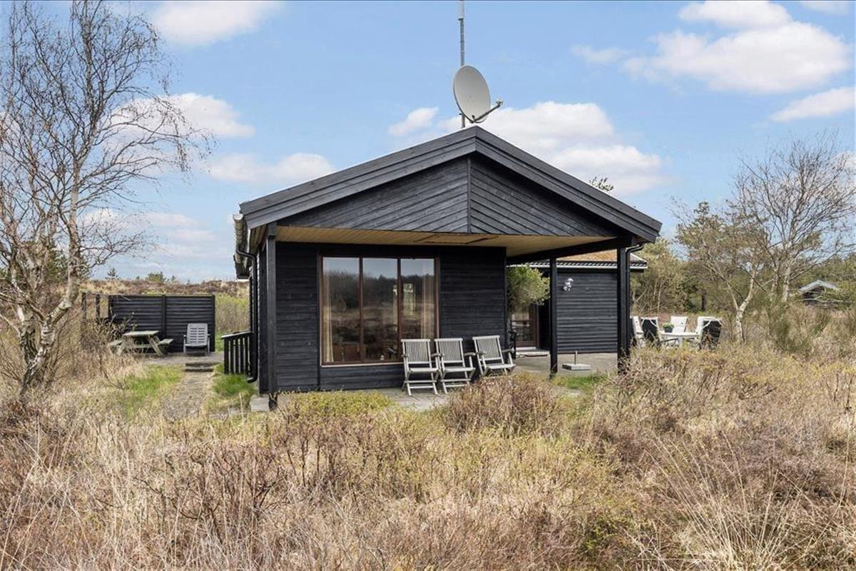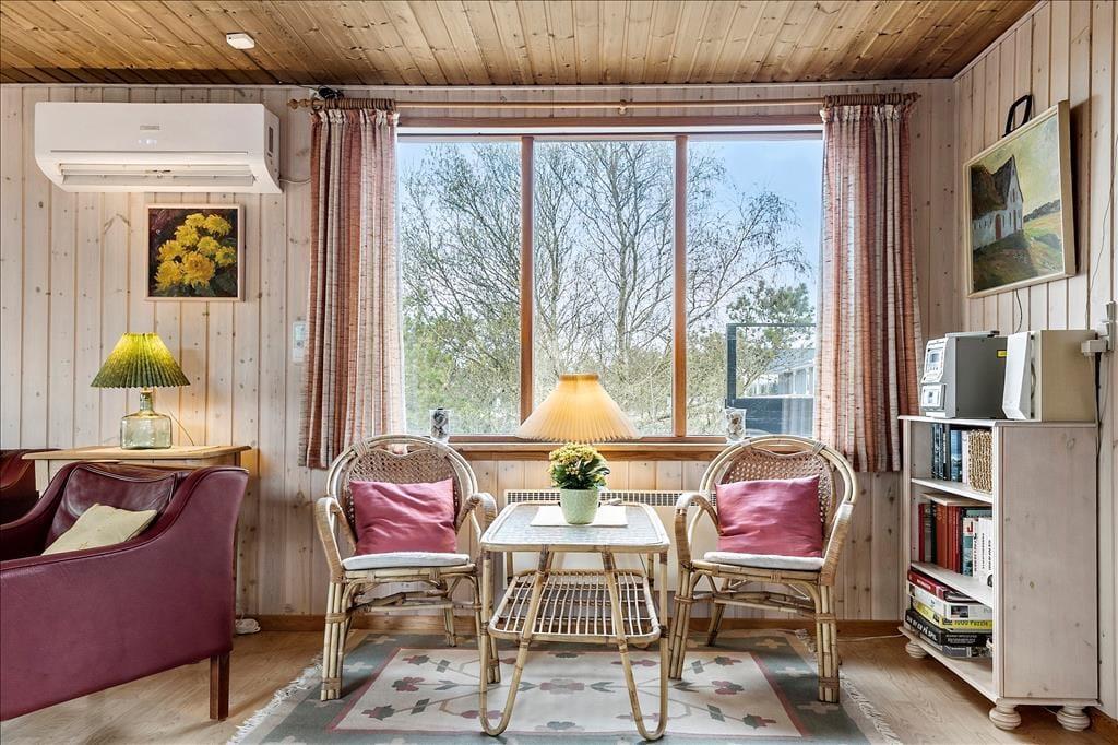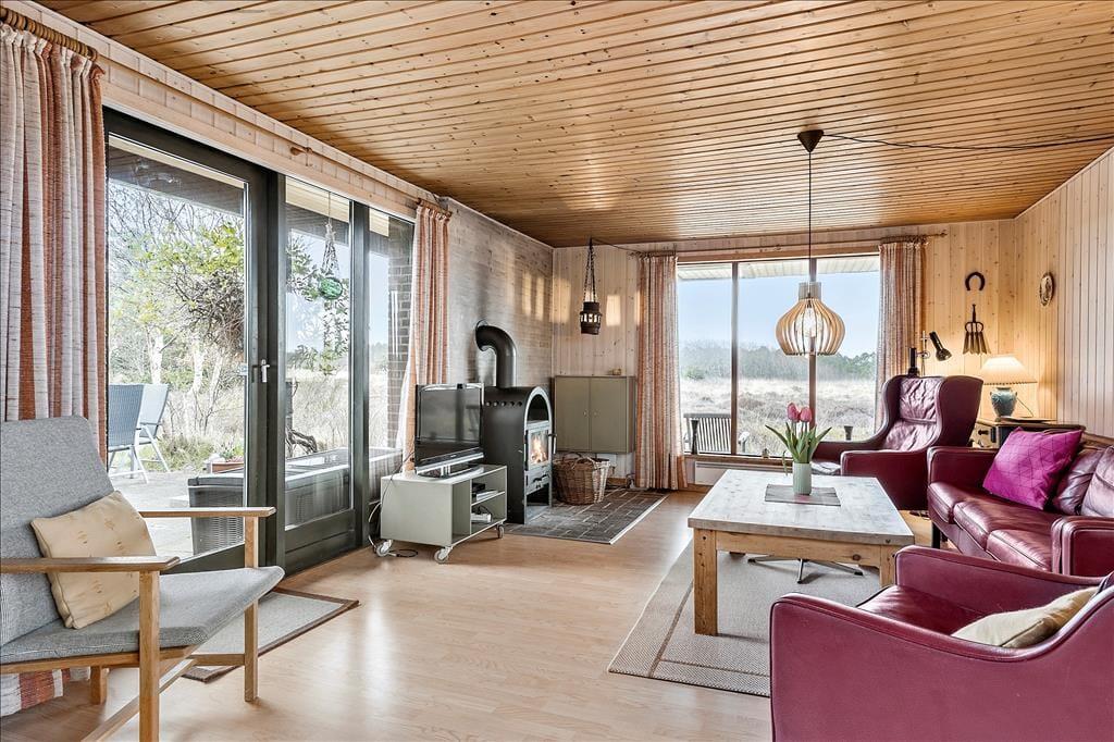 Wenn die Sonne scheint, empfiehlt es sich, den größten Teil des Urlaubstages im Freien zu verbringen, wo du mehrere Terrassen zur Auswahl hast. Ein Terrassenbereich ist überdeckt, und es stehen dir sowohl Gartenmöbel als auch Liegestühle, Grill und ein Sonnenschirm zur Verfügung. Das Beste ist jedoch, dass die Stunden der Erholung in einer unheimlich idyllischen Landschaft stattfinden: Ein Teppich aus Heidekraut und anderen wilden Pflanzen breitet sich über der flachen Landschaft aus, und in der Ferne kannst du die Kiefern der Tvismark Baumplantage erahnen.