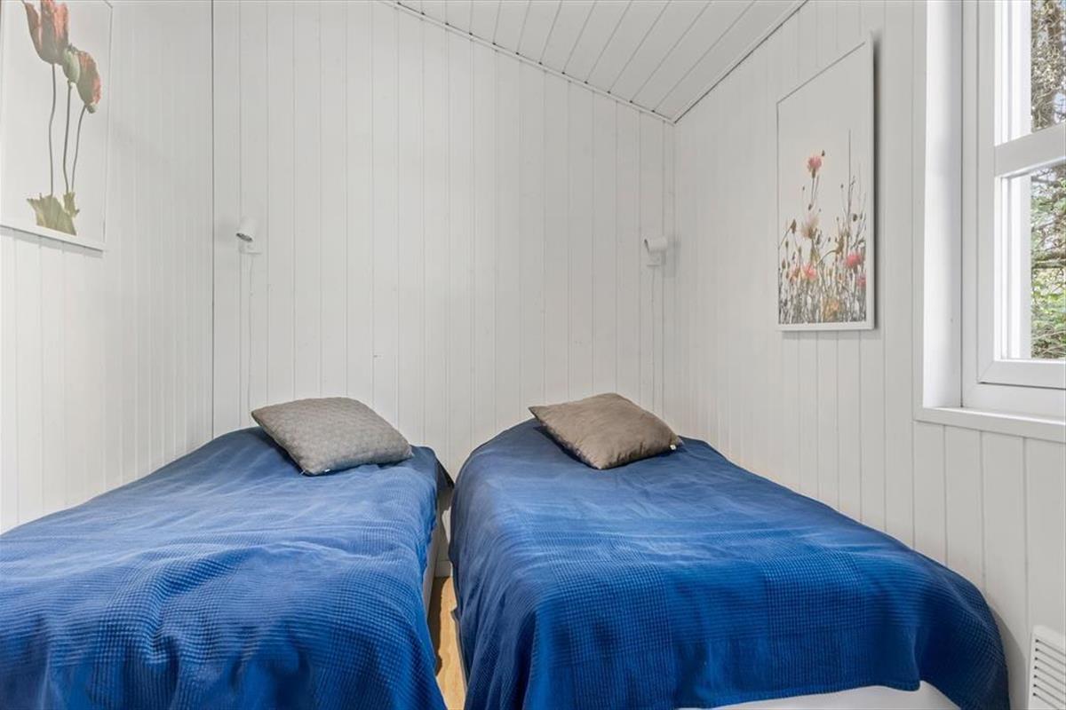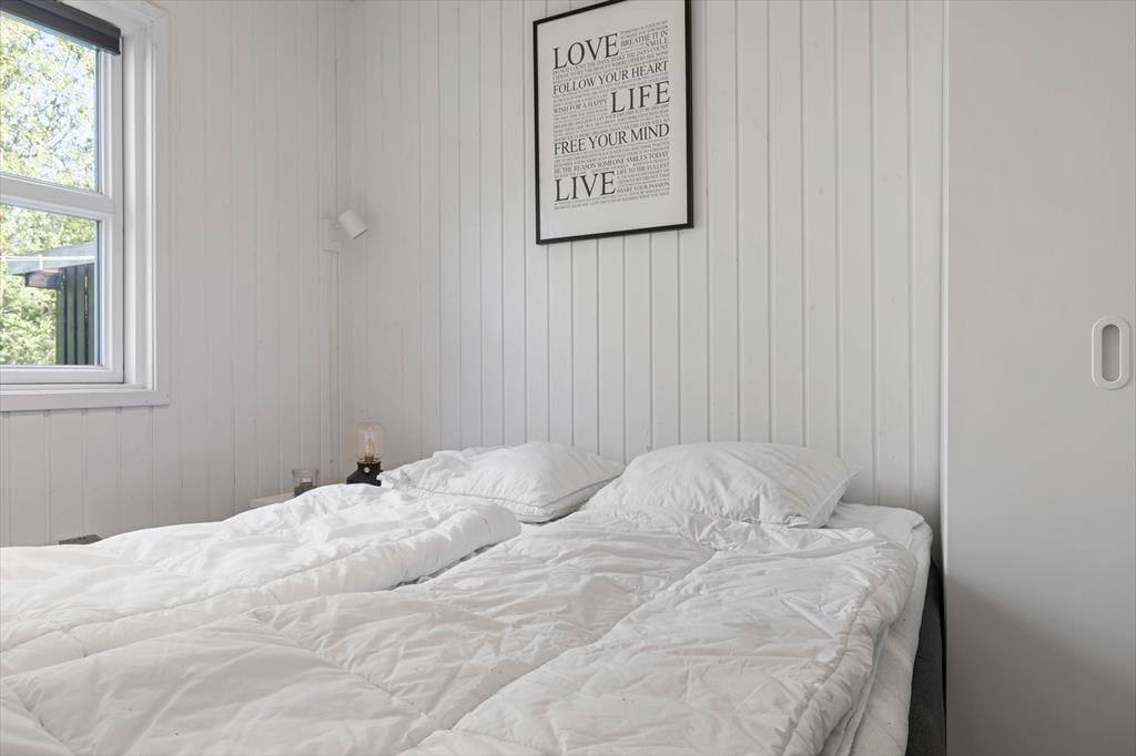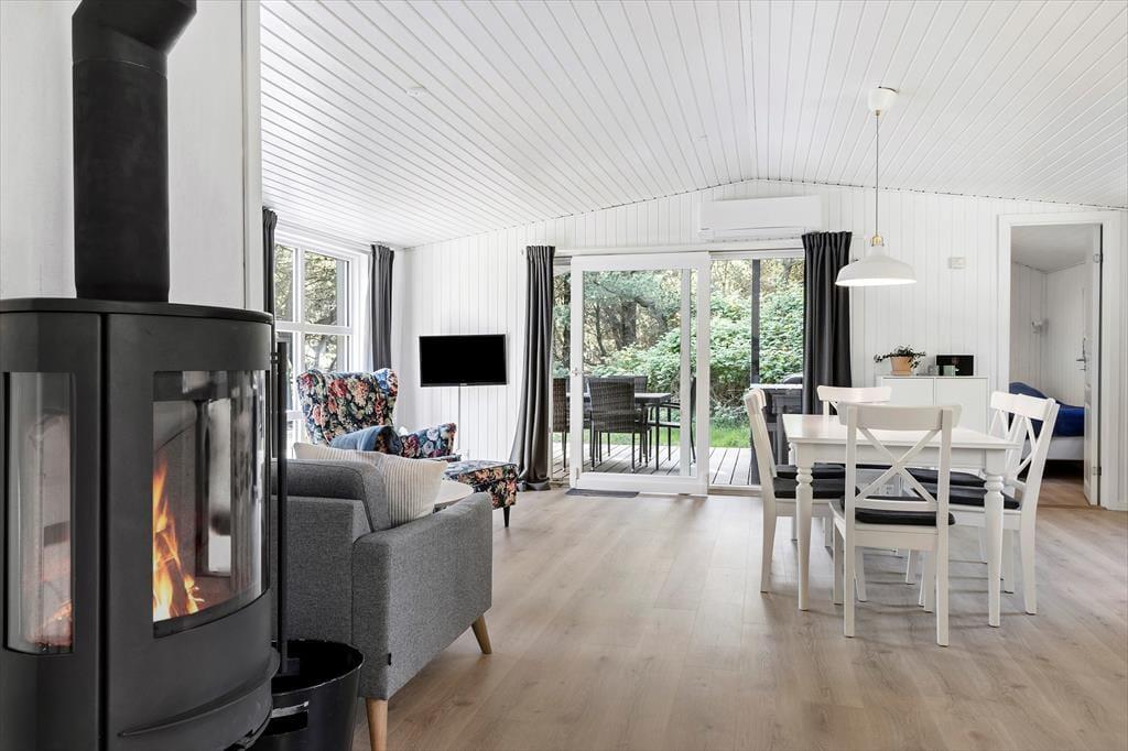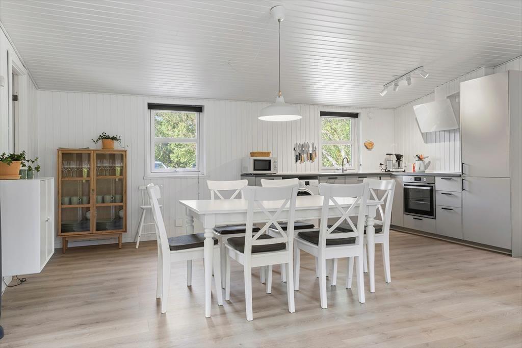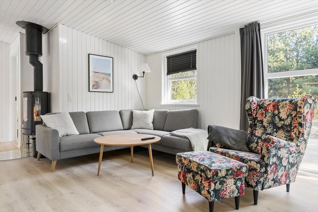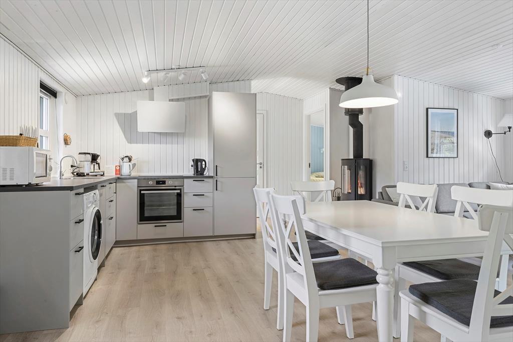 Dieses Ferienhaus präsentiert sich auf schöne und klassische Art und Weise mit grünem Dach, dunkler Holzfassade und weißen Fensterrahmen. Im Inneren des Hauses herrscht eine perfekte Ferienhausatmosphäre mit weißen Holzwänden und hoher Decke, und auch der Brennofen trägt mit seiner Wärme zur gemütlichen Stimmung bei. Im Aufenthaltsraum sind Wohnzimmer und Küche vereint, sodass du auch beim Kochen vom gemütlichen Beisammensein mit der Familie nicht ausgeschlossen bist. Über ein Badezimmer hinaus enthält der Grundriss auch eine Sauna, sodass du dich darauf freuen kannst, dich nach den Ausflügen des Tages zurücklehnen zu können, während du vollständig durchgewärmt wirst. Zur Nachtruhe kannst du dich auf drei Schlafzimmer verteilen, von denen eines mit einem Doppelbett und die anderen beiden jeweils mit zwei Einzelbetten ausgestattet sind.