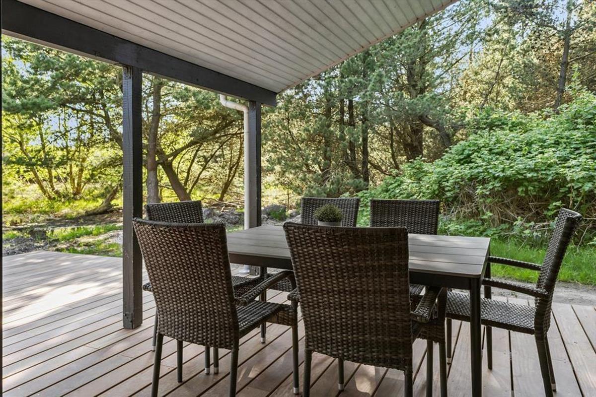 Wenn du dich nicht gerade in der Sofaecke im Wohnbereich oder in der Sauna entspannst, kannst du dich auch draußen auf der Südterrasse erholen, die über sowohl überdachte als auch offene Bereiche verfügt. Es stehen Liegestühle, Gartenmöbel und ein Grill zur Verfügung, sodass du es dir beim Sonnenbaden, Siesta halten und beim Grillen so richtig gemütlich machen kannst. Das Naturgrundstück liegt, dank der schönen Bäume und der anderen üppigen Vegetation, wunderbar ungestört.