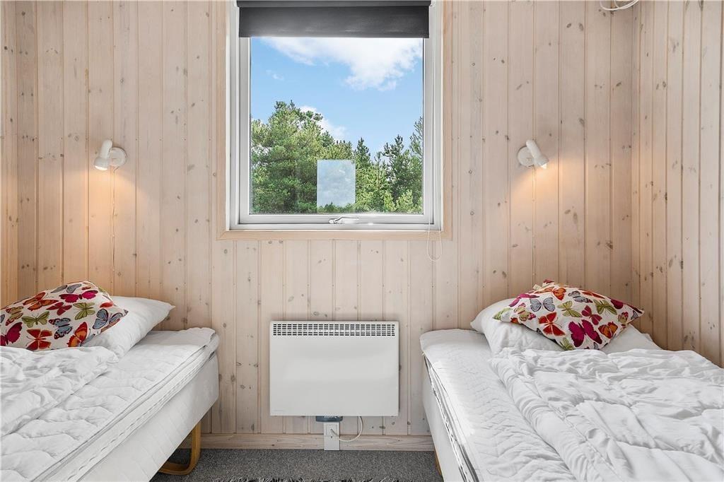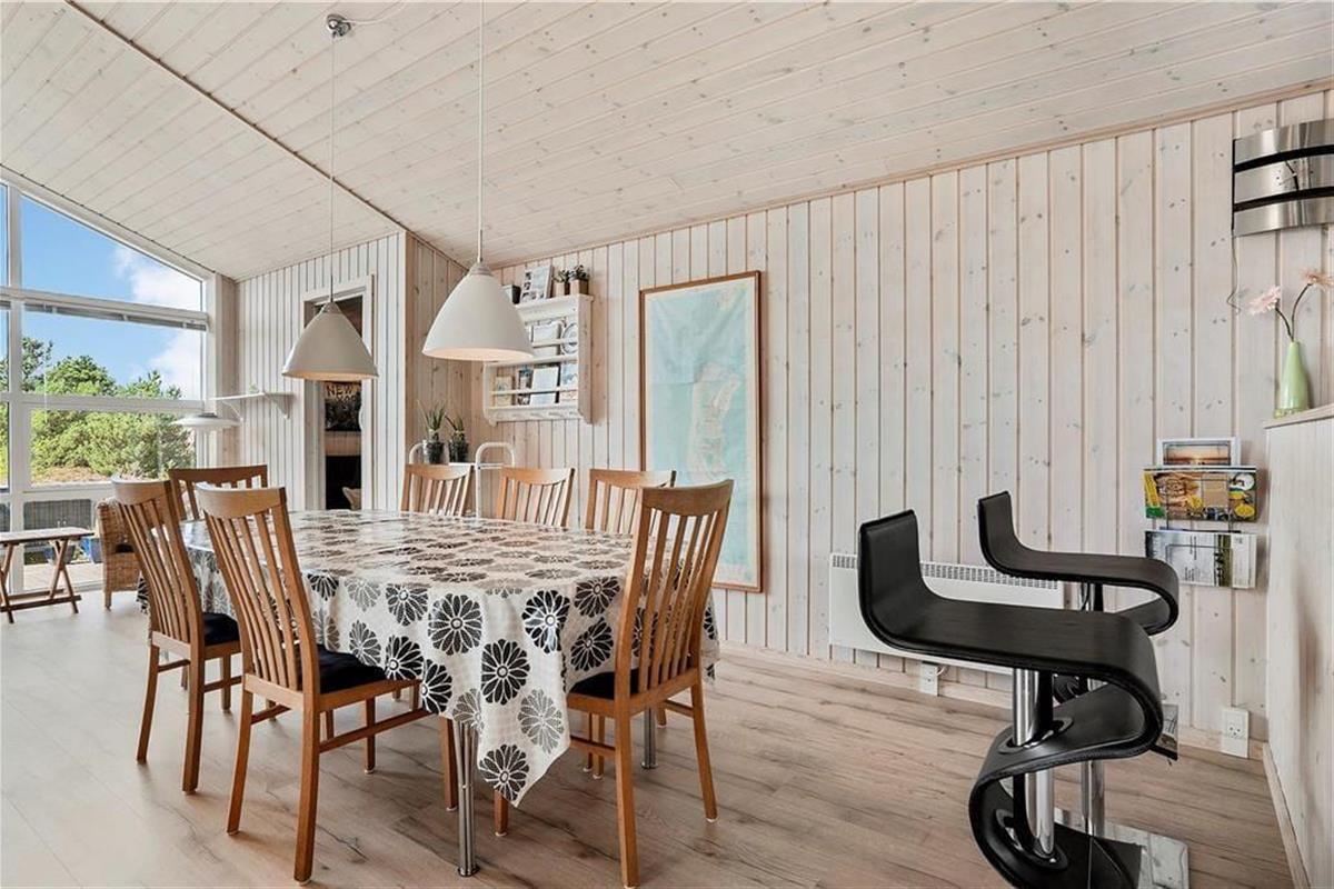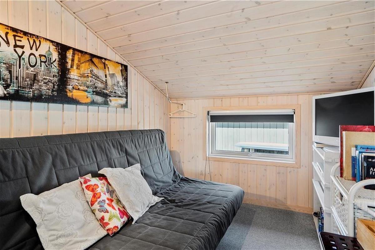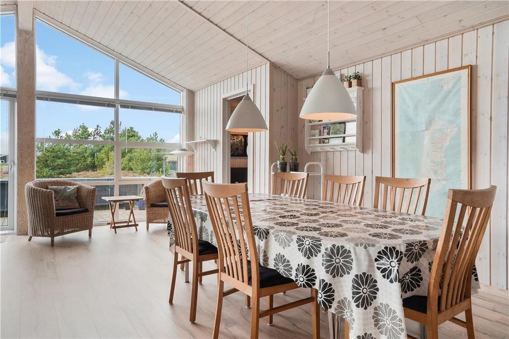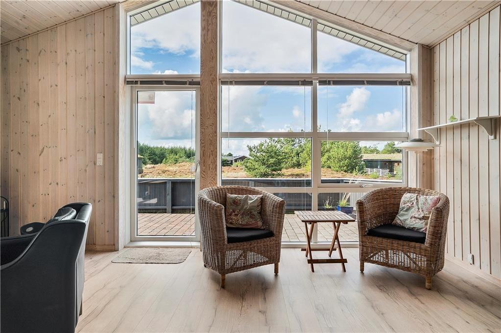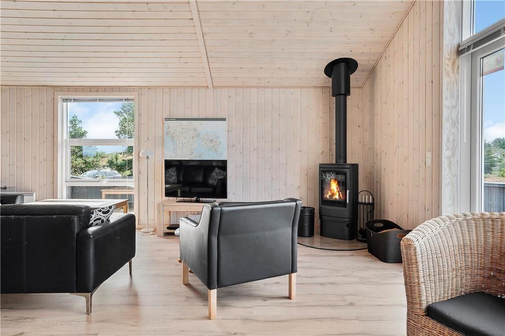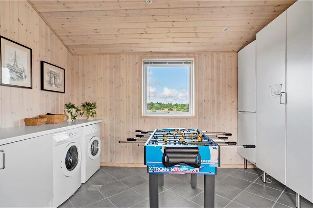 Das Innere des Hauses ist vom Sonnenlicht durchflutet, und die Fenster geben den Blick auf die umliegende Natur frei – ganz besonders vom großen Wohnbereich aus, in dem die nach Westen ausgerichtete Fensterpartie vom Boden bis zur Decke reicht. Die angenehme Atmosphäre im Wohnbereich, in dem die schöne Küche integriert ist, wird vor allem vom Brennofen und der geschmackvollen Einrichtung geprägt. Auch in den drei Schlafzimmern und im Badezimmer ist die Einrichtung einfach und stilvoll. Verbringst du deine Zeit nicht mit einem guten Buch oder einem spannenden Film, kannst du in einem der Zimmer zusammen PlayStation spielen. Ein weiteres, familienfreundliches Detail ist der Aktivitätsraum, der mit einem kombinierten Tischfußball-, Billard- und Tischtennisgerät ausgestattet ist. Hier können gemeinsam viele gemütliche Stunden verbracht werden, vielleicht sogar mit einem Wettkampf um den „Ferienmeister“-Titel.