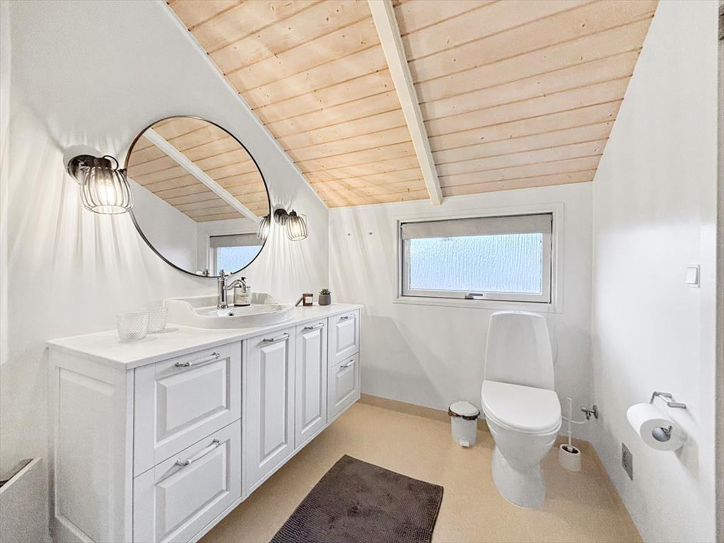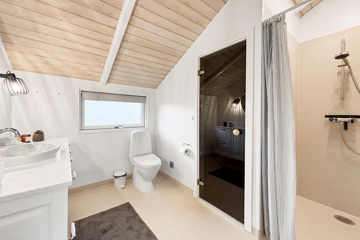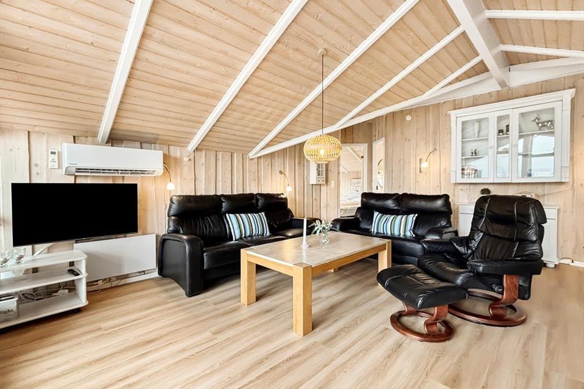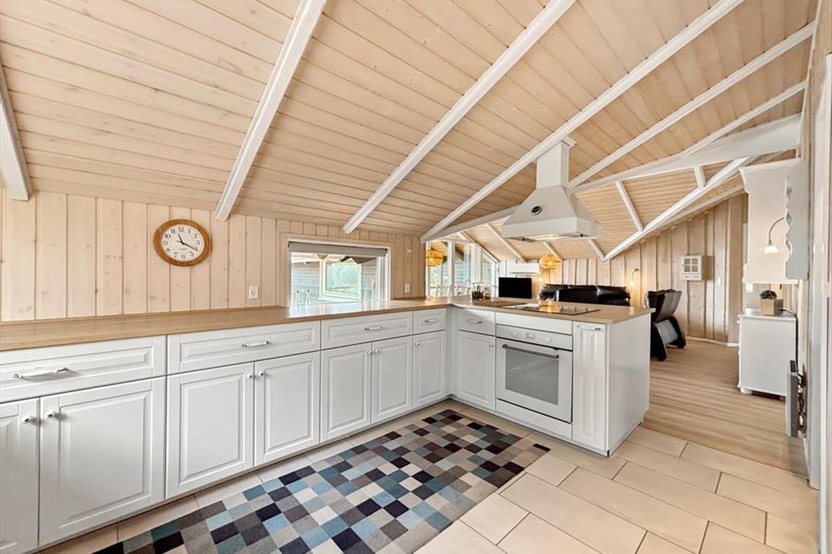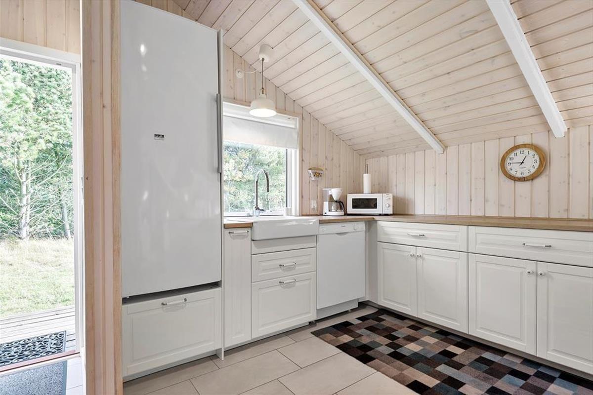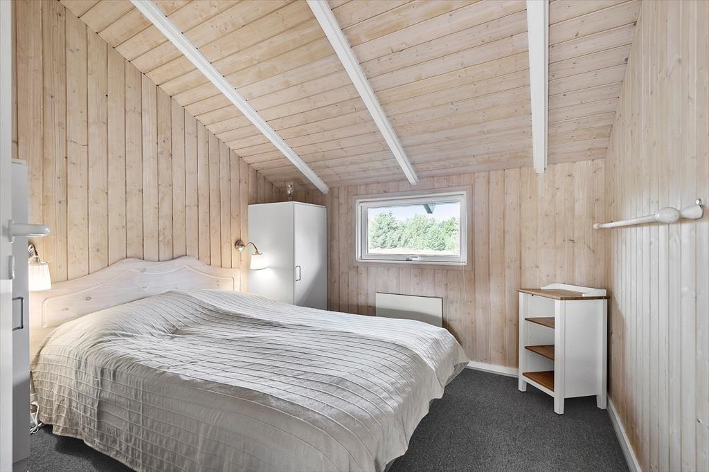 Mit seiner dunklen Holzfassade und dem bewachsenen Dach fügt sich das Sommerhaus fast in die malerische Umgebung ein. Auch drinnen im Wohnzimmer ist die Atmosphäre am schönsten, mit dem Spitzdach und hellen Holzleisten an den Wänden, und auch ein Holzofen gehört zu den Annehmlichkeiten des Hauses. Durch die offene Aufteilung des Hauses sind das Wohnzimmer und die Küche offen miteinander vereint, und durch die großen Fenster kannst du das Sonnenlicht und den schönen Blick über die schöne Landschaft genießen. Wie das Wohnzimmer sind auch die drei Schlafzimmer des Ferienhauses hell und einladend, ebenso das Gäste-WC und das Badezimmer, letzteres sogar mit Sauna.