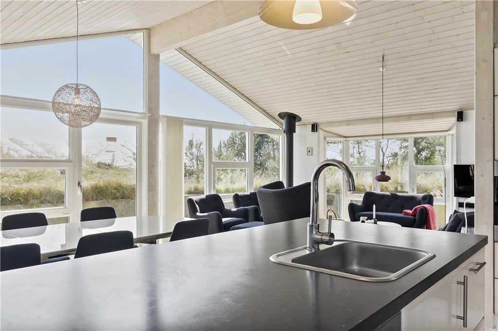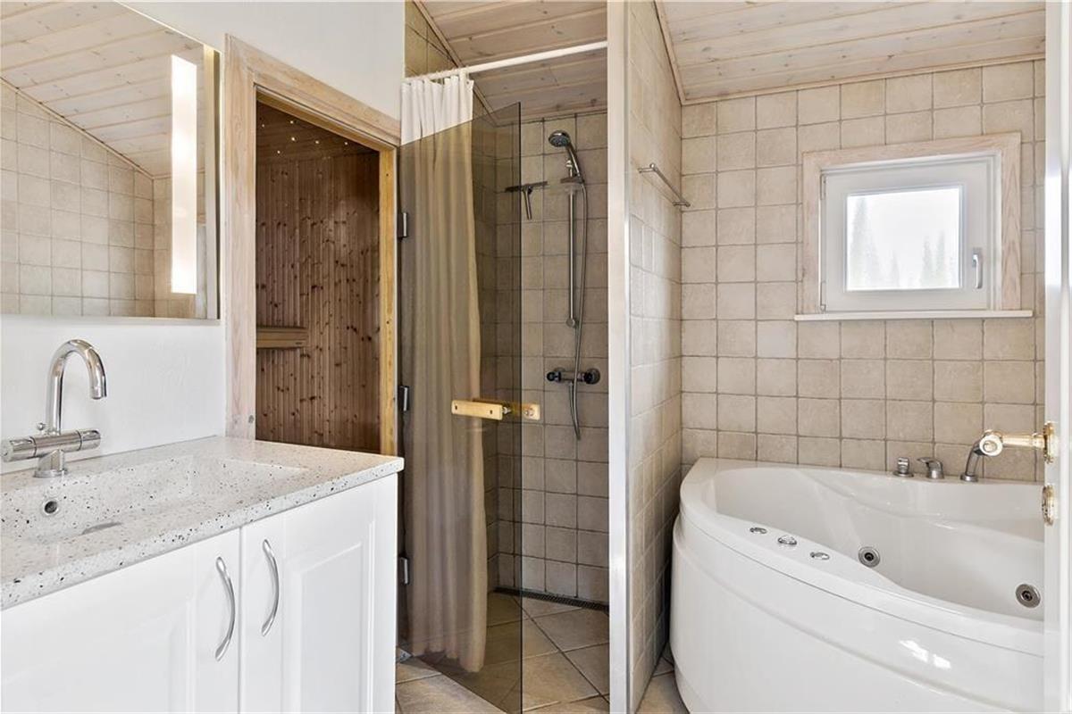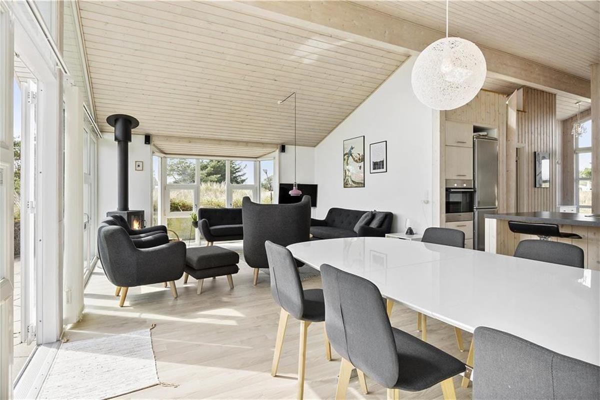 Komfort und Qualität sind eine passende Beschreibung für dieses Ferienhaus, denn im Inneren sind die hellen Räume mit Dachschrägen und großen Fenstern besonders einladend eingerichtet. Die holzgetäfelten Wände und der Brennofen im Wohnbereich gehören zum klassischen Ferienhauscharme und tragen zur gemütlichen Atmosphäre bei. Der offene Küchenbereich sowie der Whirlpool und die Sauna im Badezimmer sind hochwertige Details, die deinen Urlaub zu etwas ganz Besonderem machen. Insgesamt gibt es acht Schlafplätze: Zwei Schlafzimmer sind mit einem Doppelbett und eines mit zwei Einzelbetten ausgestattet, und auf dem Dachboden können bis zu zwei Personen schlafen.