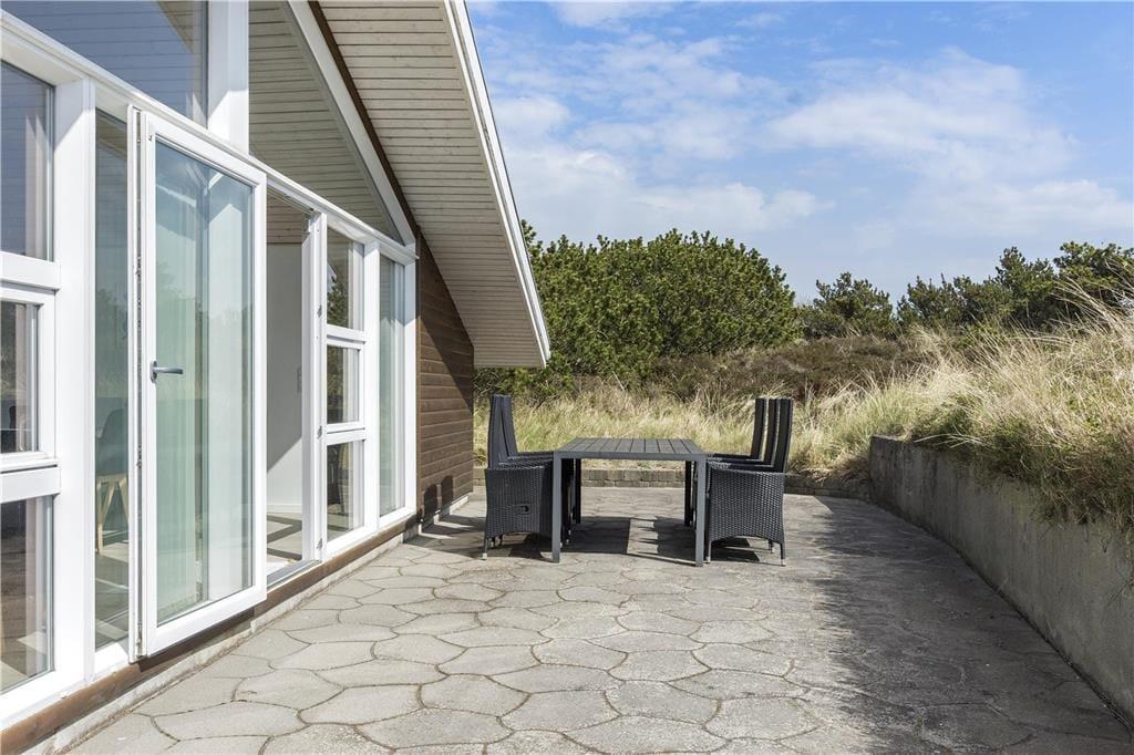 Rund um das Ferienhaus erstreckt sich eine schöne geflieste Terrasse, sodass du dich dort aufhalten kannst, wo die Sonne am besten scheint. Der nach Süden ausgerichtete Teil der Terrasse liegt leicht abgesenkt und geschützt auf dem hügeligen Naturgrundstück, sodass Sonnenbaden und Grillabende ganz ungestört stattfinden können.