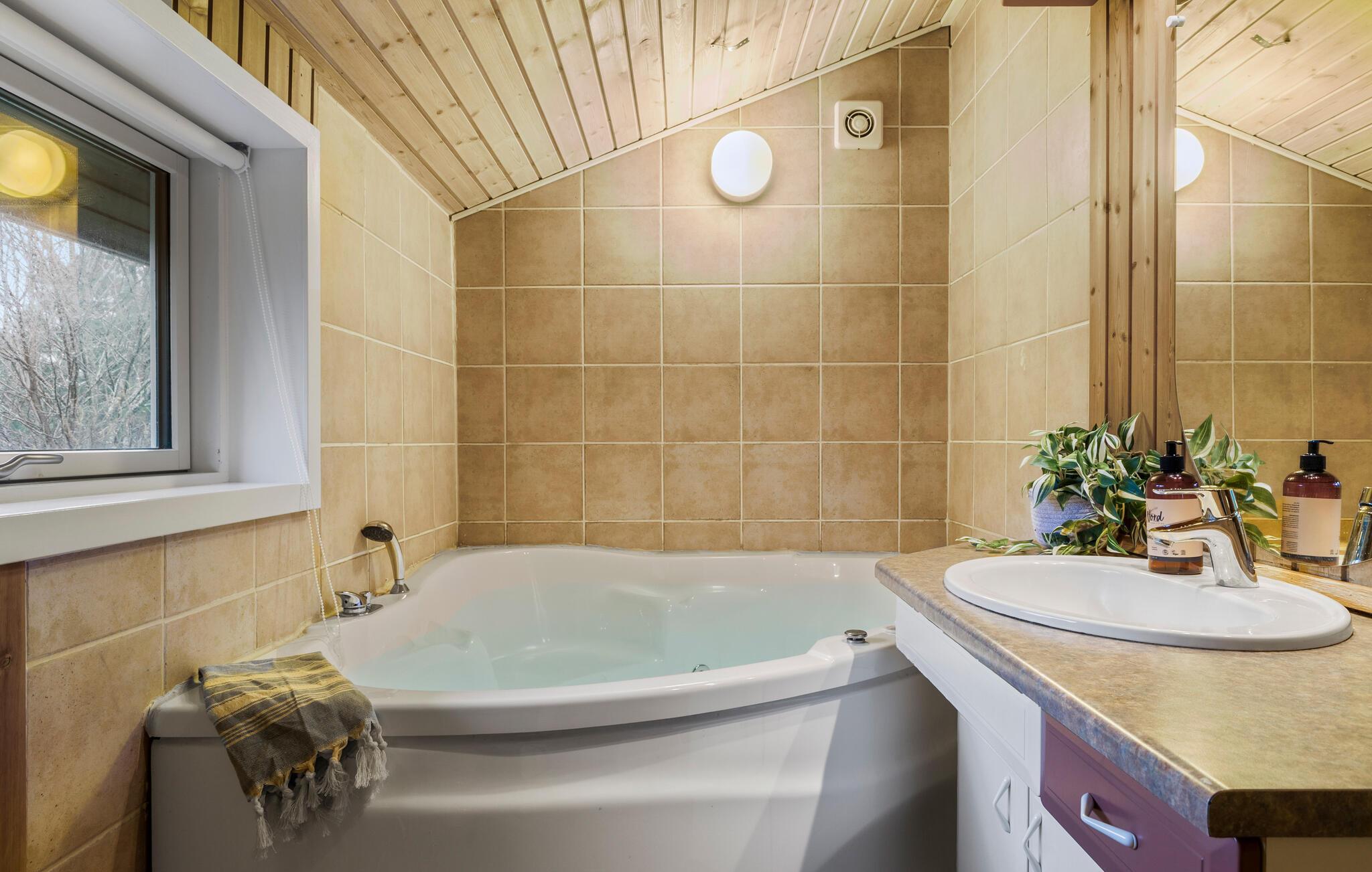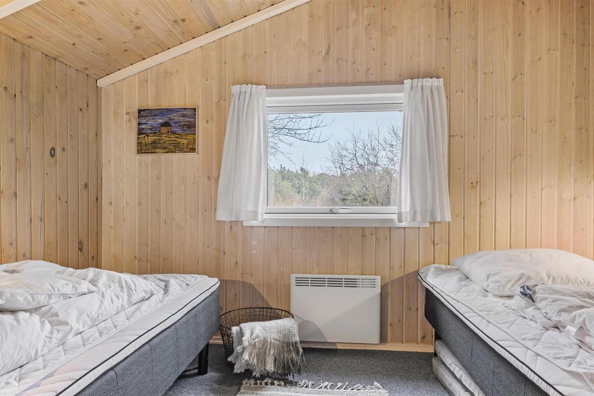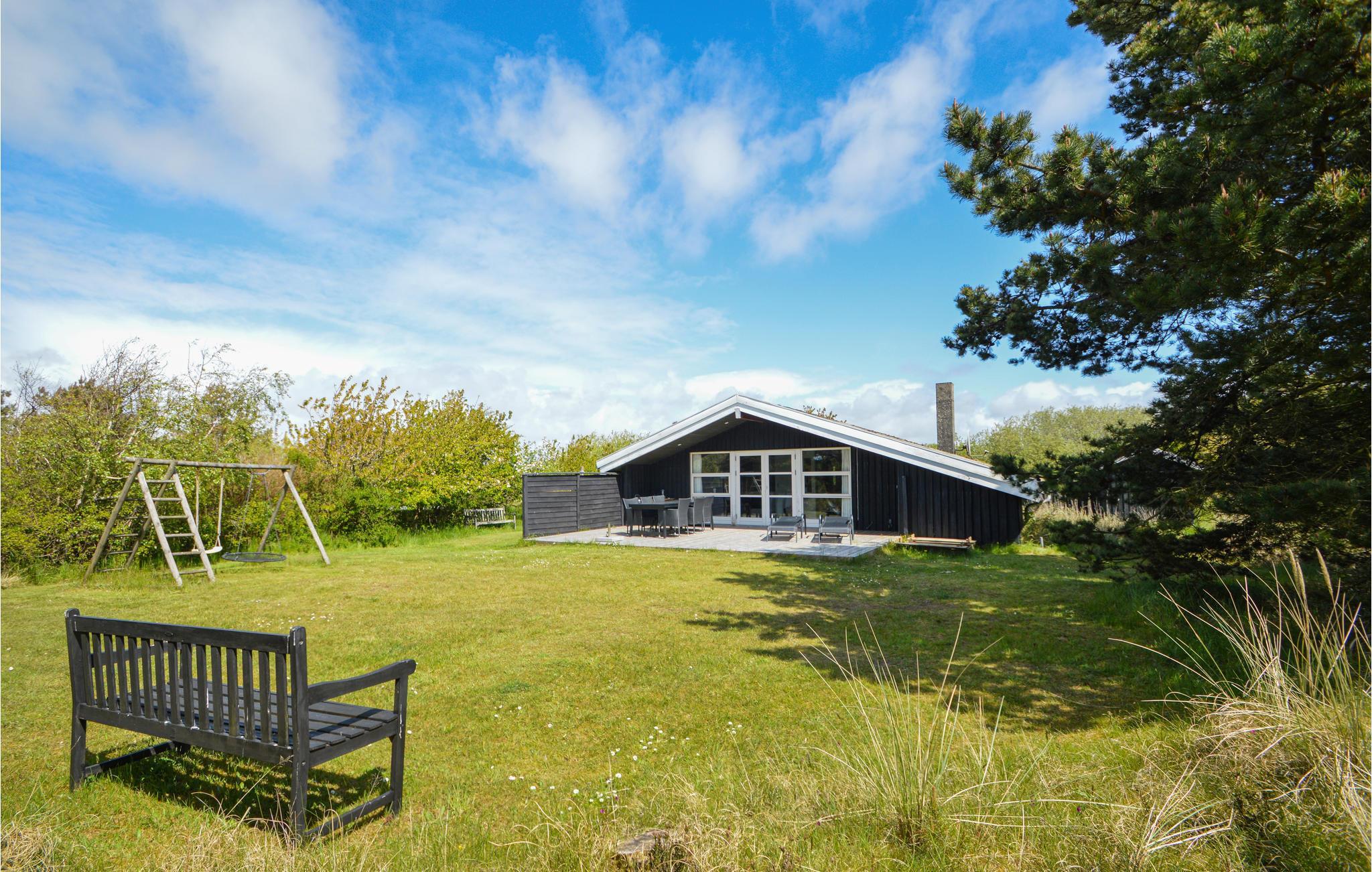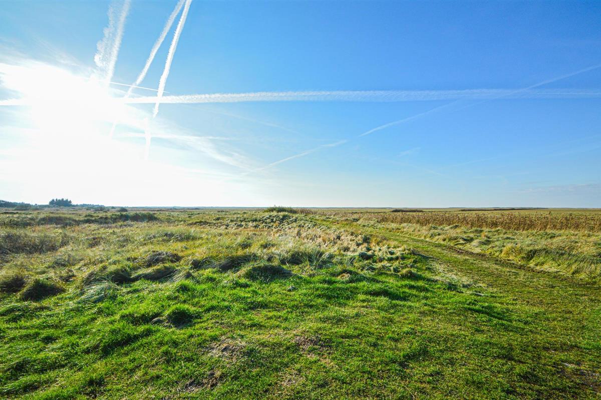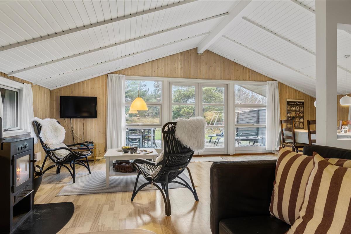 en de mooie, moderne meubels nodigen uit tot gezellige uren voor de open haard. Vanuit de woonkamer heeft u ook toegang tot het mooie westelijke terras. De huizen in Bolilmark hebben grasveen op het dak, zodat ze bijna deel uitmaken van de prachtige natuur van het gebied. U kunt lopen naar een fietspad dat leidt naar Lakolk, het breedste zandstrand van Noord-Europa.