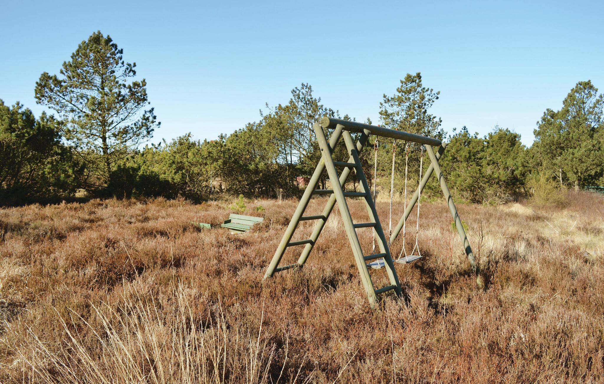 Buiten vind je een klein terras met tuinmeubilair, ideaal voor een ontspannen ontbijt of een avond bij zonsondergang. Kinderen kunnen zich uitleven op de schommel of in de zandbak in de tuin terwijl je geniet van het uitzicht op de omliggende natuur. Of speel samen een partijtje badminton.
