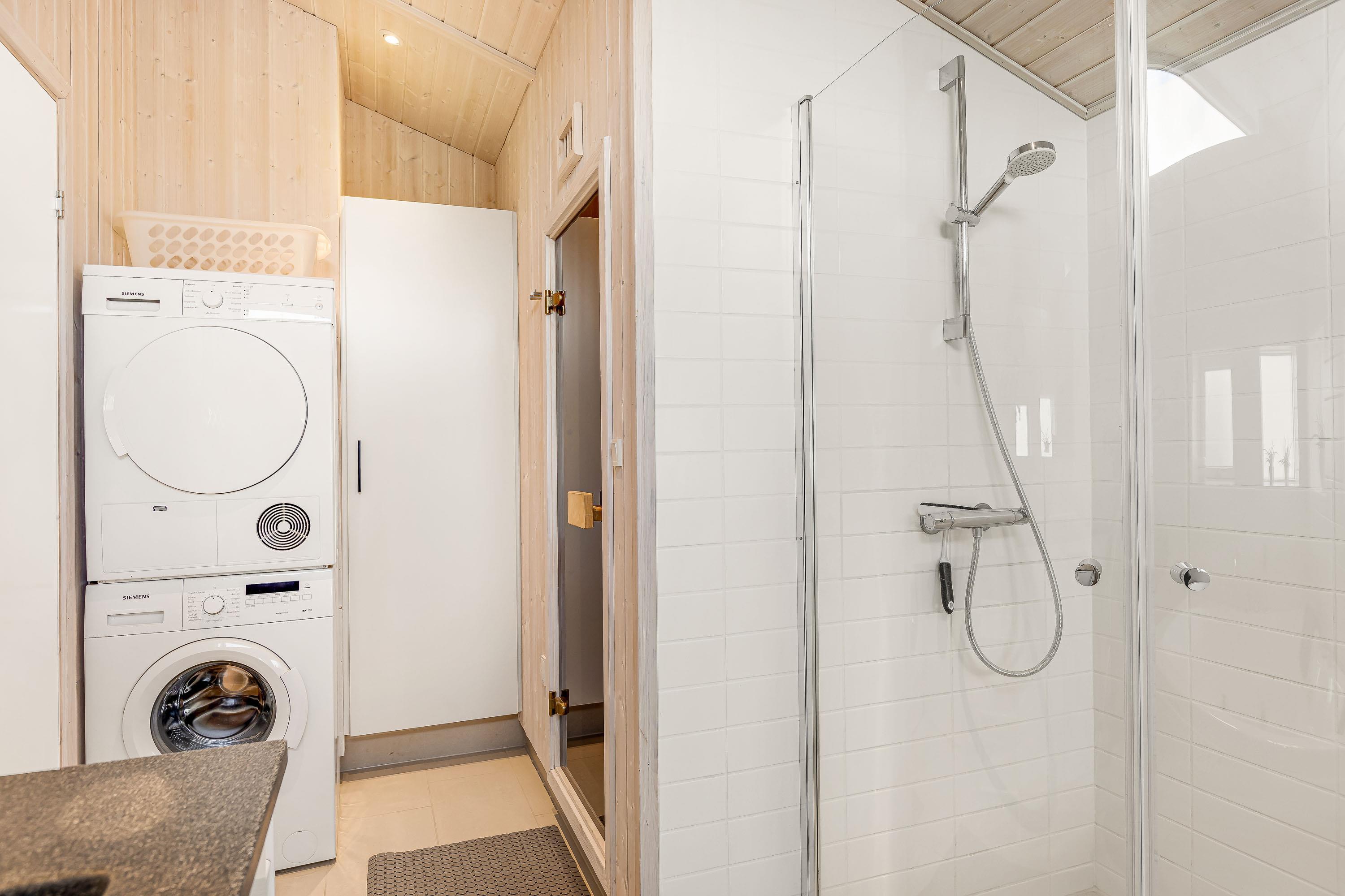 The bright bathroom with whirlpool and sauna offers further relaxation - perfect for warming up and unwinding after a blustery day at Lakolk beach. There's also a guest WC with underfloor heating.