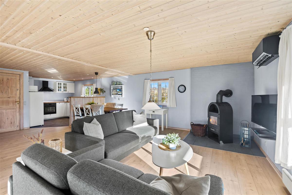 The welcoming interior, decorated with attention to detail, creates a truly cosy atmosphere. The holiday home accommodates up to 8 people, with 3 bedrooms featuring 3 double beds and one cabin bed. The open-plan living room shares space with the kitchen and comfortable dining area. A wood-burning stove provides warmth and a natural ambiance to the seating area.