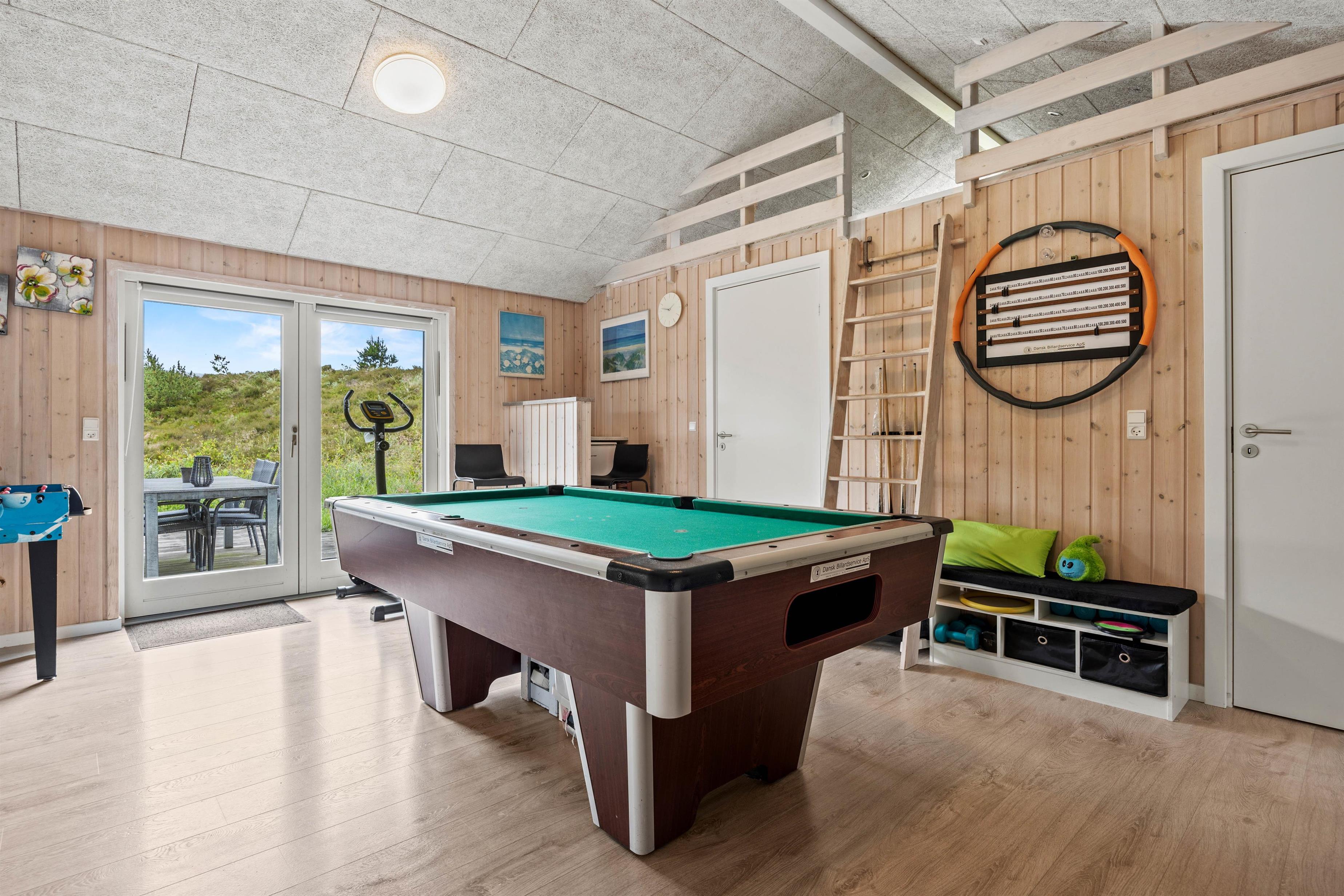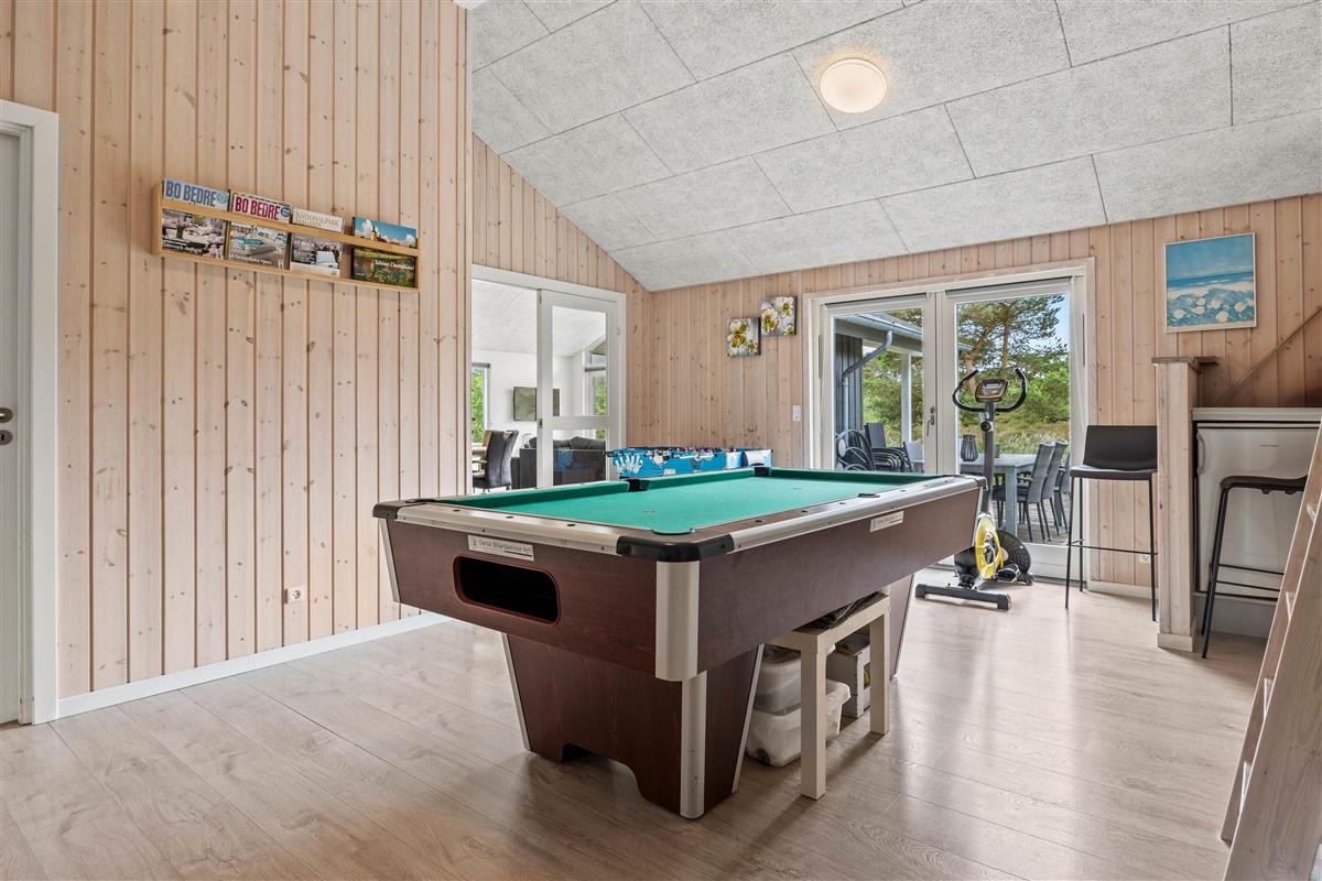 The wood-burning stove adds extra cosiness, while the heat pump provides comfortable climate control at your preferred temperature. The activity area, featuring a PlayStation, pool table, and table football, provides perfect entertainment during unsettled weather - ideal for friendly competitions and family games. There's a PlayStation for indoor entertainment, and even a climbing frame in the garden for the little ones.