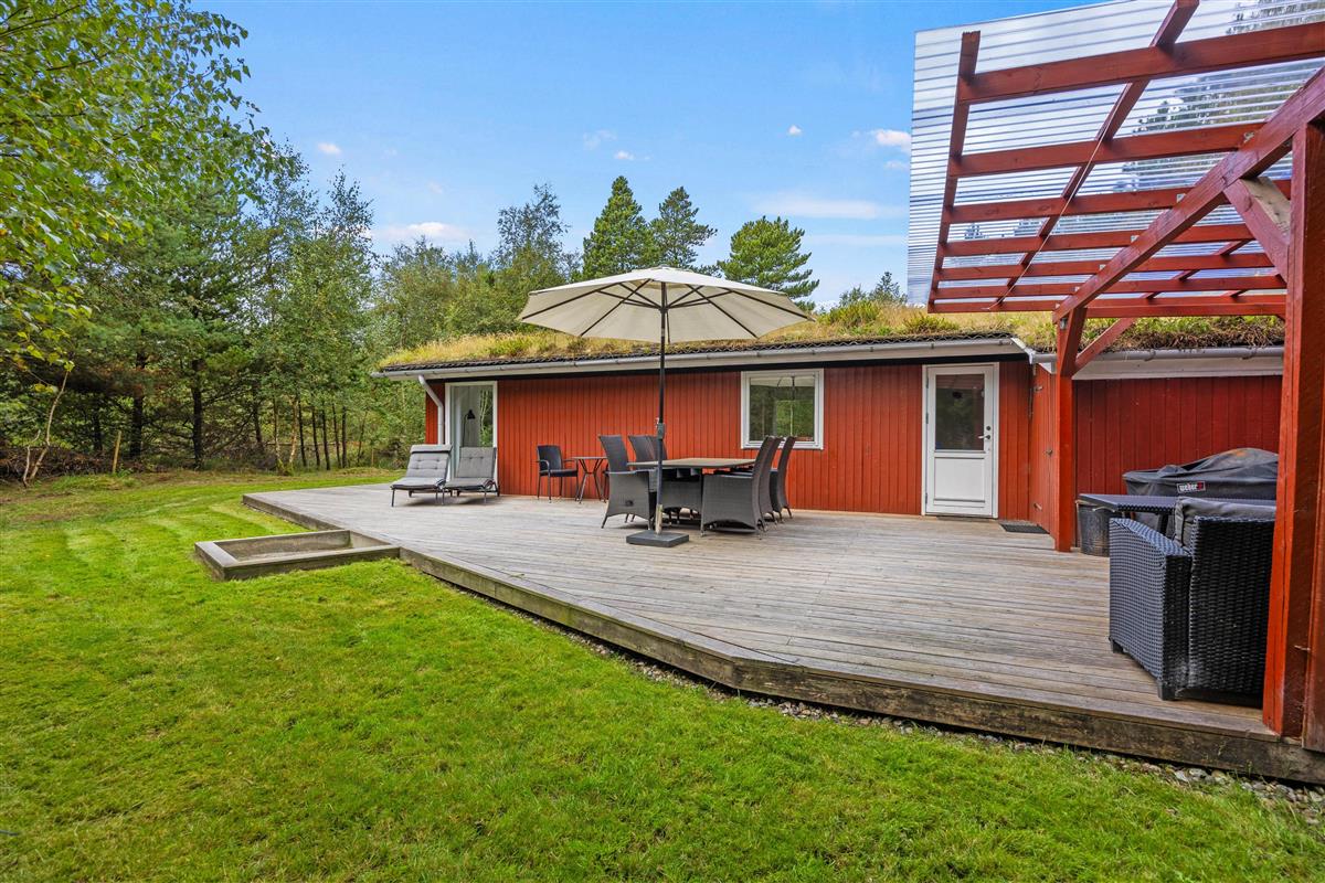 The holiday home at Blåbærvej 30 impresses with its idyllic location, blending seamlessly into its surroundings thanks to its green roof. With 82 square metres of living space, it offers ample room for restful days. The open-plan living room features a cosy wood-burning stove – perfect for snug evenings after a day in the fresh air.